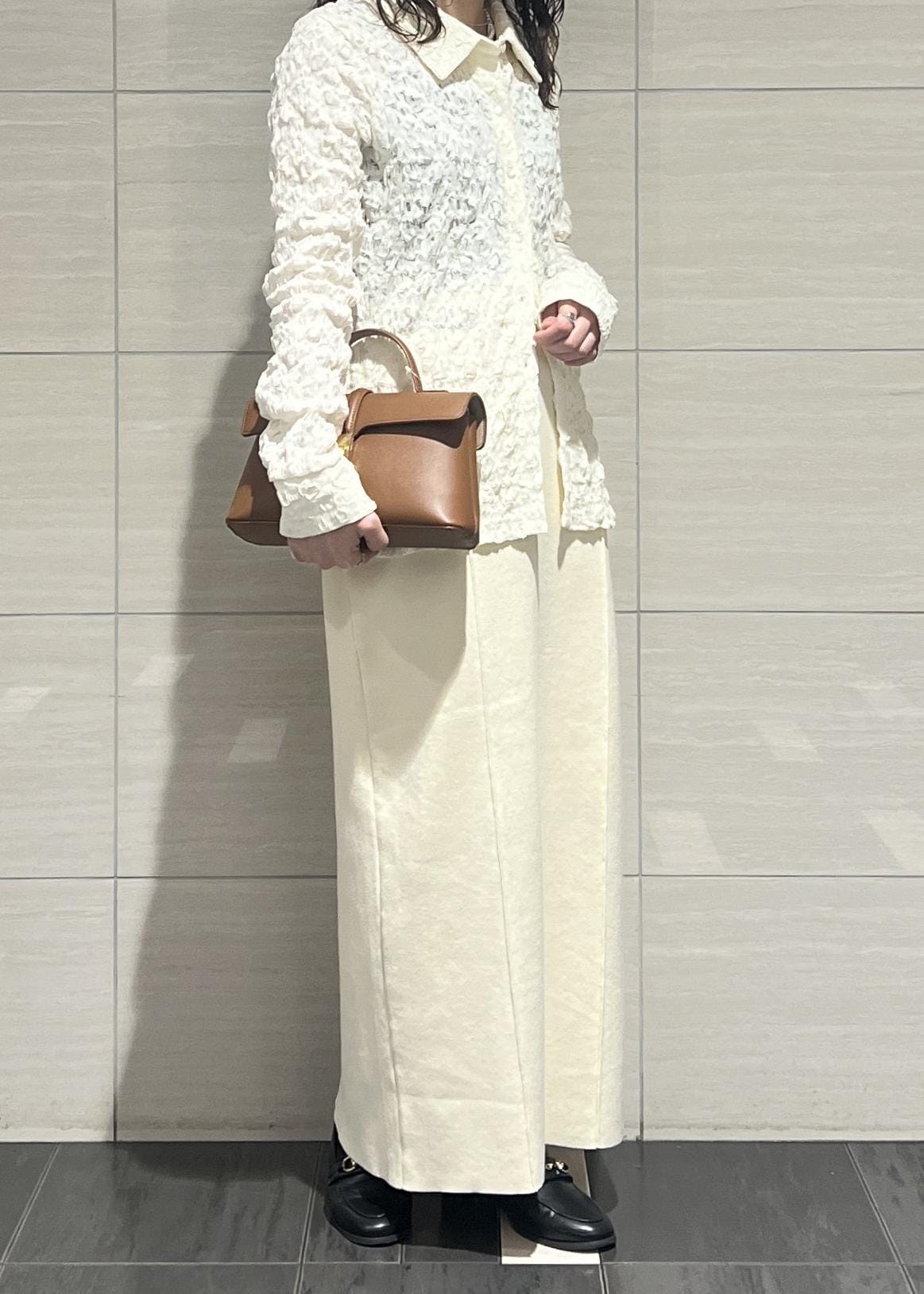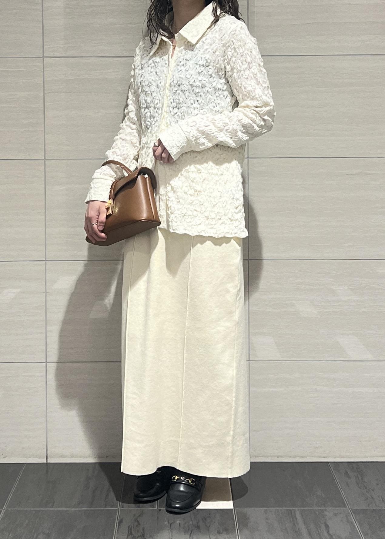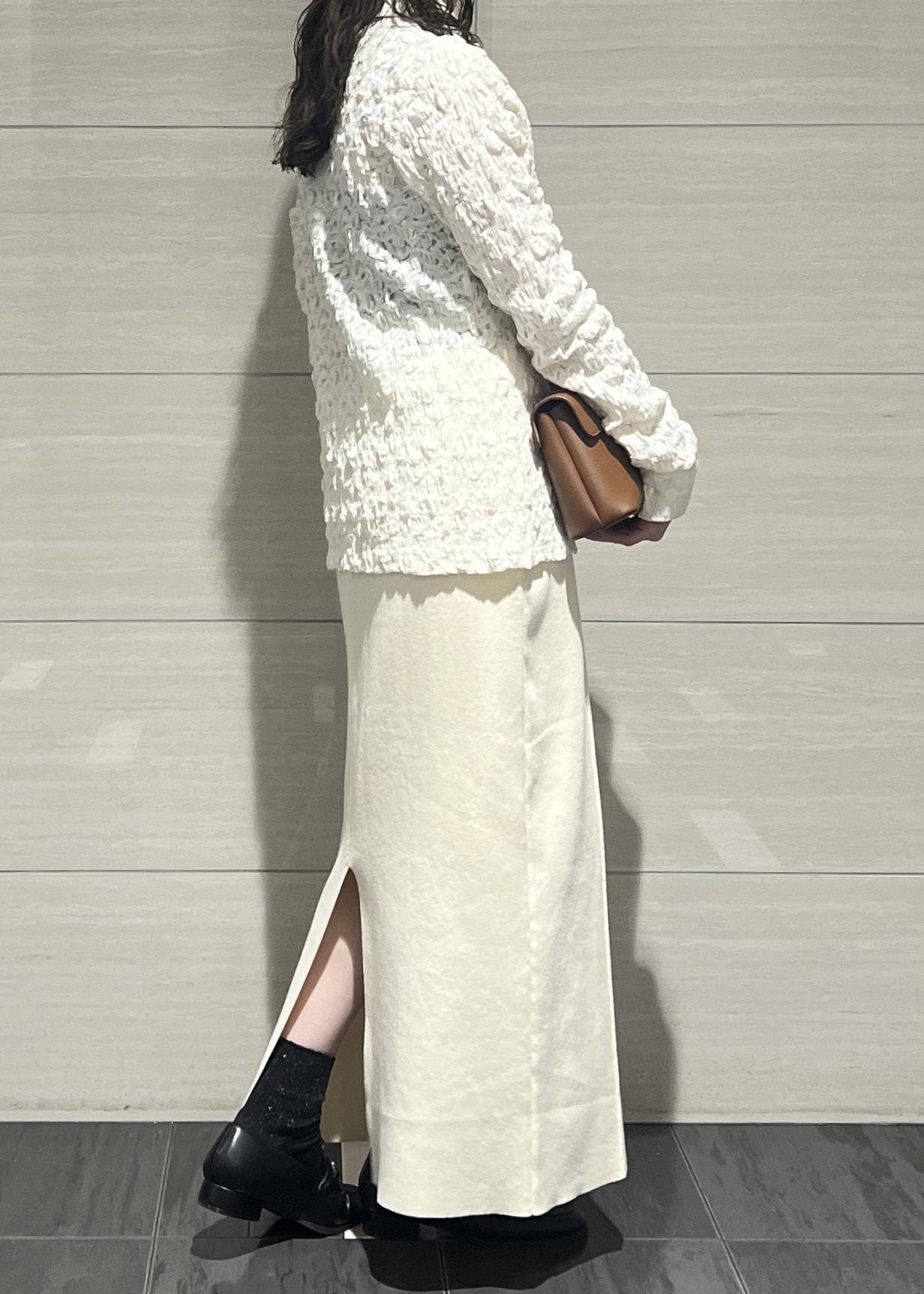 VISピンタックデザインニットスカートオフホワイト / F¥5,929レビュー152cmで足首が隠れる丈感。後ろにスリットが入っているので歩きやすく、ニット素材で締め付け感がないので着心地が良いです。