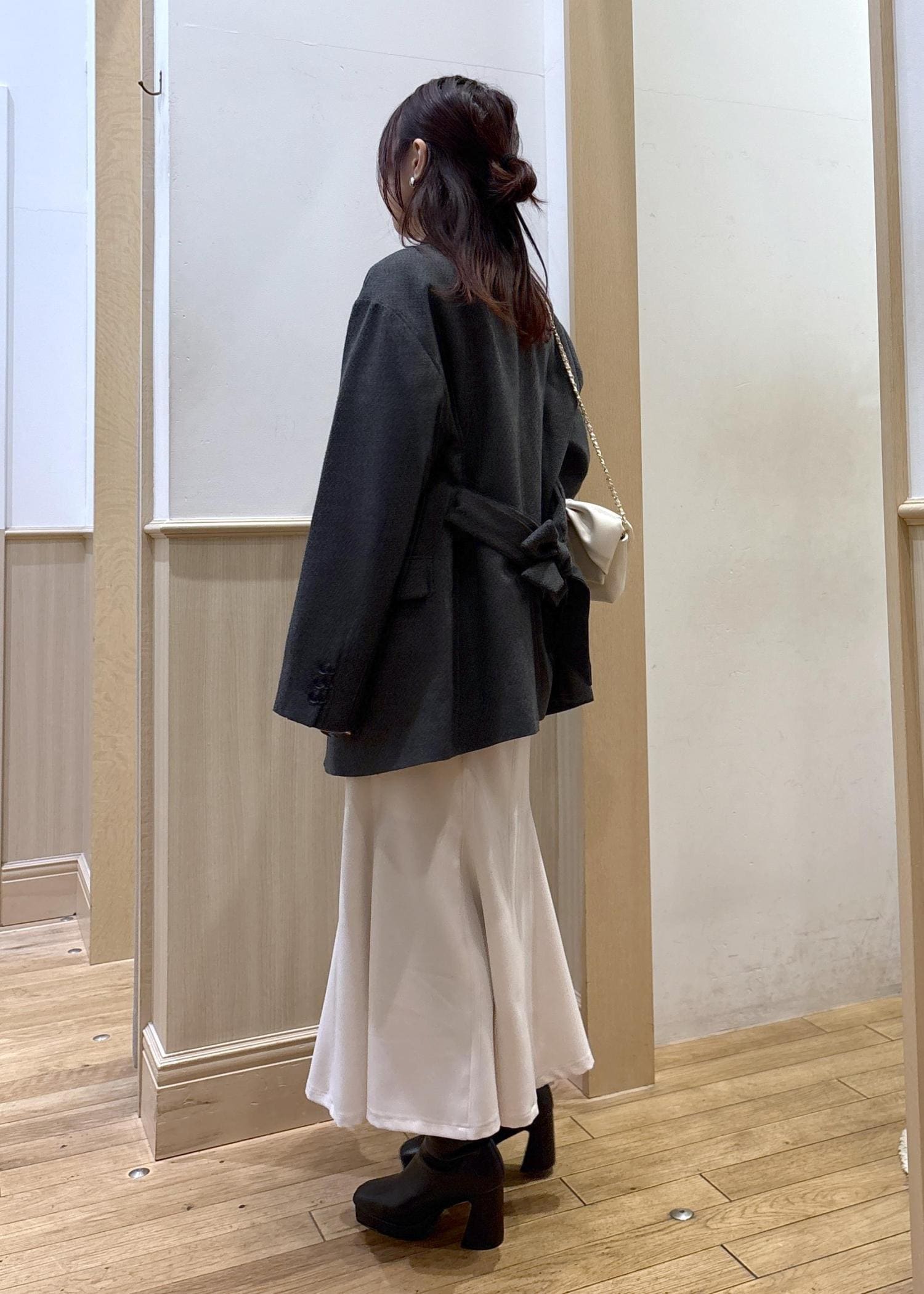 くるぶしくらいまでしっかり長さが欲しい時は、Mサイズでウエストを両ボタン詰めると、トップスをインして少し大きいくらいで、シルエットは綺麗なので、着たいバランスによってサイズ感を選びやすいスカートです。 -
