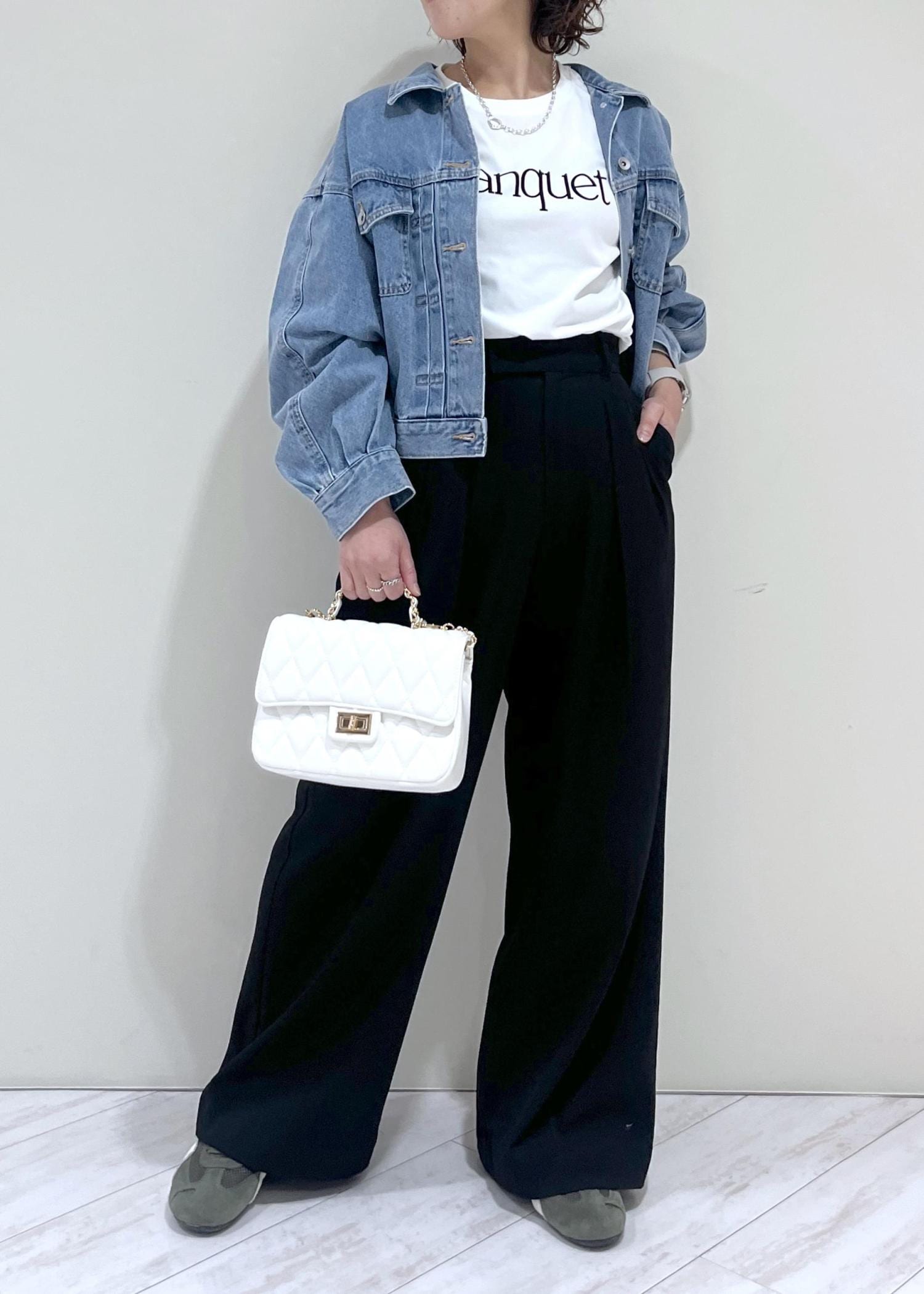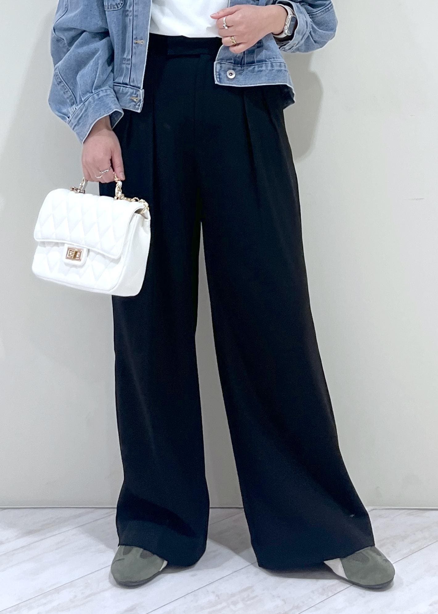 2タック入りのワイドパンツでセンタープレスも効いて脚をきれいに見せてくれます。