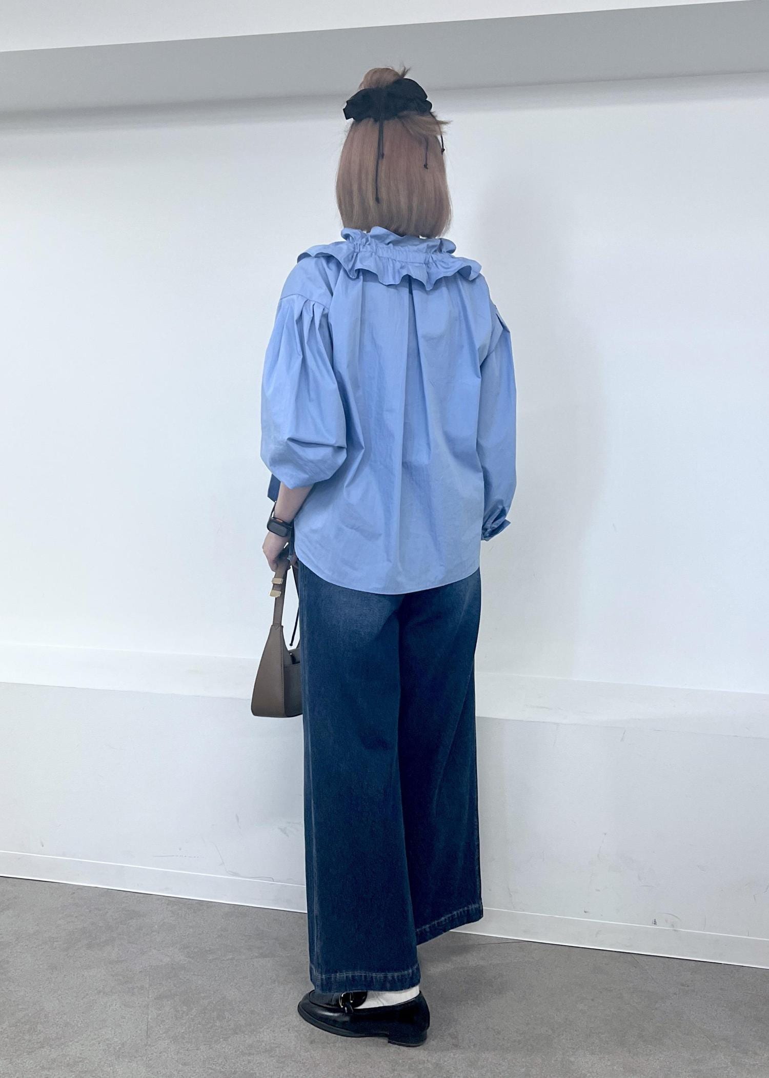 骨格ナチュラルはリボンを留めてしまうだと肩のボリューム感が大変なことになってしまう為首周りは最大限に開けて着用しております。 -