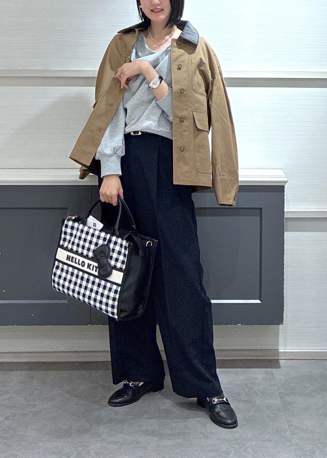 インアイテムにドレープトップスを選び首元はヘルシーに、雑貨は乙女なハローキティのバッグでカジュアル過ぎないようにしました♡