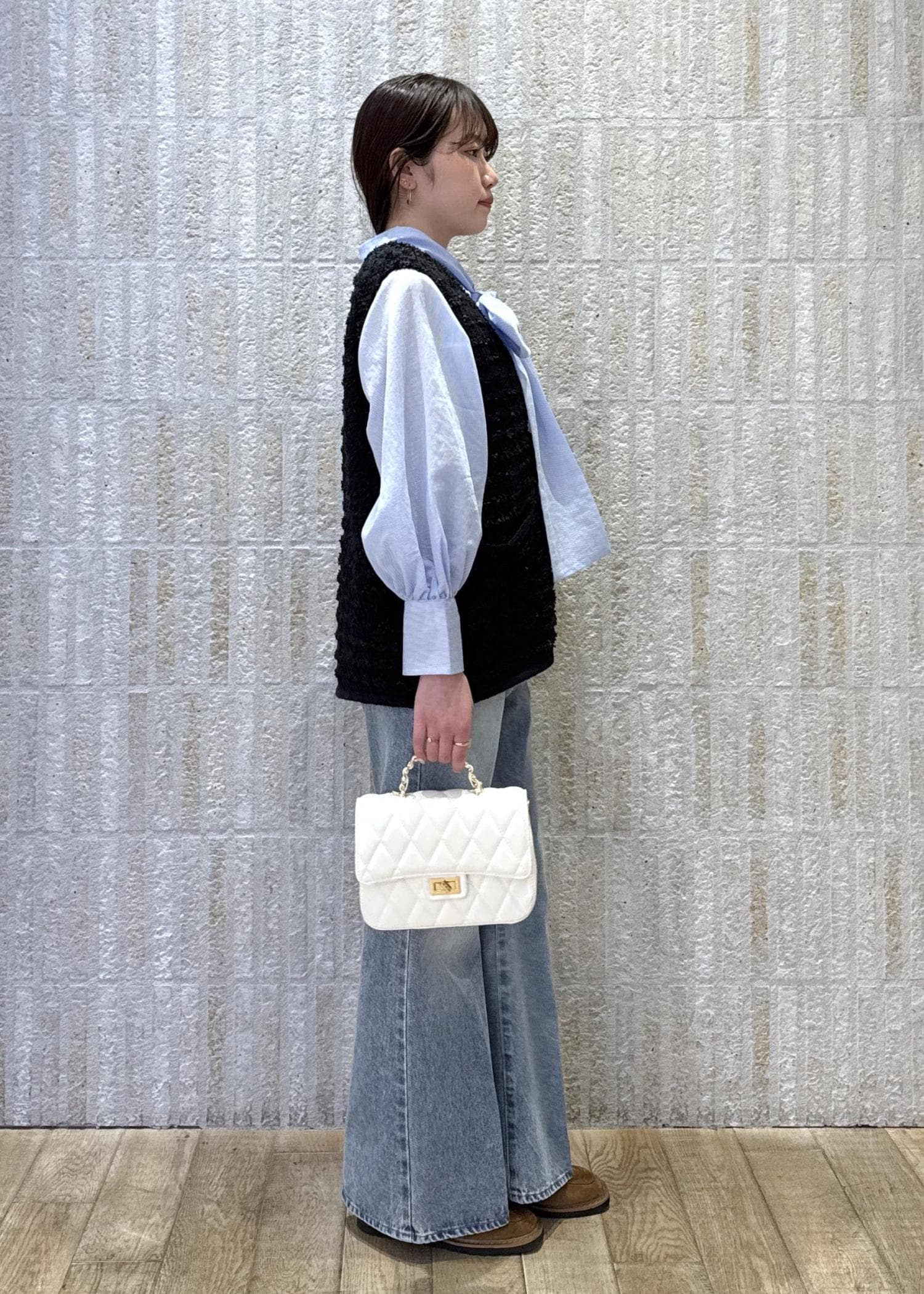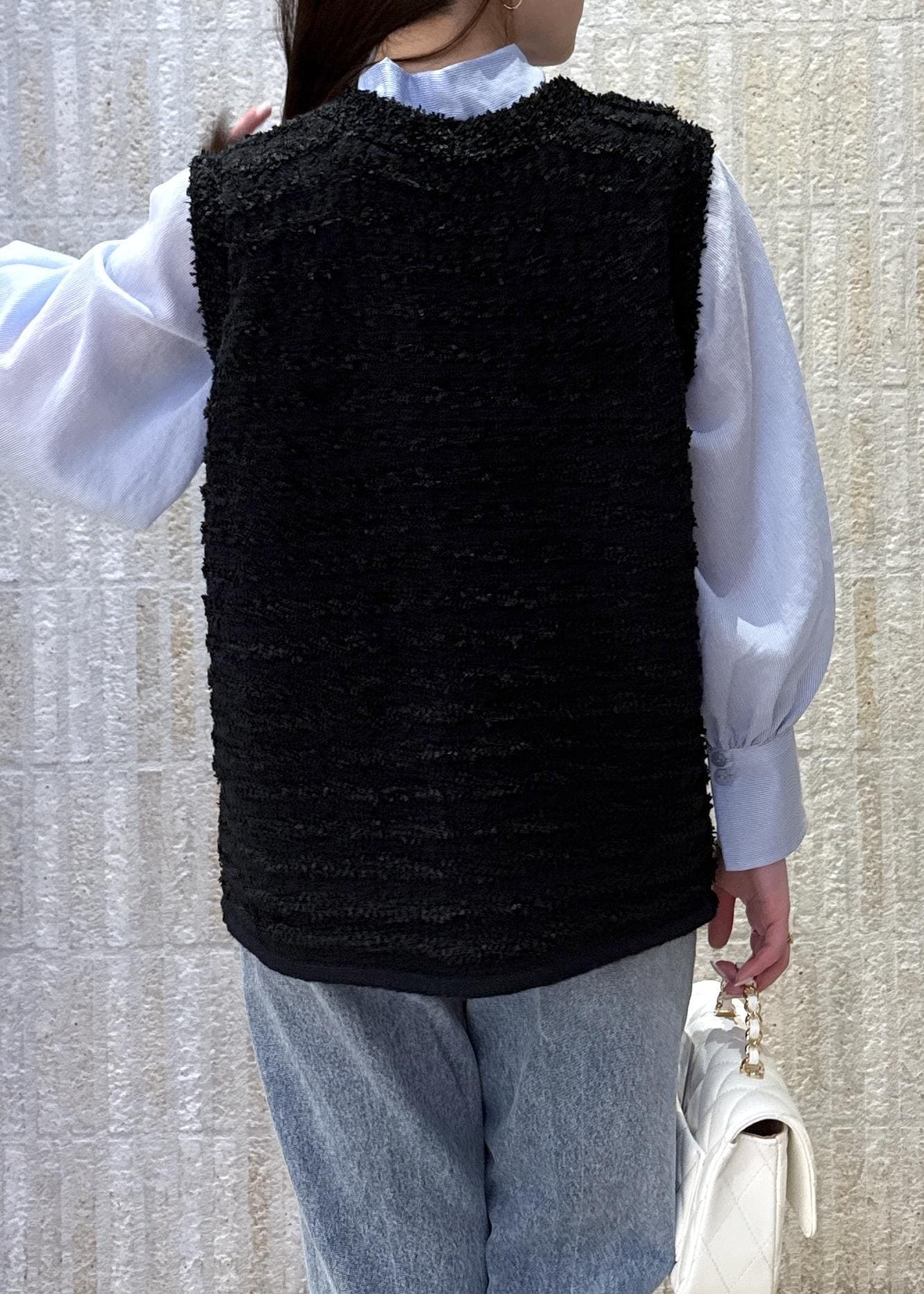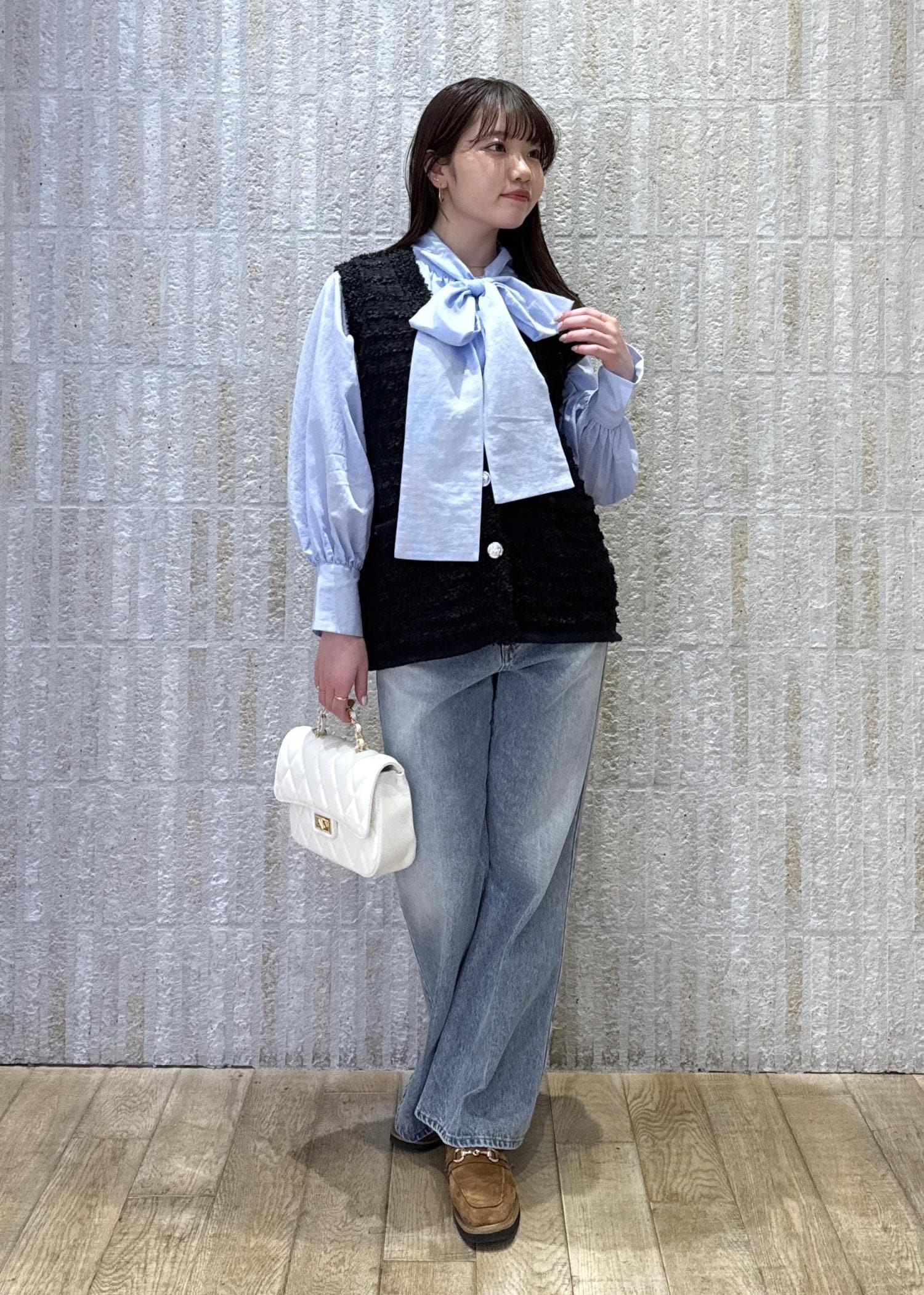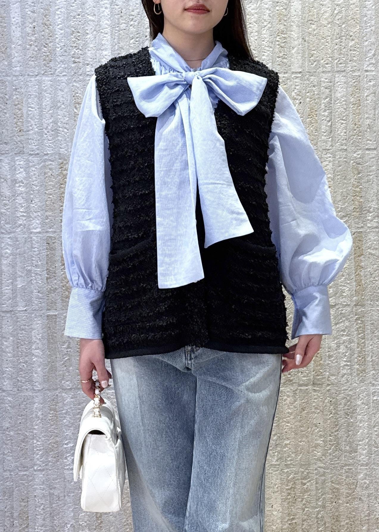 目を惹くボウタイリボンに、春らしいツイードベストを合わせデニムパンツスタイルで大人カジュアルなスタイルに◎