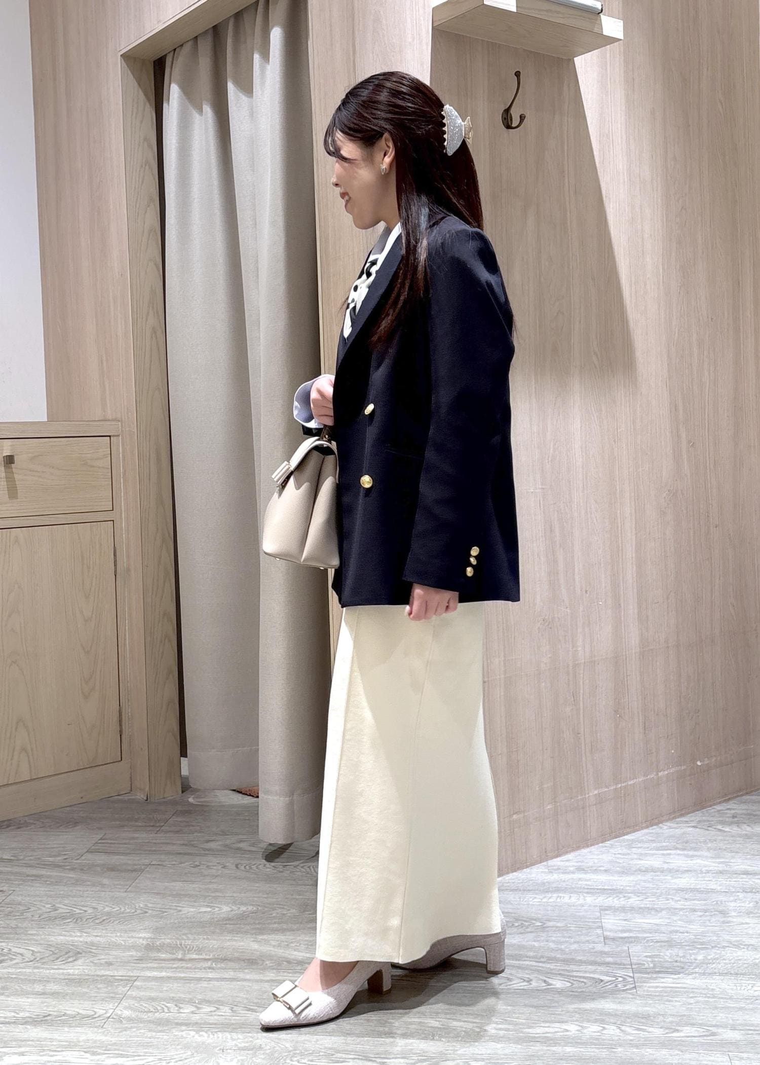 VIS【美easy】コンフォート金ボタンジャケット/イージーケア・UVケア・セットアップ対応ネイビー / S¥8,899レビュー通年使える軽い素材です。金ボタンがアクセントになっているのと裏地のストライプ柄が印象的な一着です。丈はお尻が隠れるくらいの長さでお腹周りもカバーできますよ。