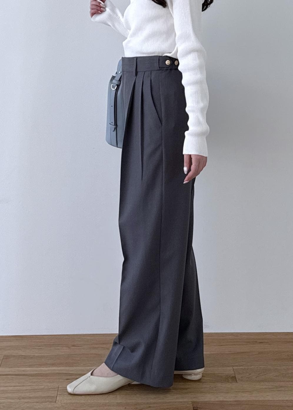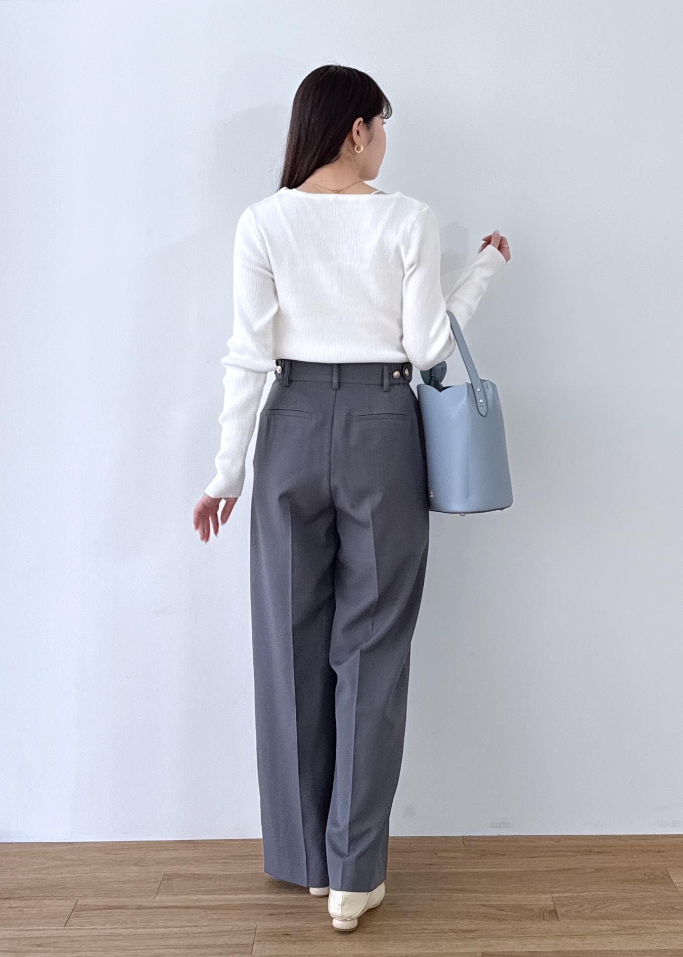 丈感は、くるぶし下で長め。ウエストはサイドのボタンで調節すれば丁度良い印象でした!