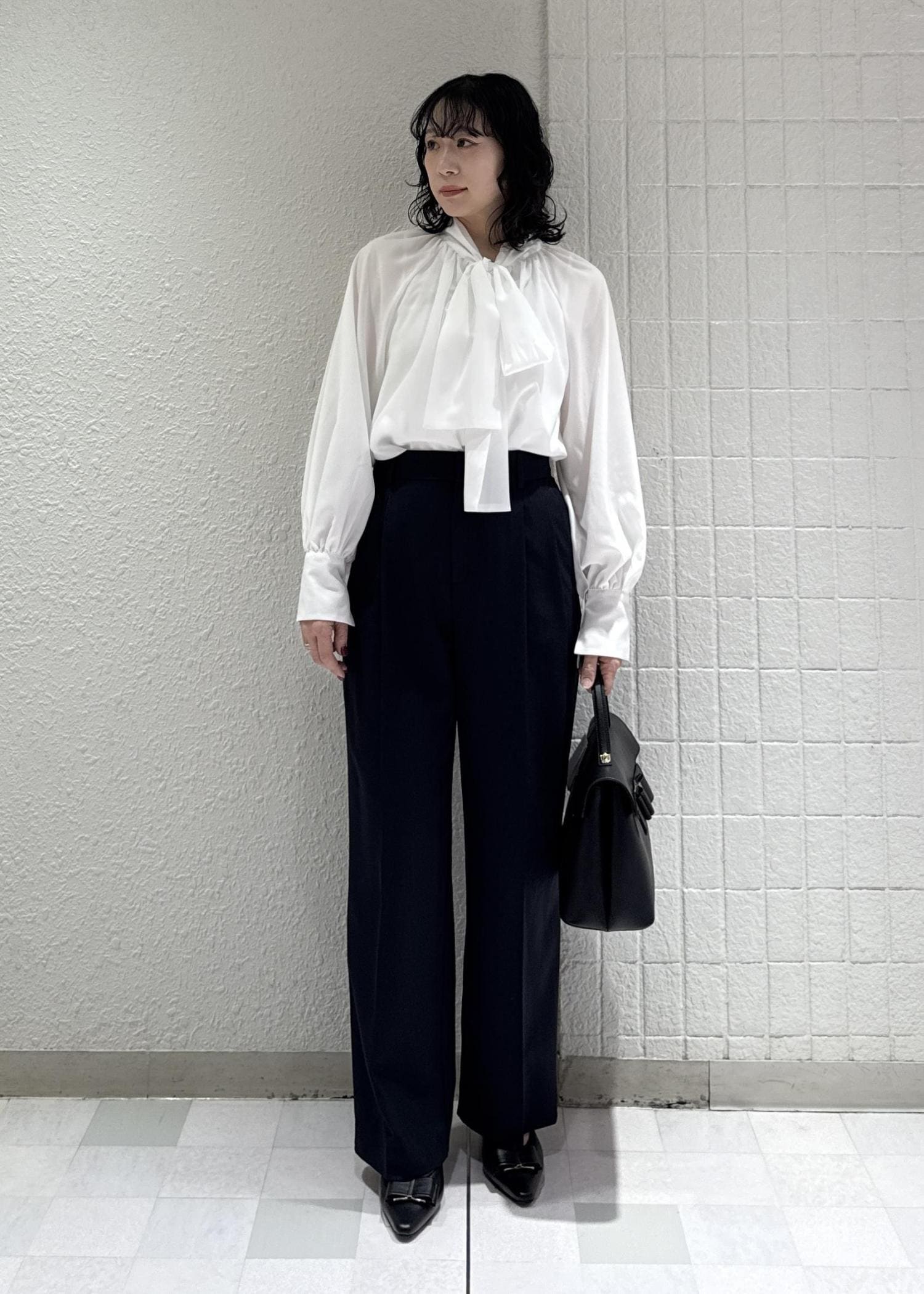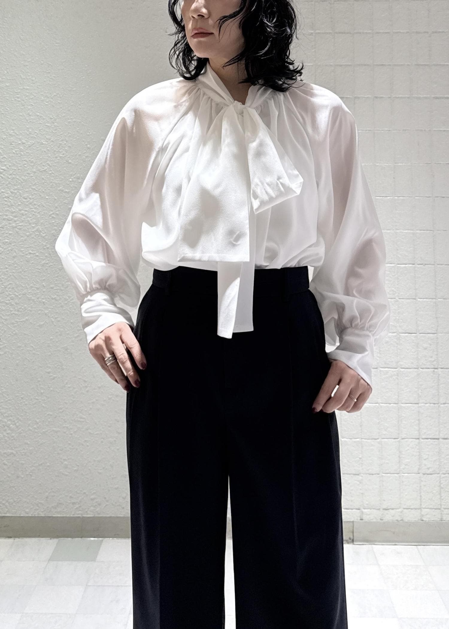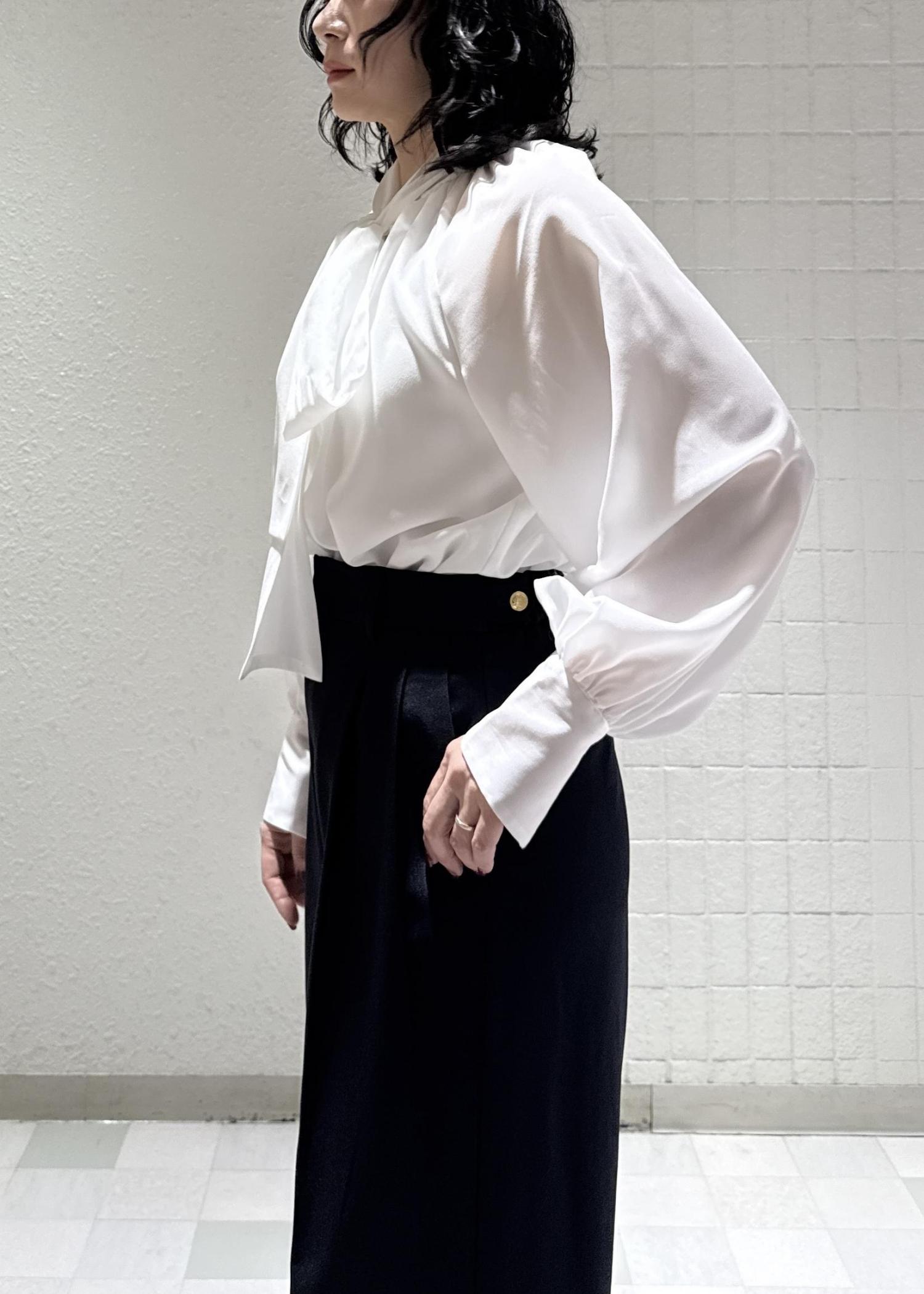 フェミニンにも、かっこよくも決まるボウタイブラウスは