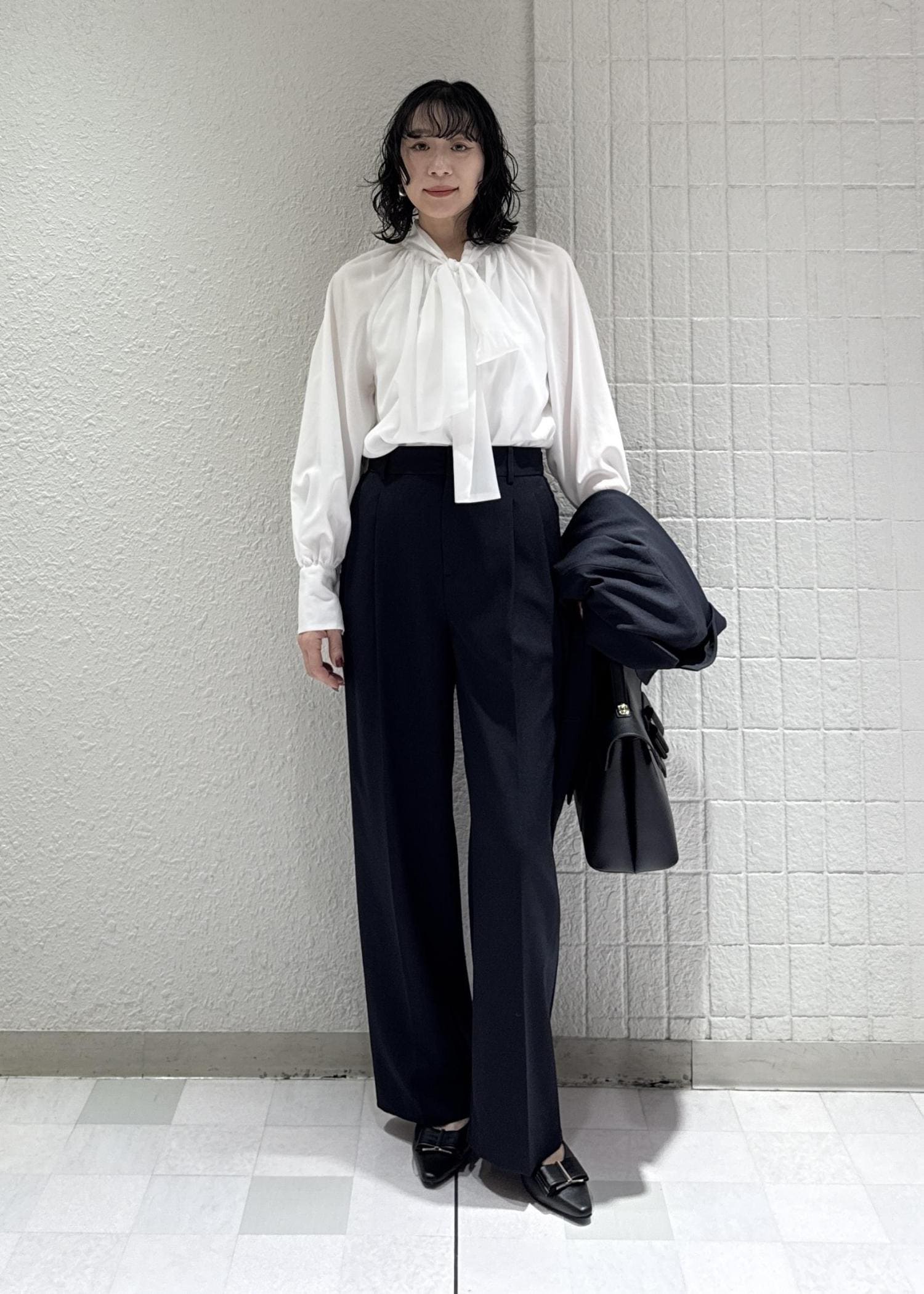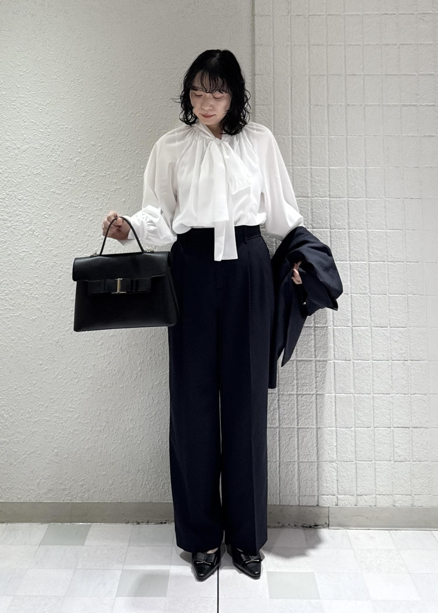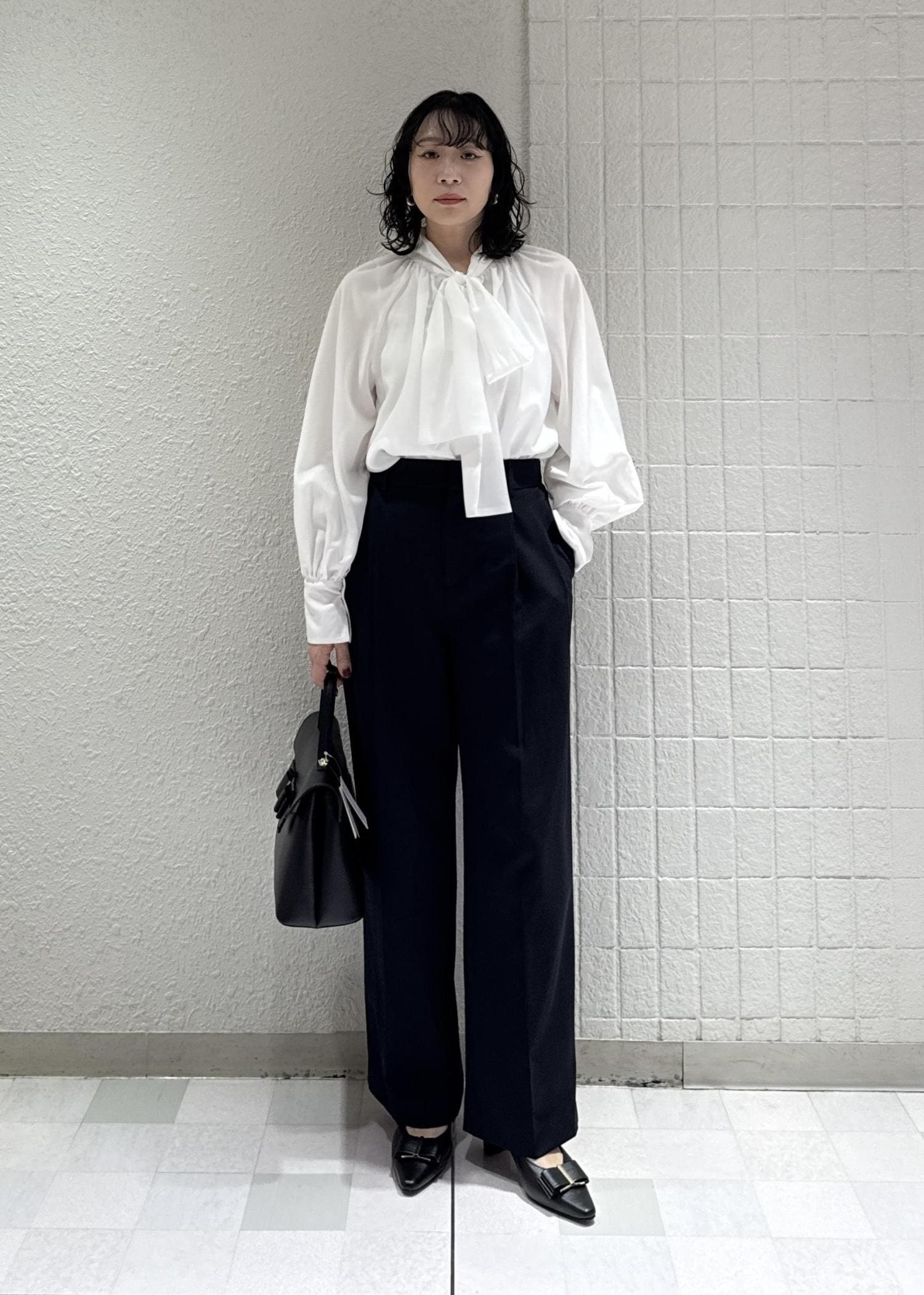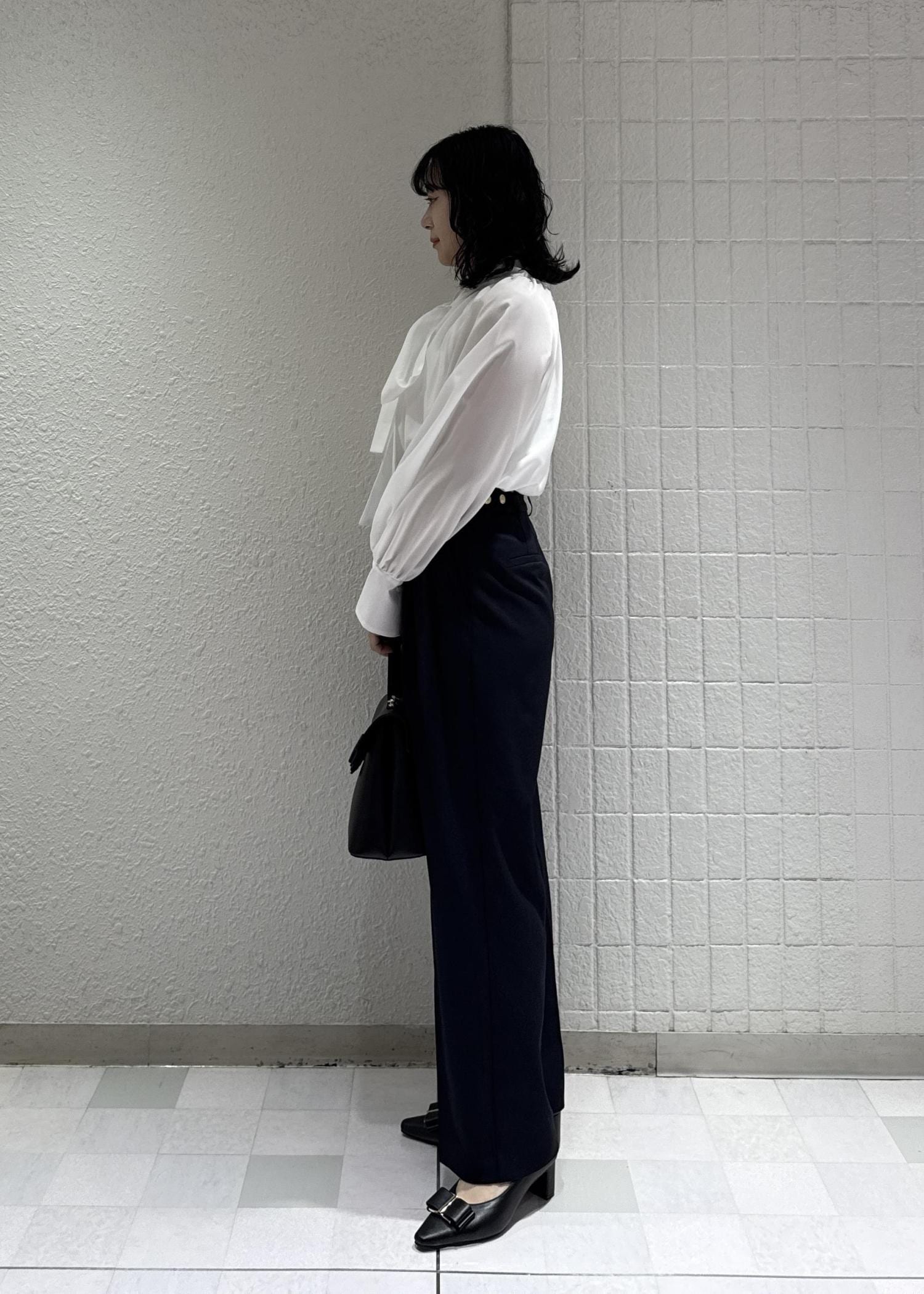 フェミニンにも、かっこよくも決まるボウタイブラウスは