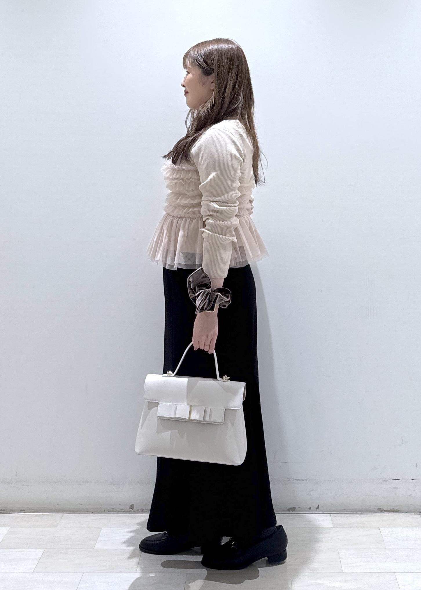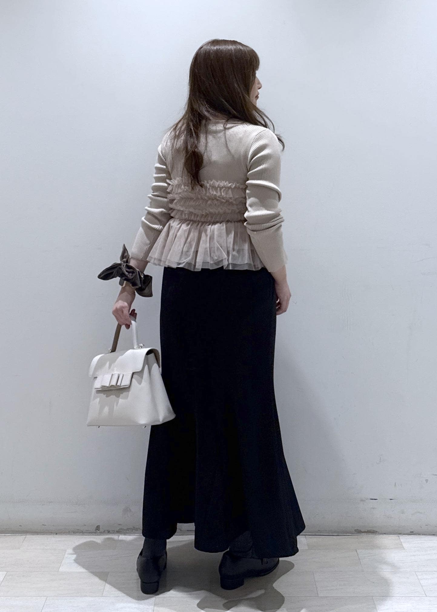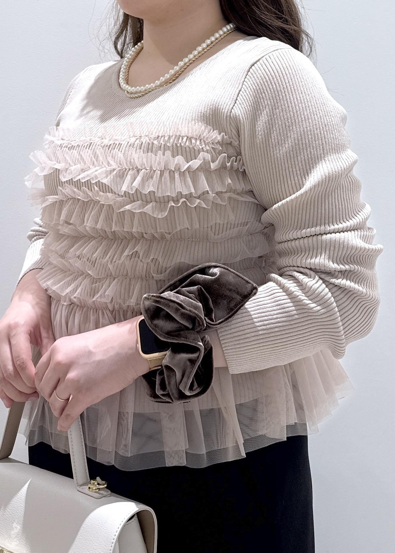 VISチュールドッキングニット/イージーケアベージュ / F¥6,589レビュー胸元にチュール素材のビスチェがドッキングで繋がっているので、春らしいふわふわ感がたまらなく可愛いです!柔らかい生地にチクチク感なども一切ないので、肌に敏感な私でも着れました。157cmでインしなくても腰あたりぐらいの着丈なので、アウトな状態でも着れるのが嬉しかったです◎