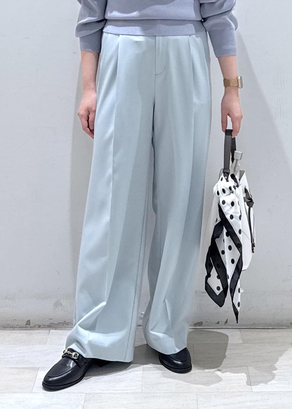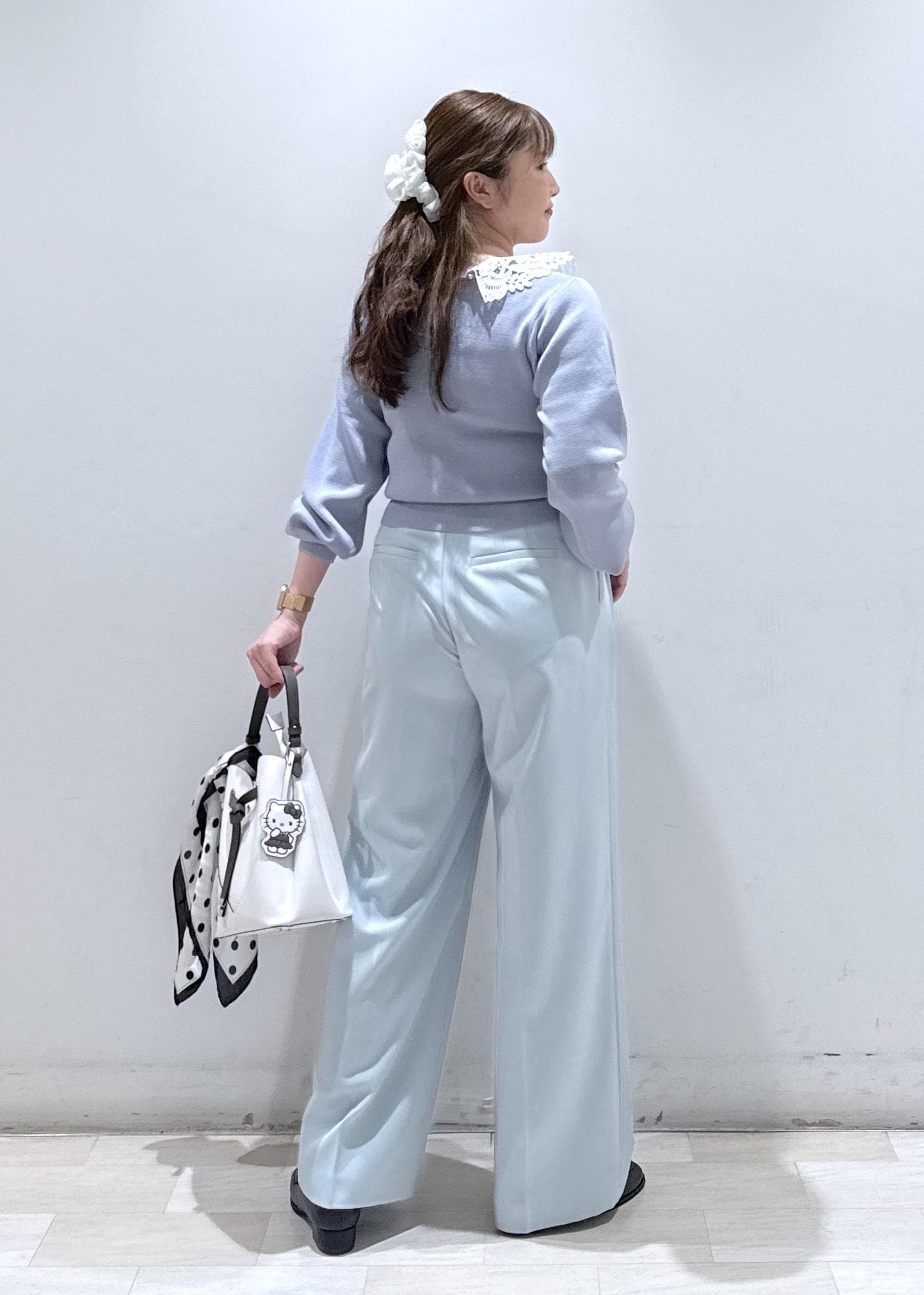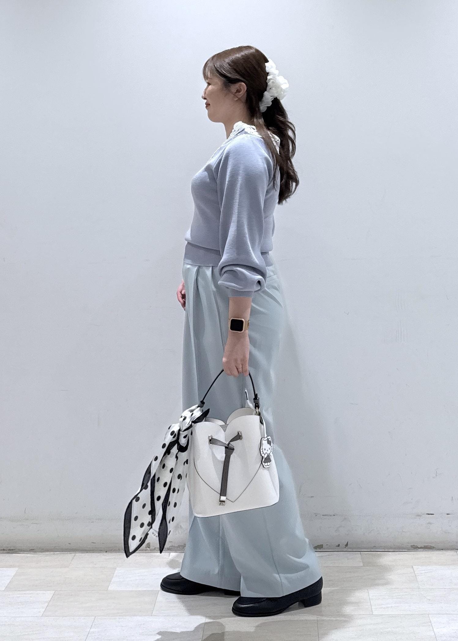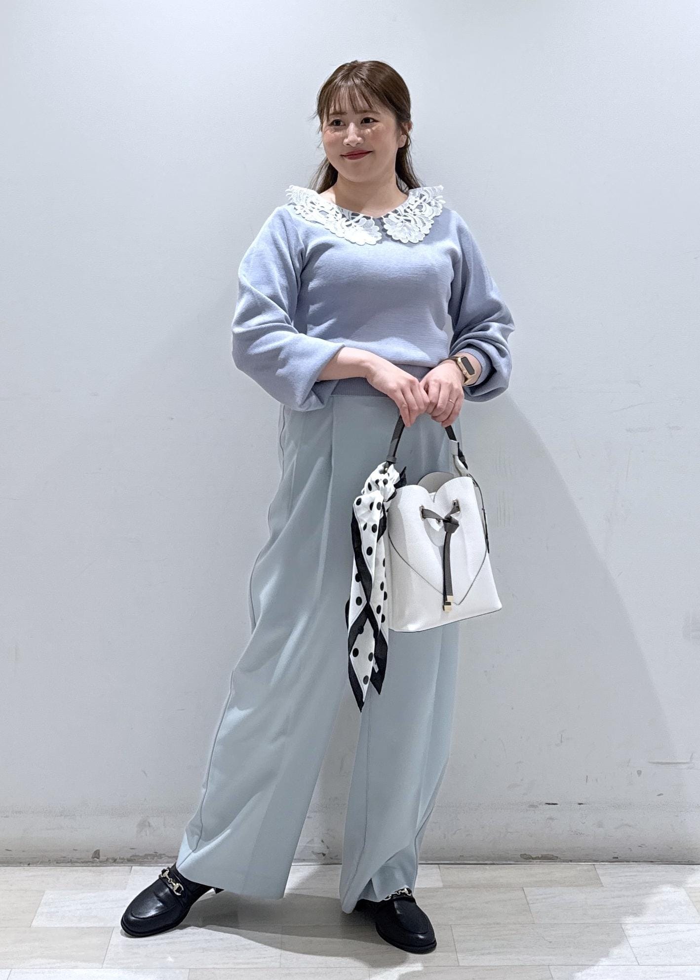 今回は新作で入荷しました、大きめな襟元が印象の可愛らしいニットを着てコーディネートを組んでみました♪ブルー×グリーンでカラーコーデにはなりますが、派手になりすぎず暗めの小物などで合わせると全体的に統一感出てオシャレに見えるのでオススメです。
