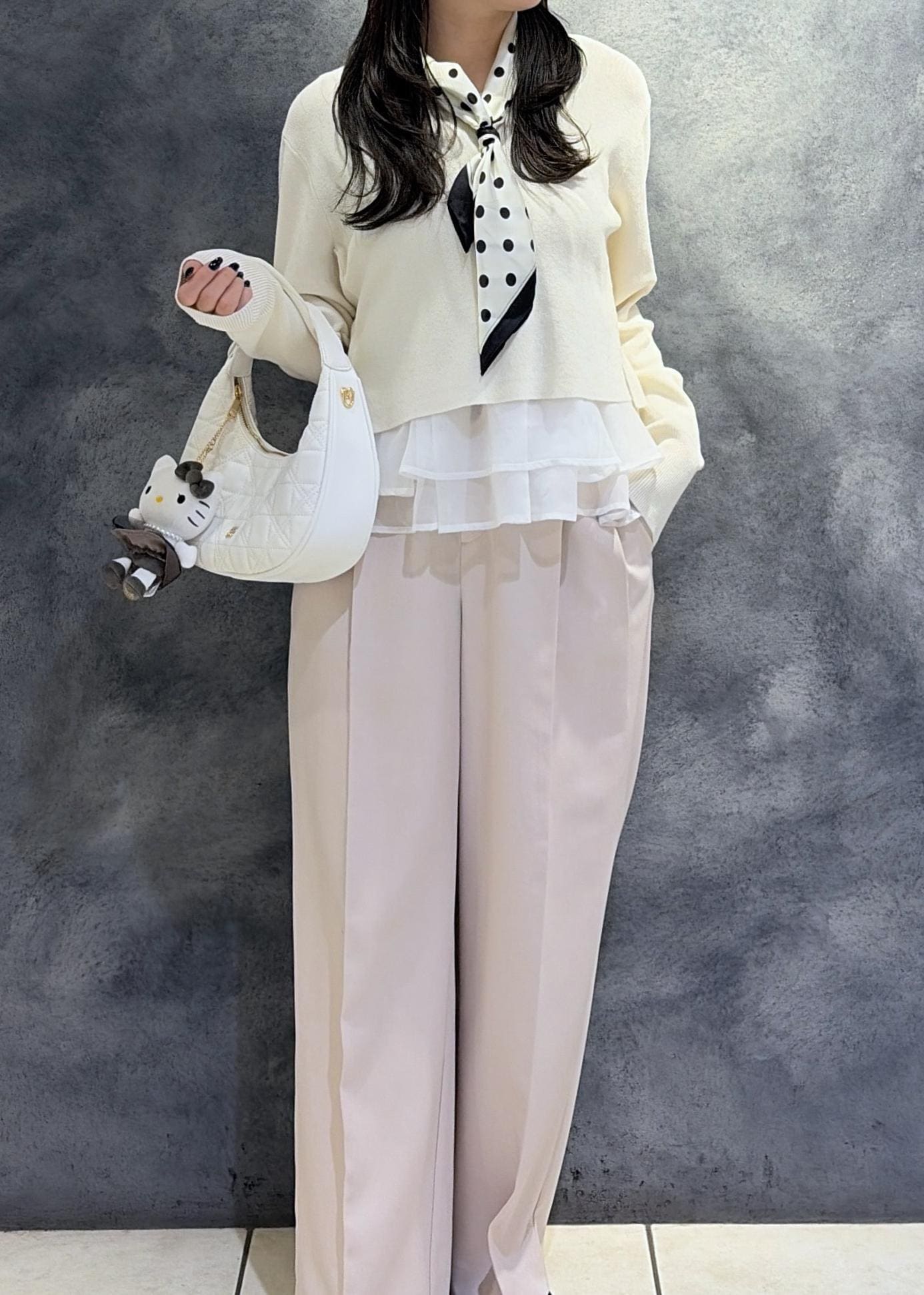 VISドット柄スカーフ 70×70cmホワイト系 / F¥2,189レビュー大きめのドットの柄なので一枚入れるだけでも華やかな印象に。モノトーンなのでカラーコーデにもおすすめです!