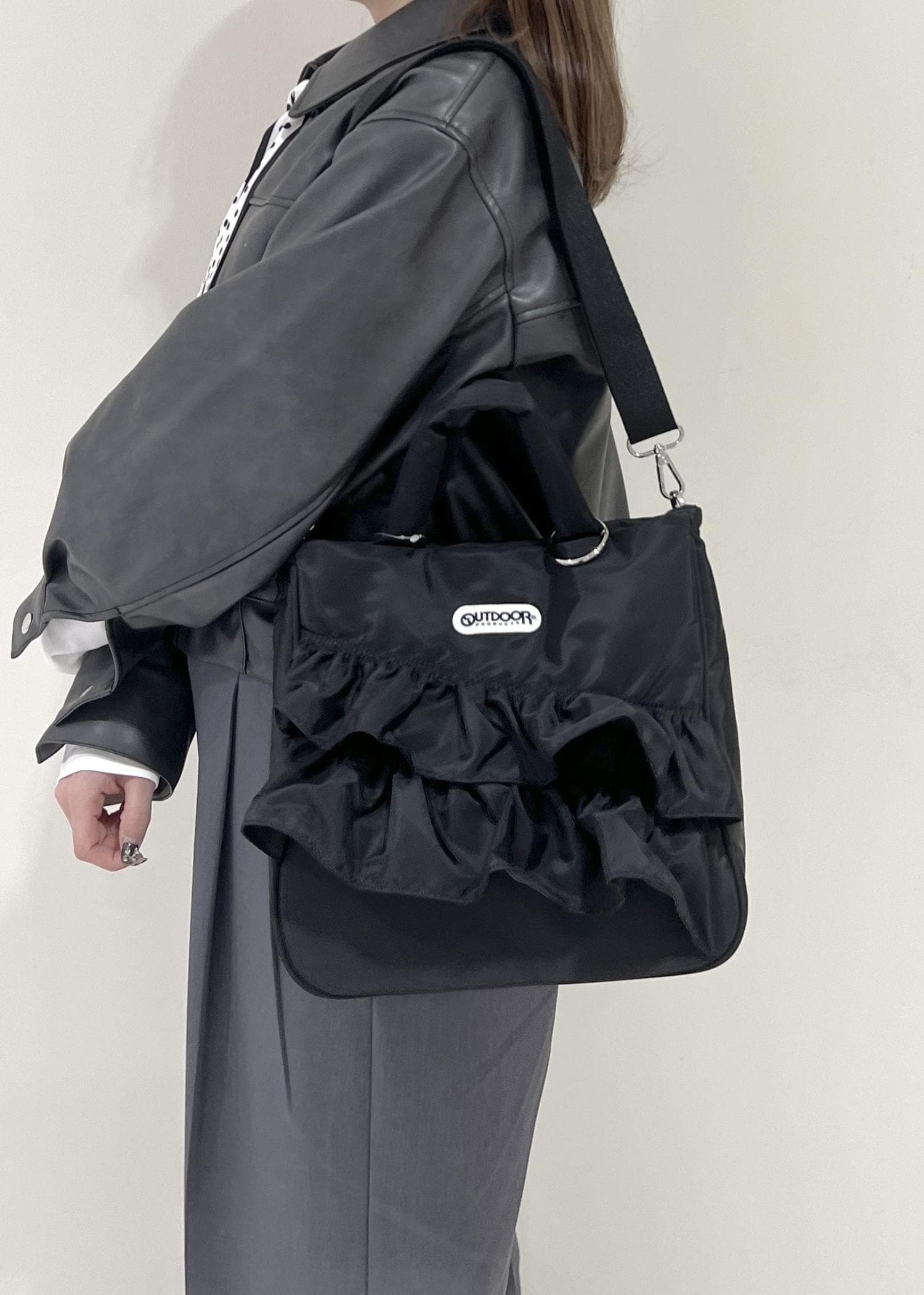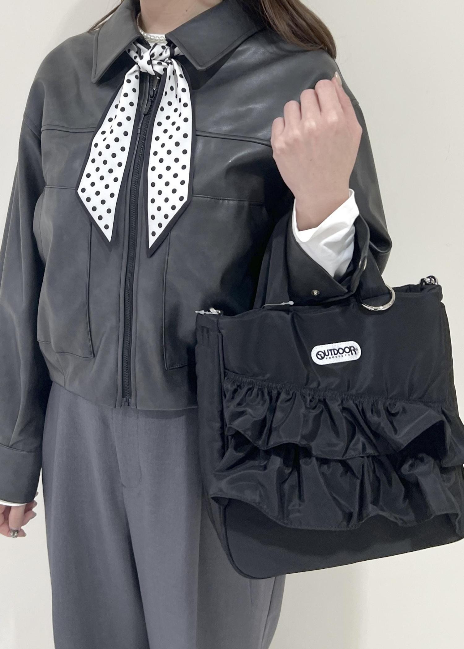 VIS【OUTDOOR PRODUCTS】VIS別注2WAYフリルトートバッグブラック / F¥8,580レビューハンドバッグとしてもショルダーバッグとしても使えます◎ 開閉部はマグネットボタン付きなので安心です!500mlペットボトルや長財布も入る大きさです♡