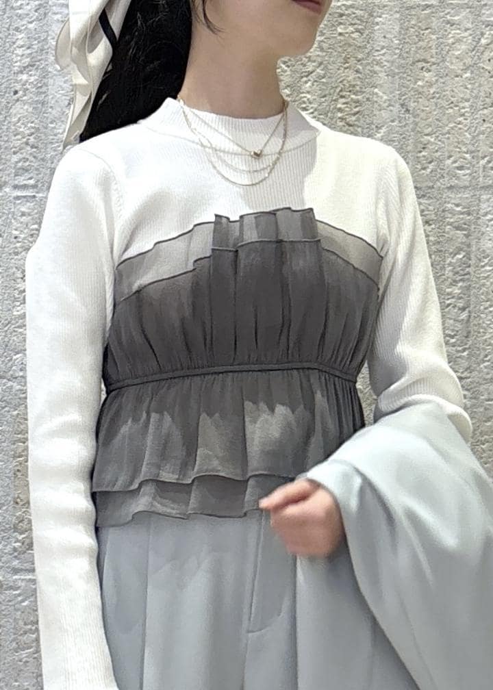 VIS【美得】ビスチェドッキングニットプルオーバー/セットアップ対応キナリ系 / F¥5,489レビューもちっとしたニット生地に、やや透け感のあるビスチェ部分がドッキングされている1枚で着映えするトップスです!ニット部分もぴったりしすぎず体のラインを拾いすぎないです。