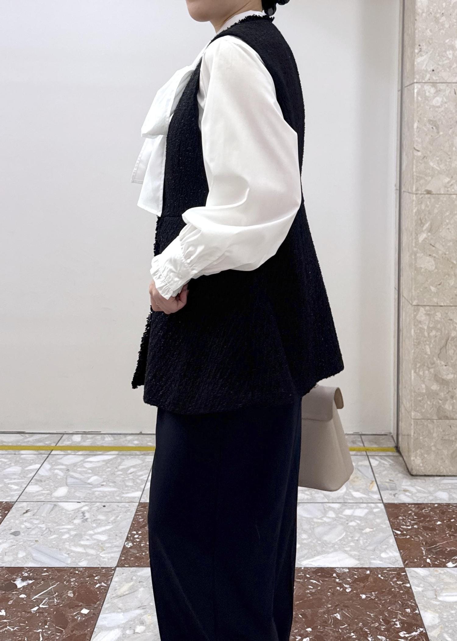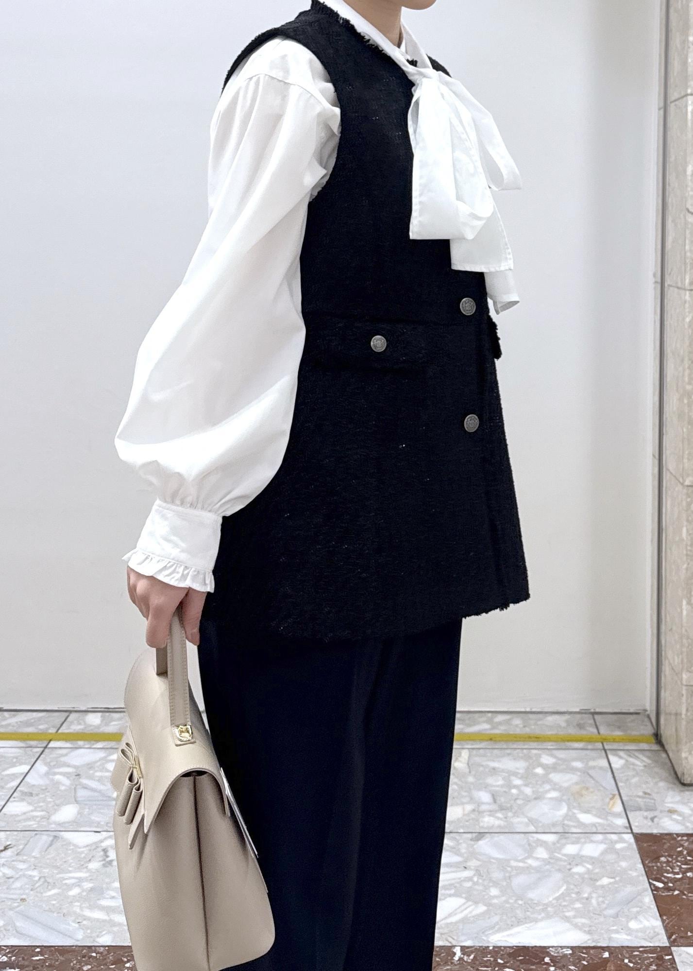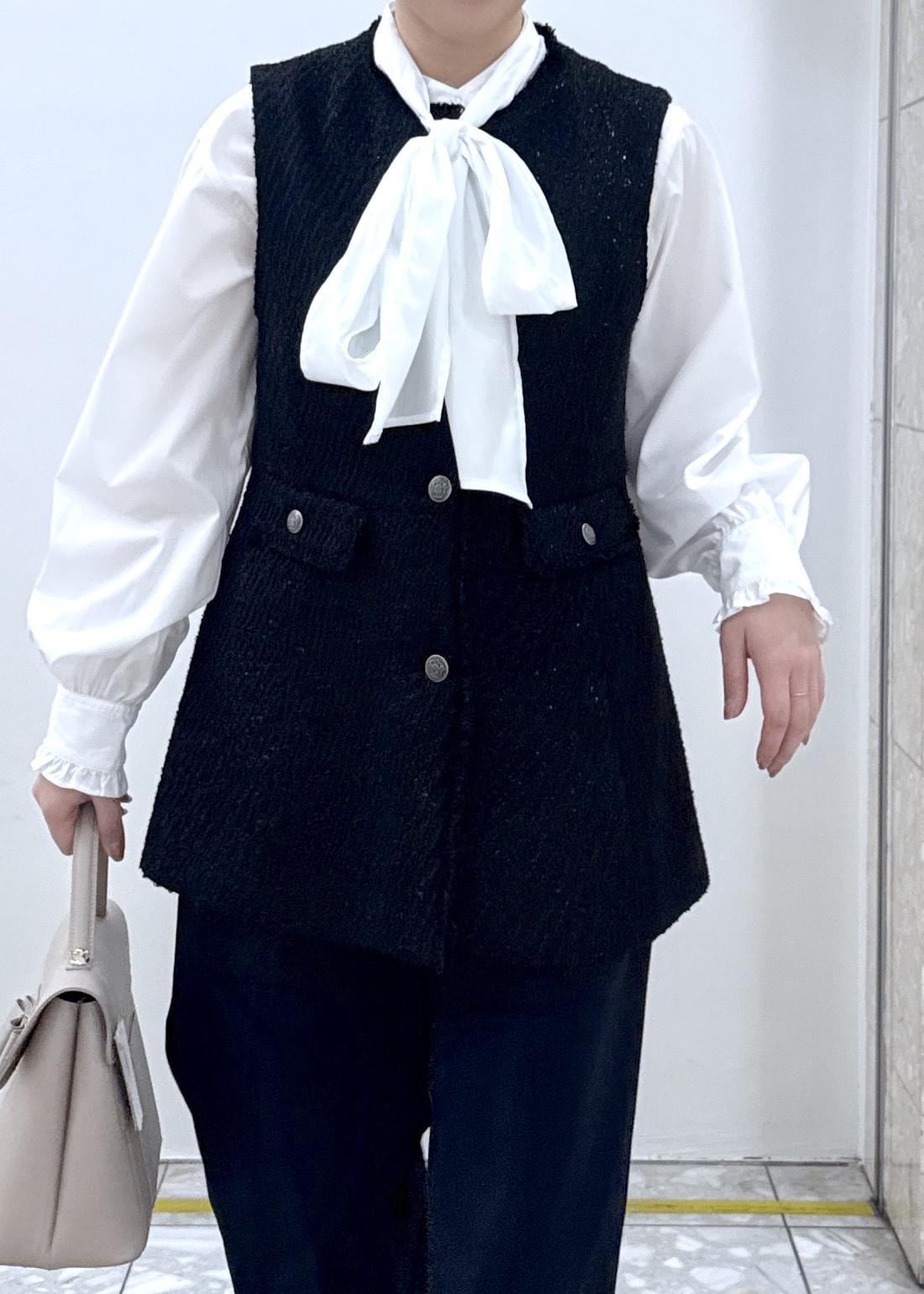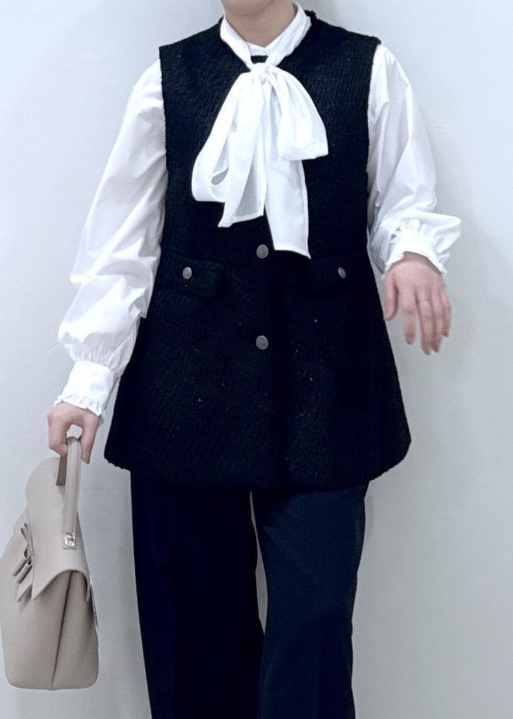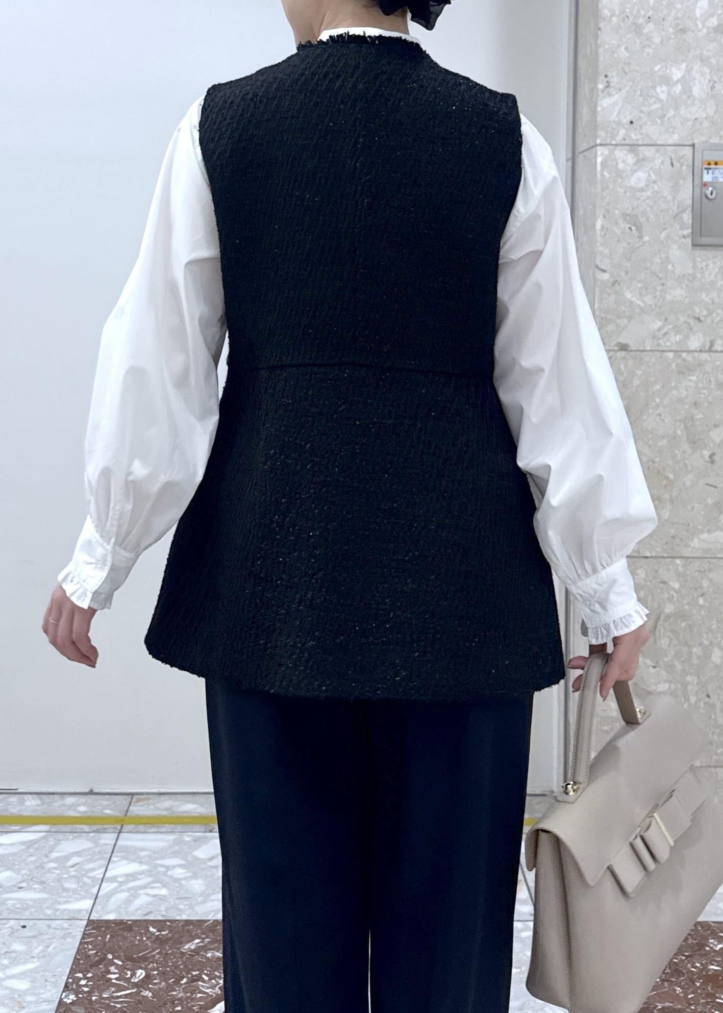 VIS【WEB限定】ノーカラーツイードジレブラック / F¥7,909レビューヒップが隠れる着丈で、肉厚すぎずレイヤードしやすい素材感です!