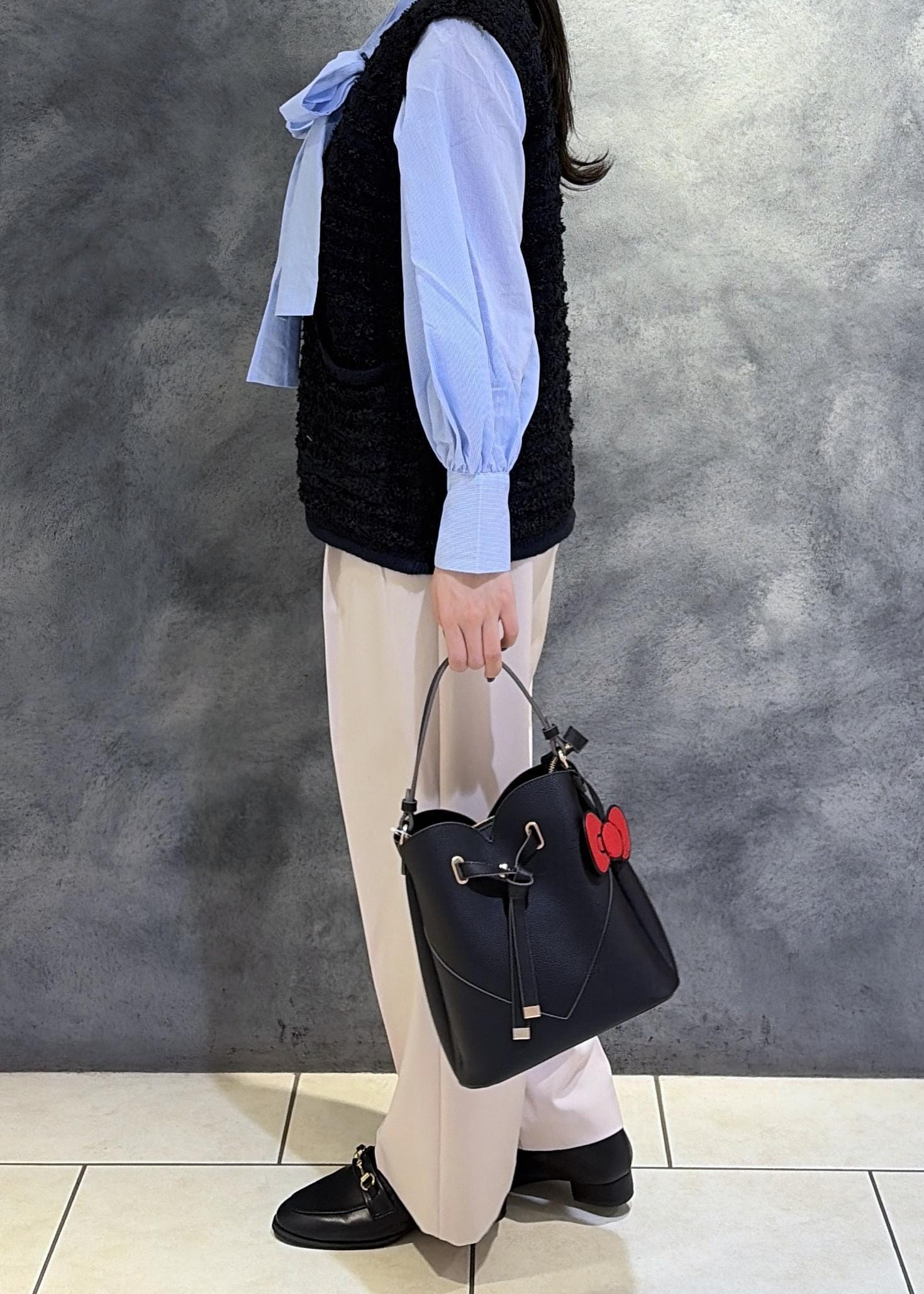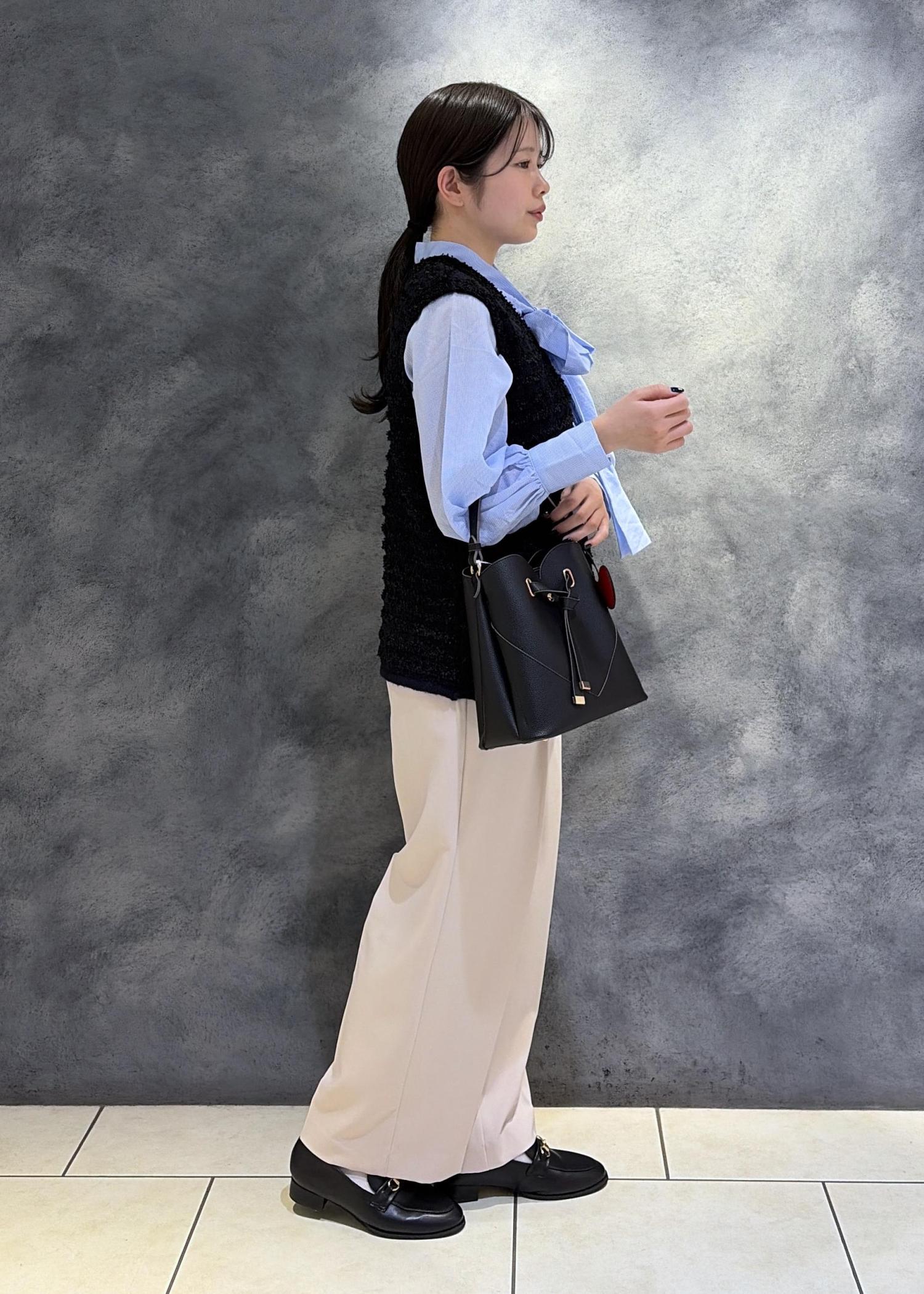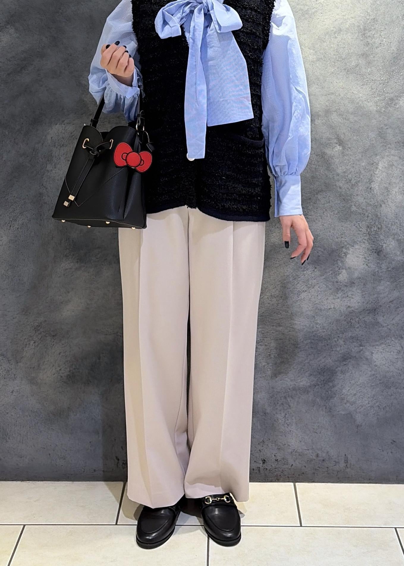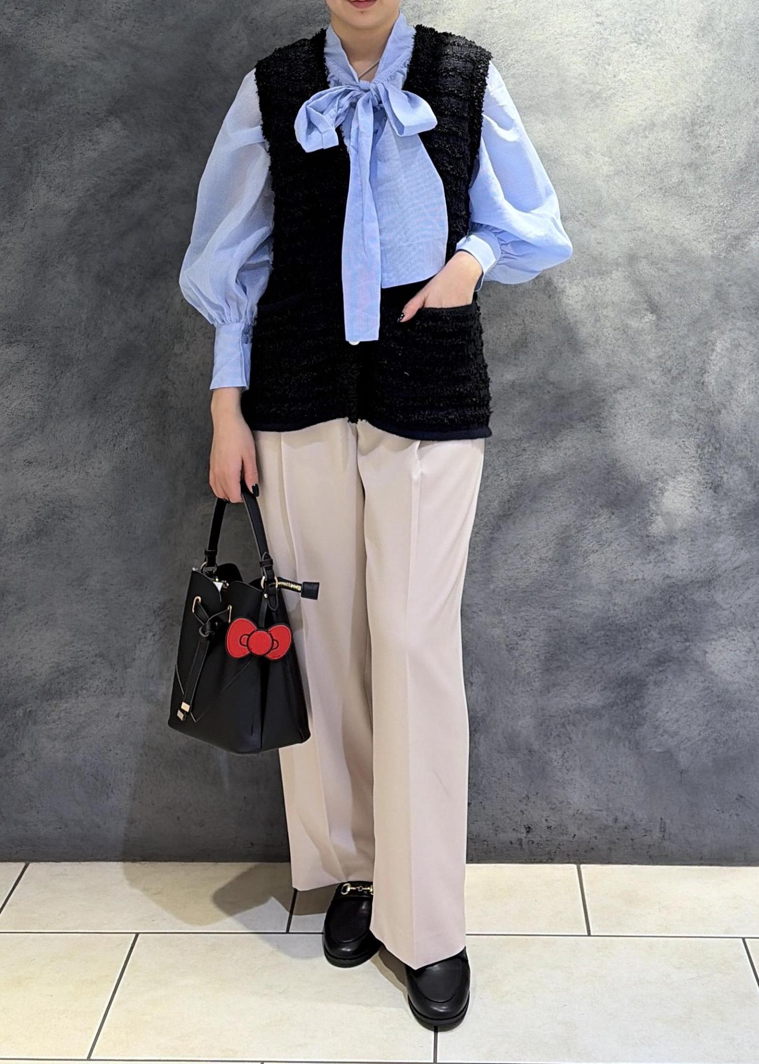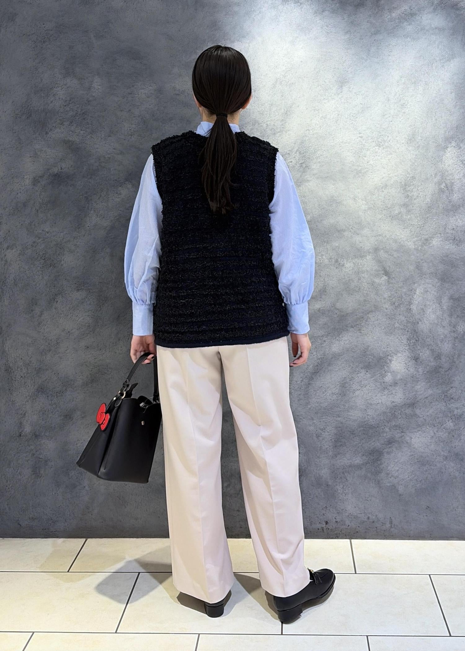 身幅はゆとり感がありニットインでも窮屈感なく着用できる幅感。Vネックなので顔周りがスッキリするデザインです。ボウタイブラウスとの合わせがおすすめです。 -