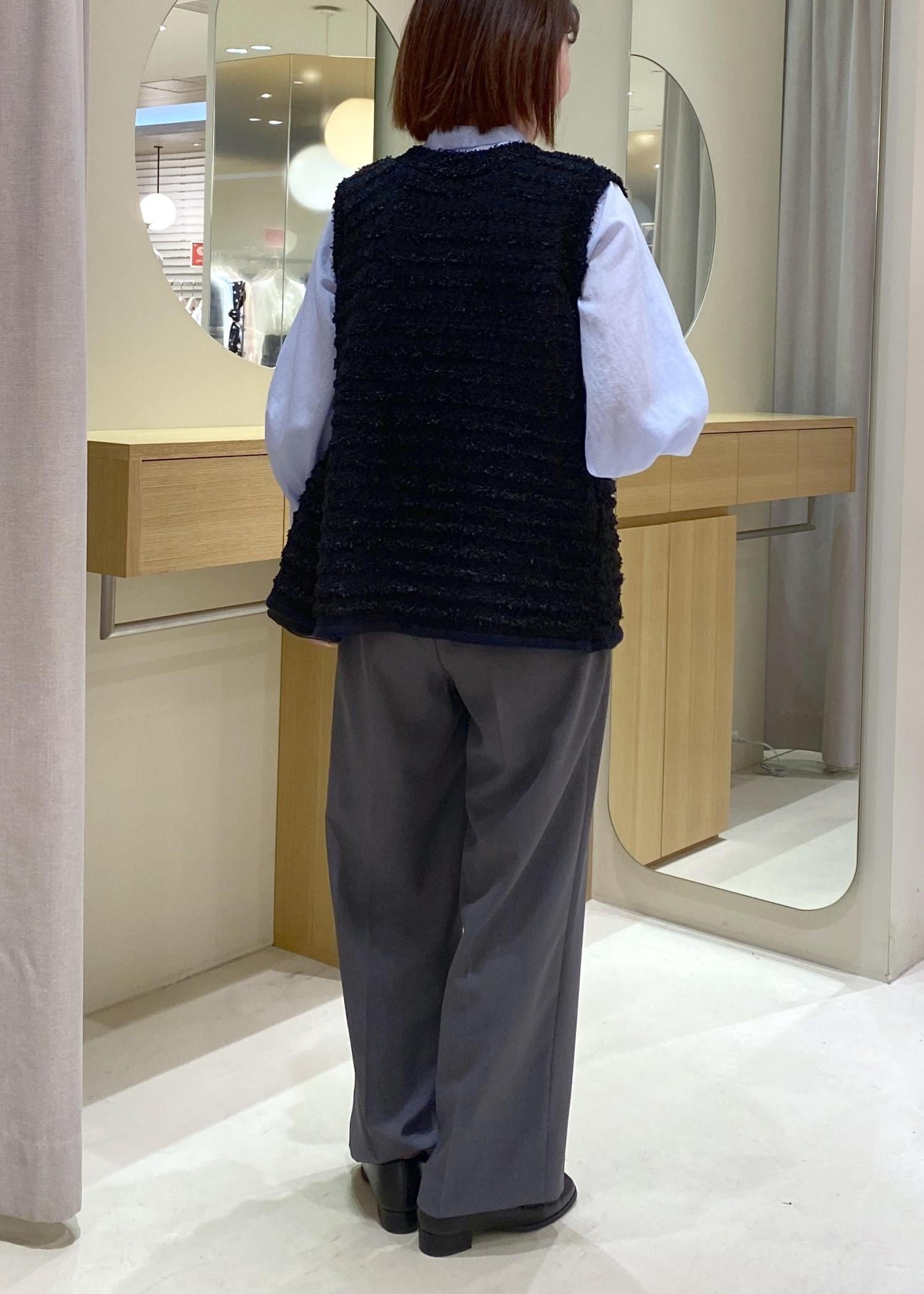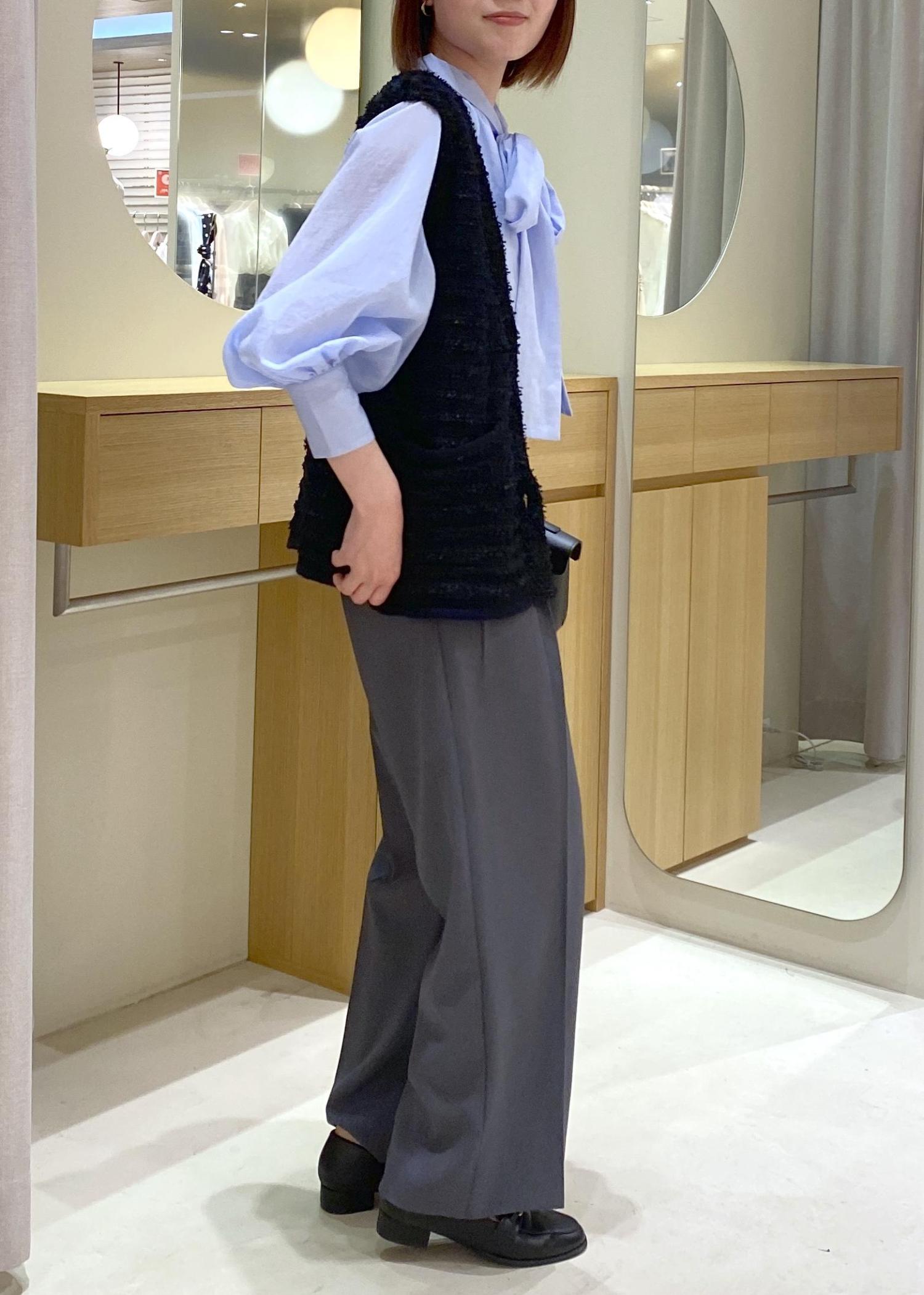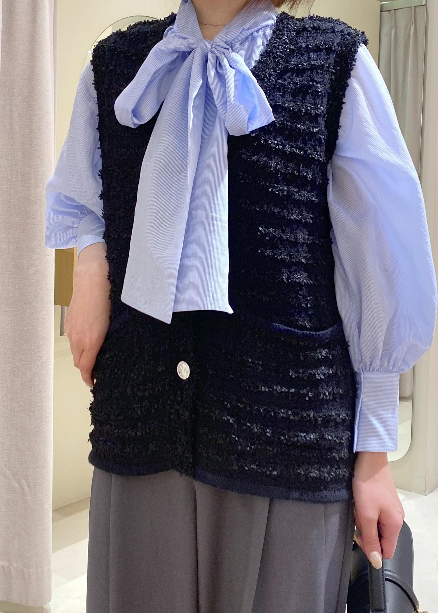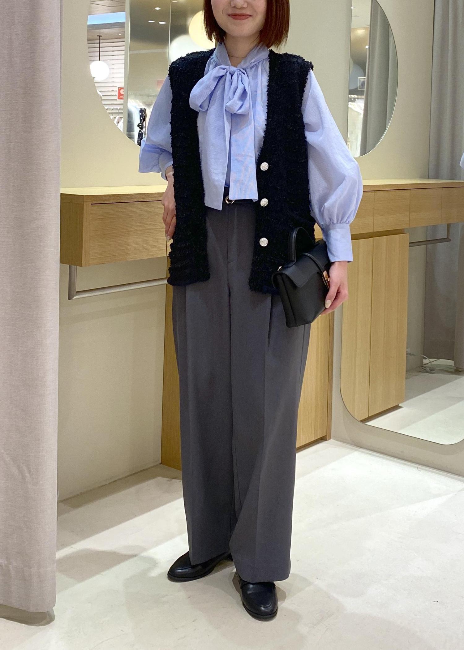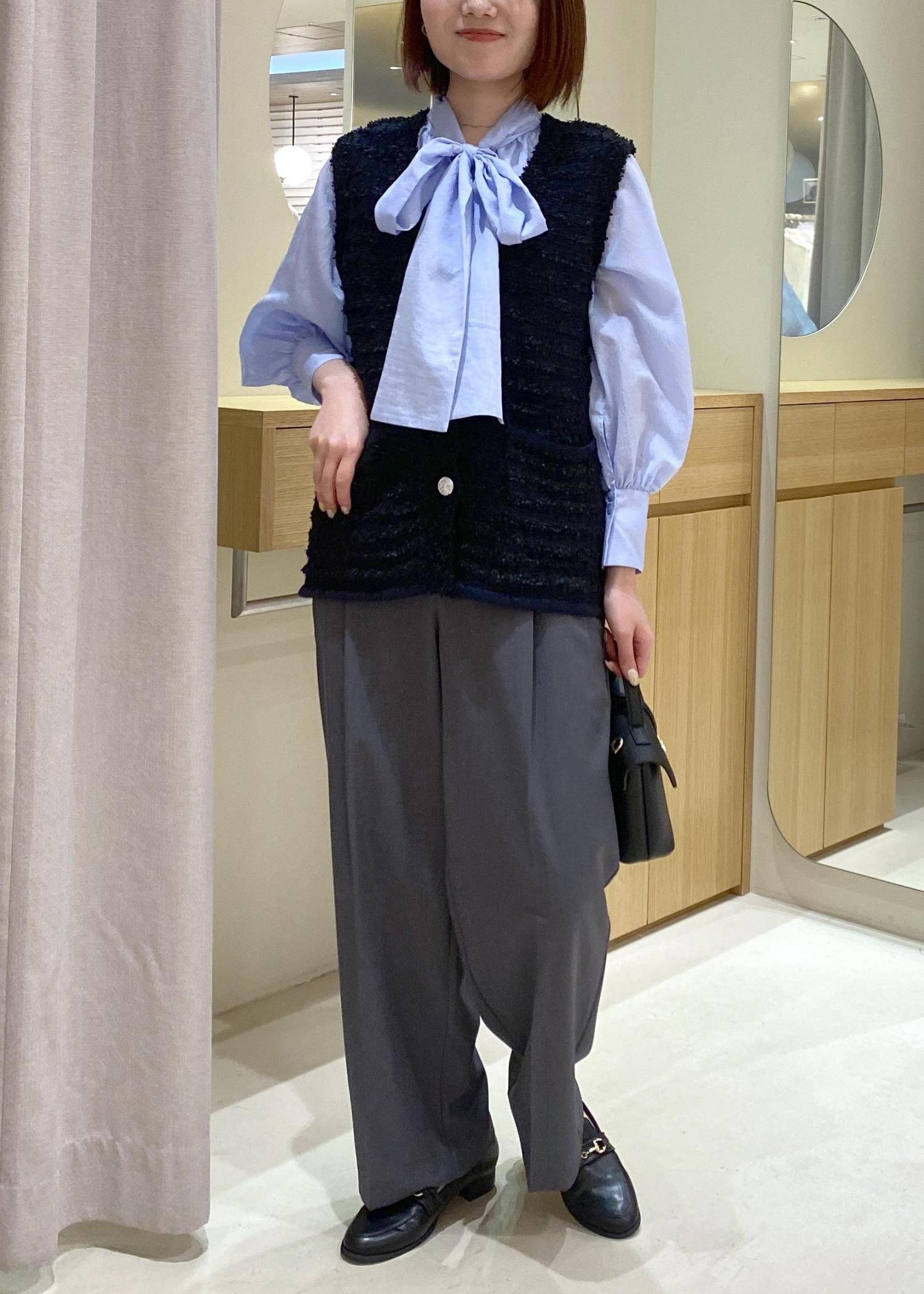 ニットベストにボウタイ付きブラウスを合わせた、お仕事時やセレモニーシーンで着まわせるキレイめコーデです!