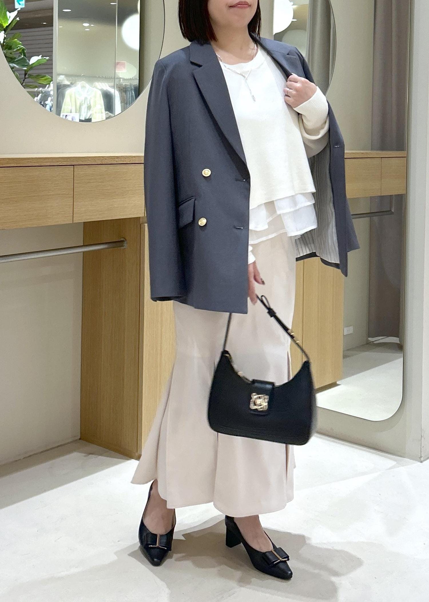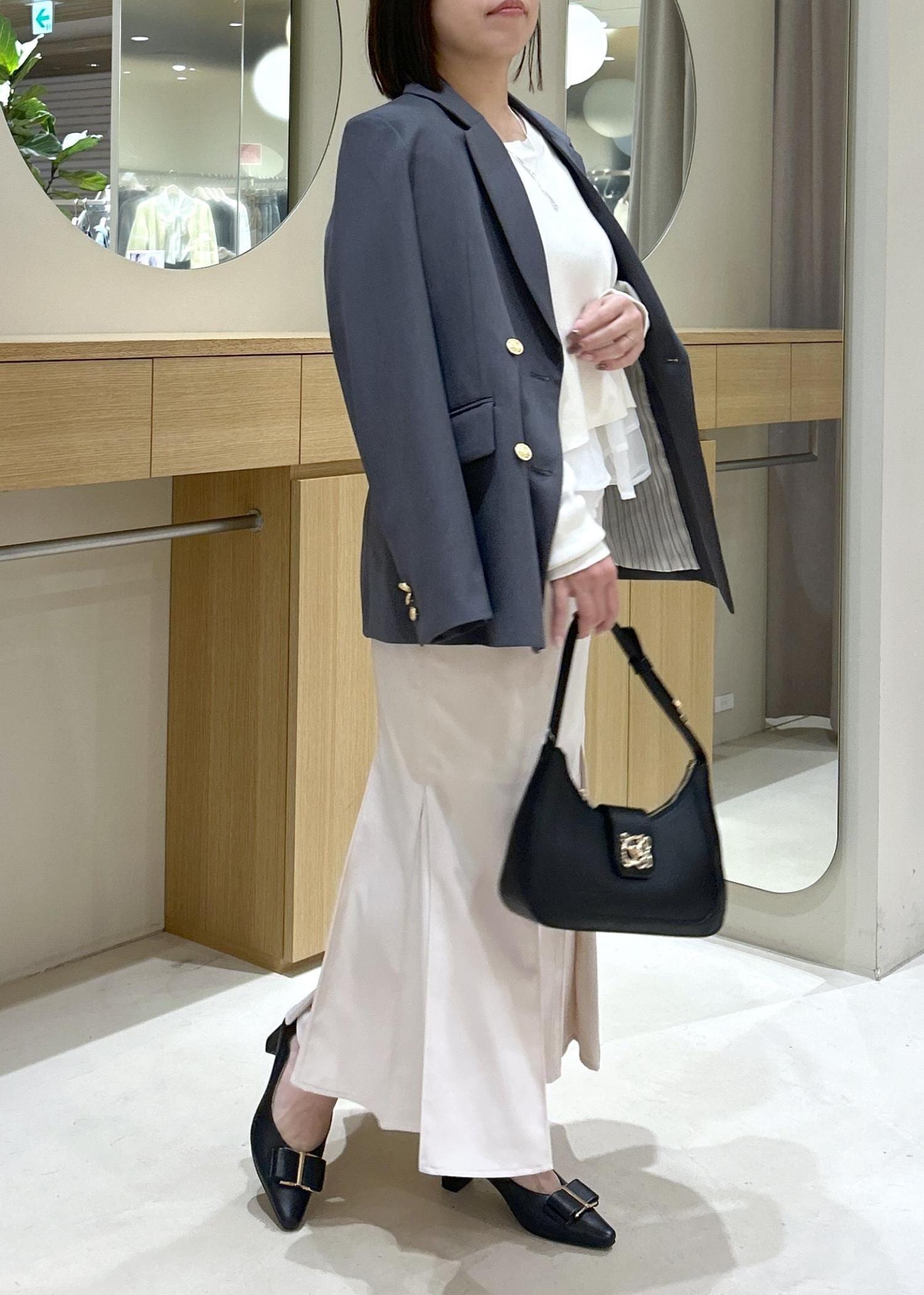 小物は締めのカラーのブラックで統一感を持たせてきちんと感のあるコーデにしました。