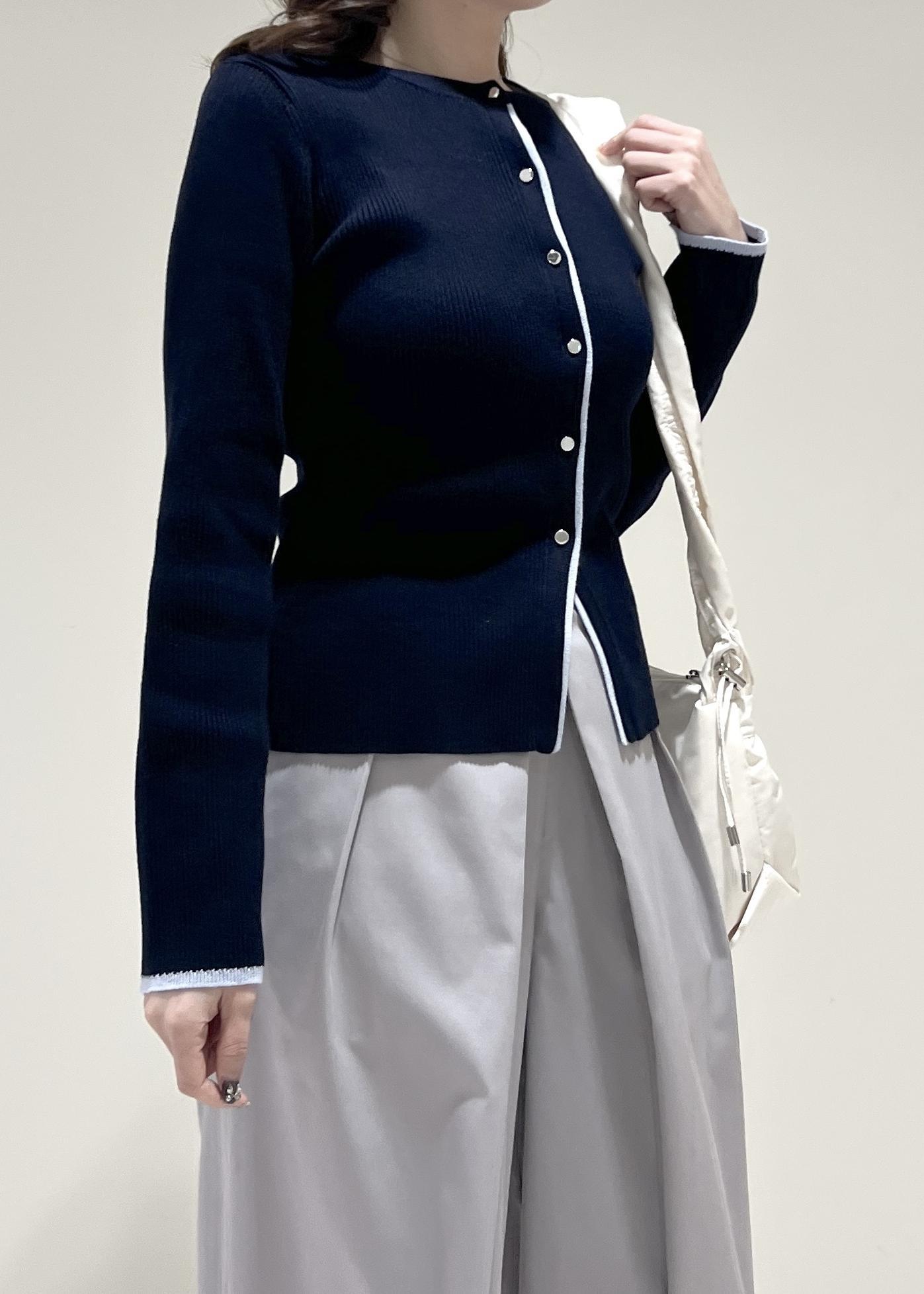 VISバイカラークルーネックカーディガンネイビー系 / F¥5,489レビューバイカラーがポイントの1枚です。カーディガンとしても1枚着としても着回せます◎着丈は腰にかかるくらいで、伸縮性があり柔らかな着心地です。