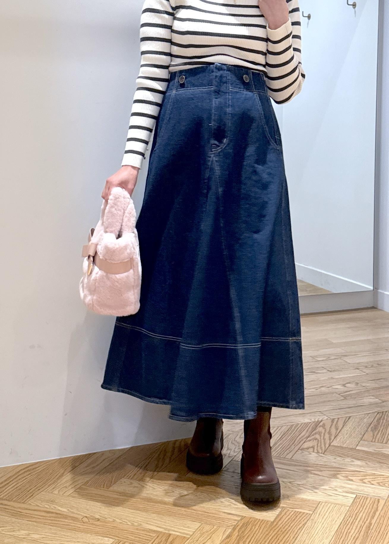 ボーダーにデニムスカートを合わせた春の大人カジュアルコーデです。デコルテがきれい見えするニットはコンパクトなので着回し抜群です。