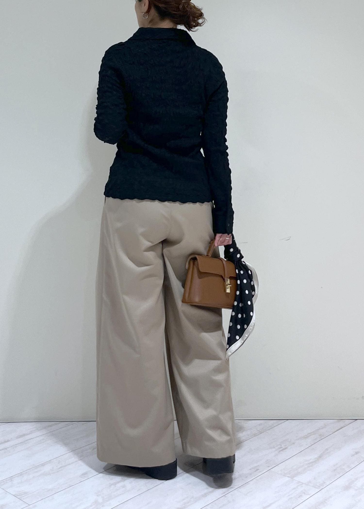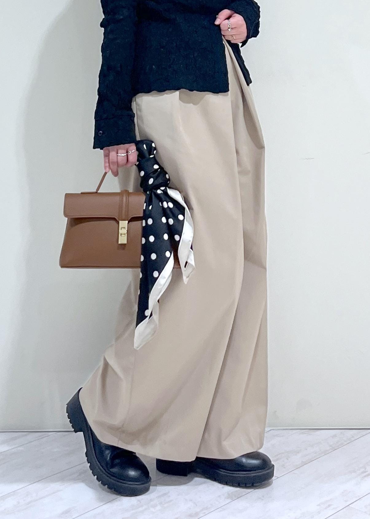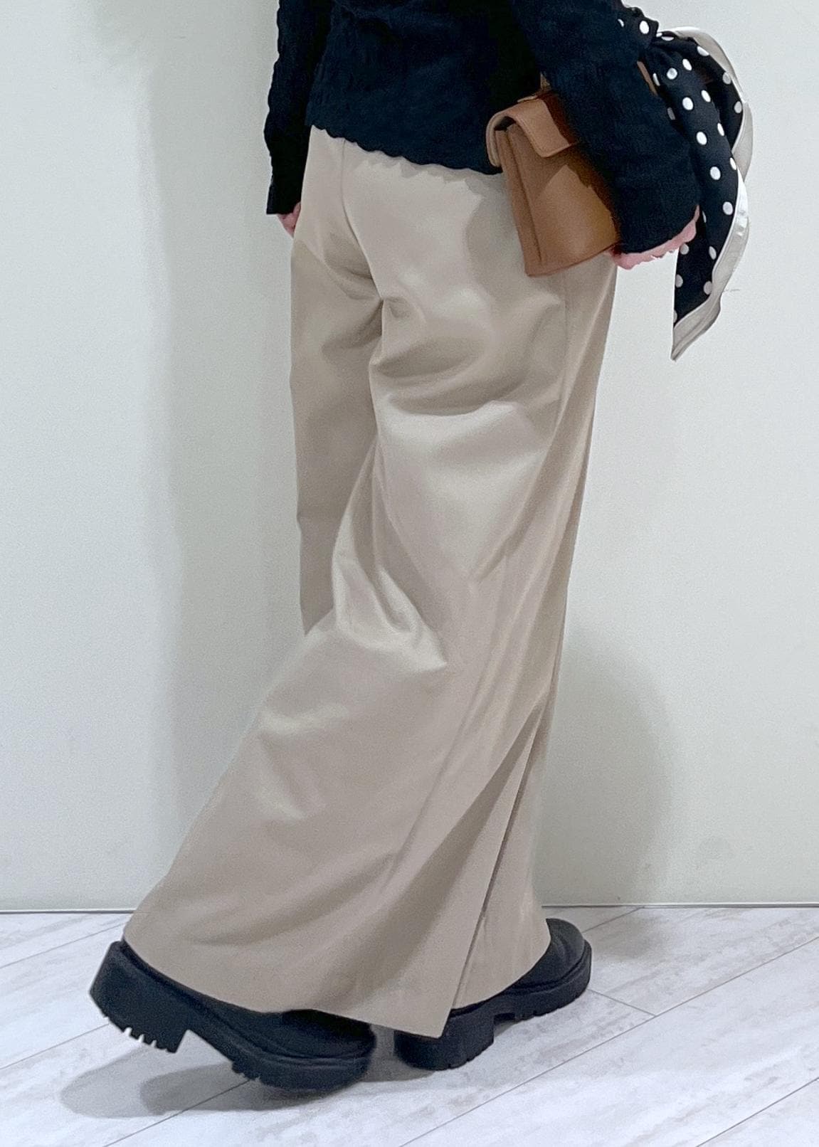 素足で履くと床にギリギリ付く程度の着丈で、少しソールのあるスニーカーやヒールなどを合わせると足のライン拾わず綺麗に着用できます! -