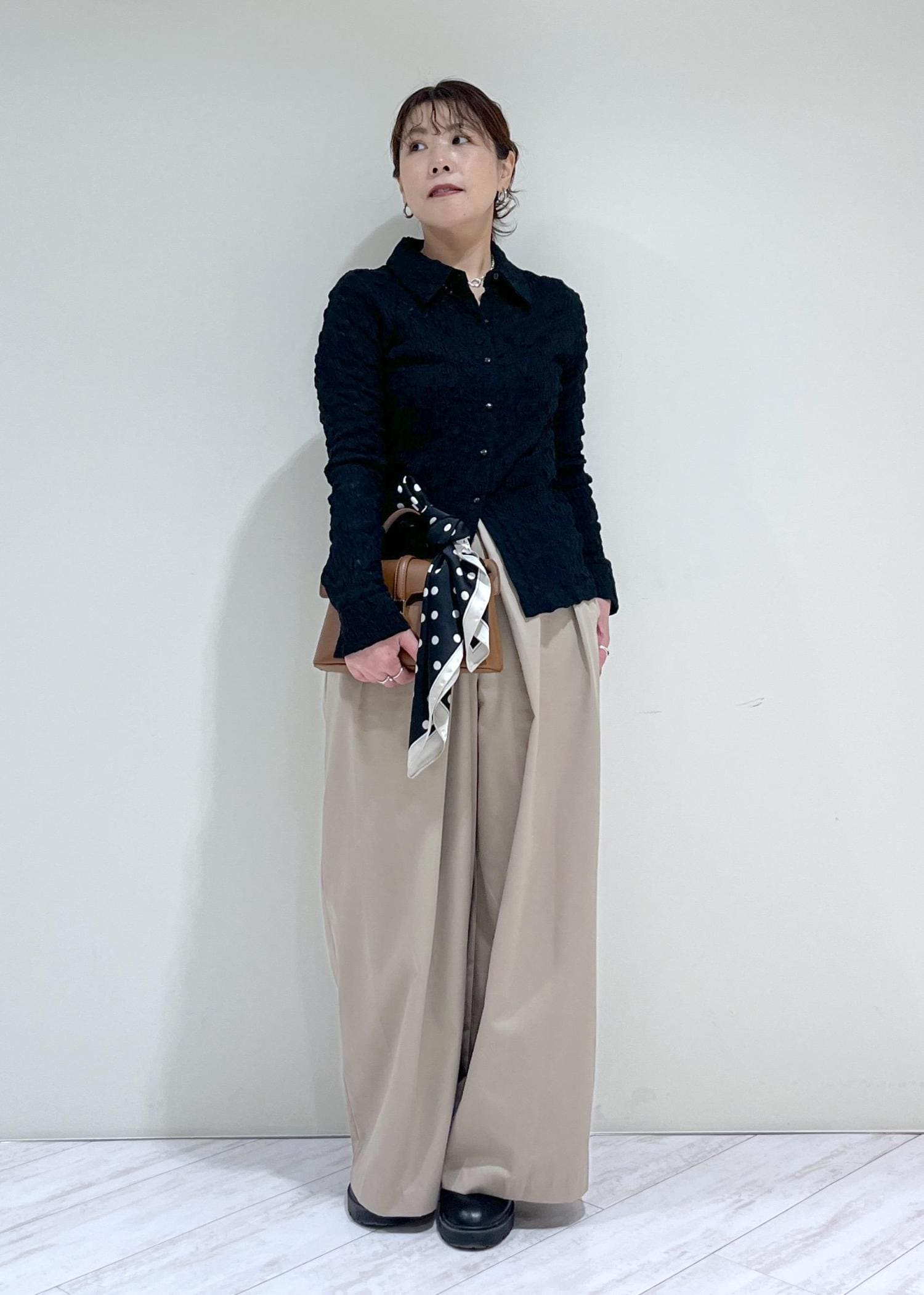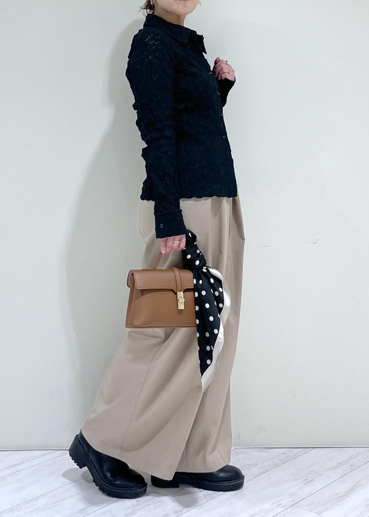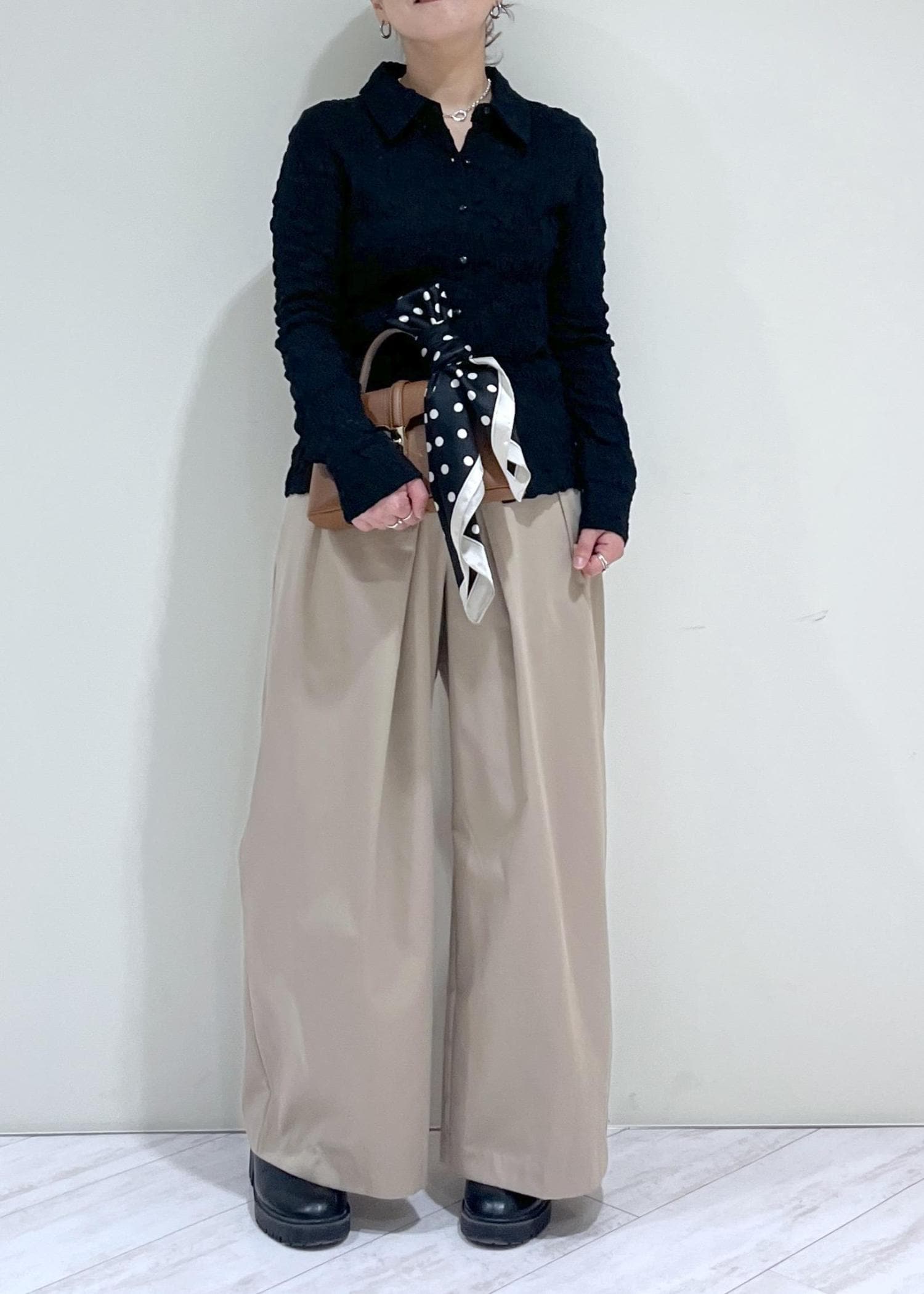 素足で履くと床にギリギリ付く程度の着丈で、少しソールのあるスニーカーやヒールなどを合わせると足のライン拾わず綺麗に着用できます! -