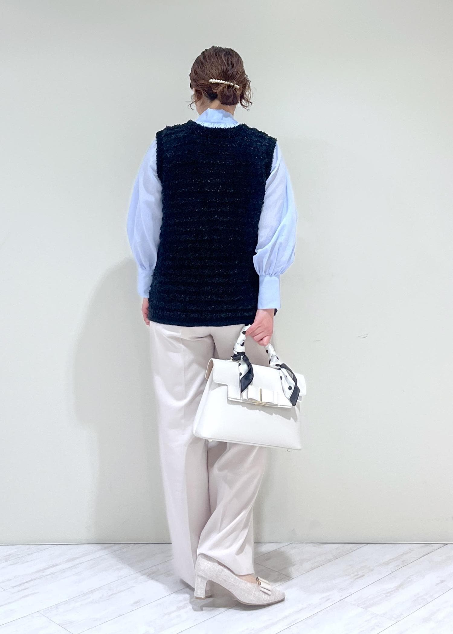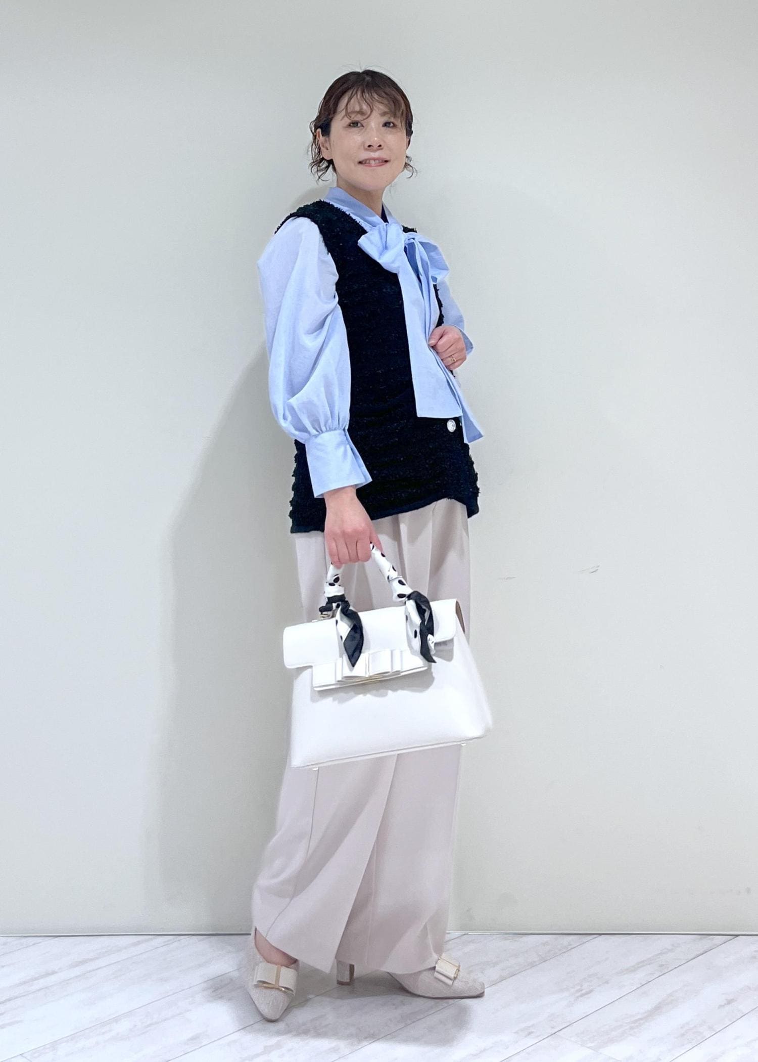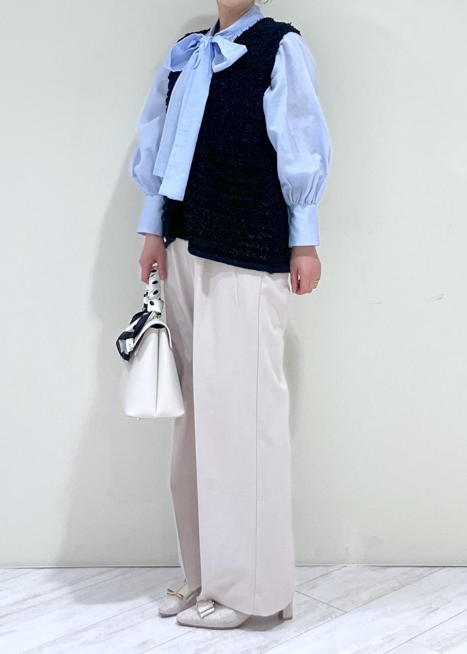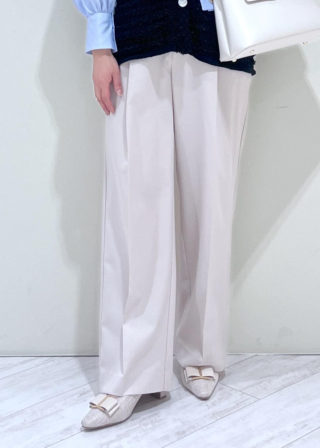 素足だと床に少し付いてしまいます。少しヒールのある靴やスニーカーだと安心ですし、脚のラインもきれいに見えます。 -