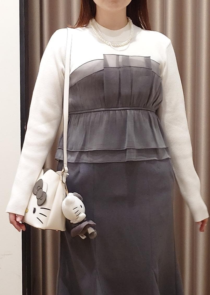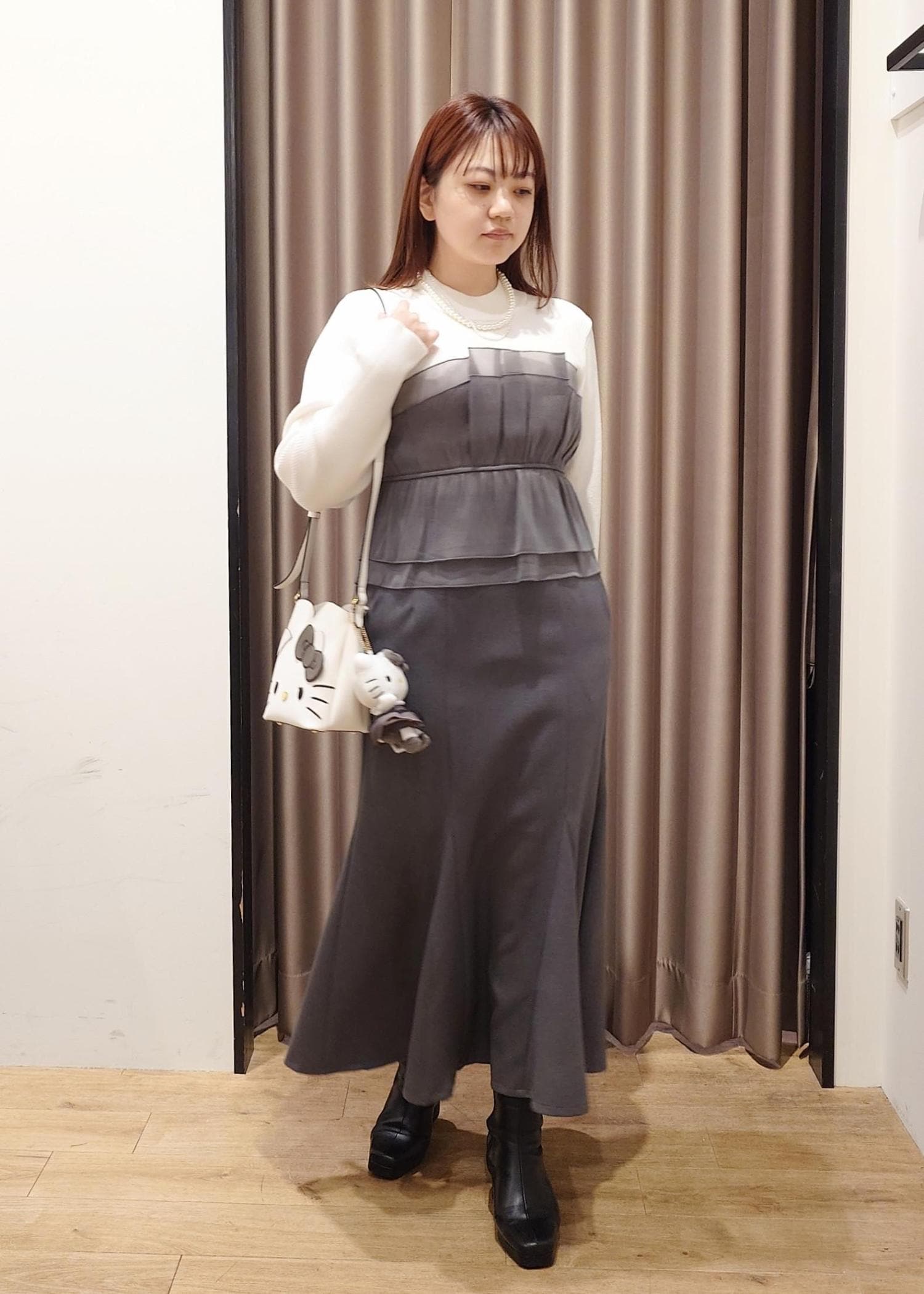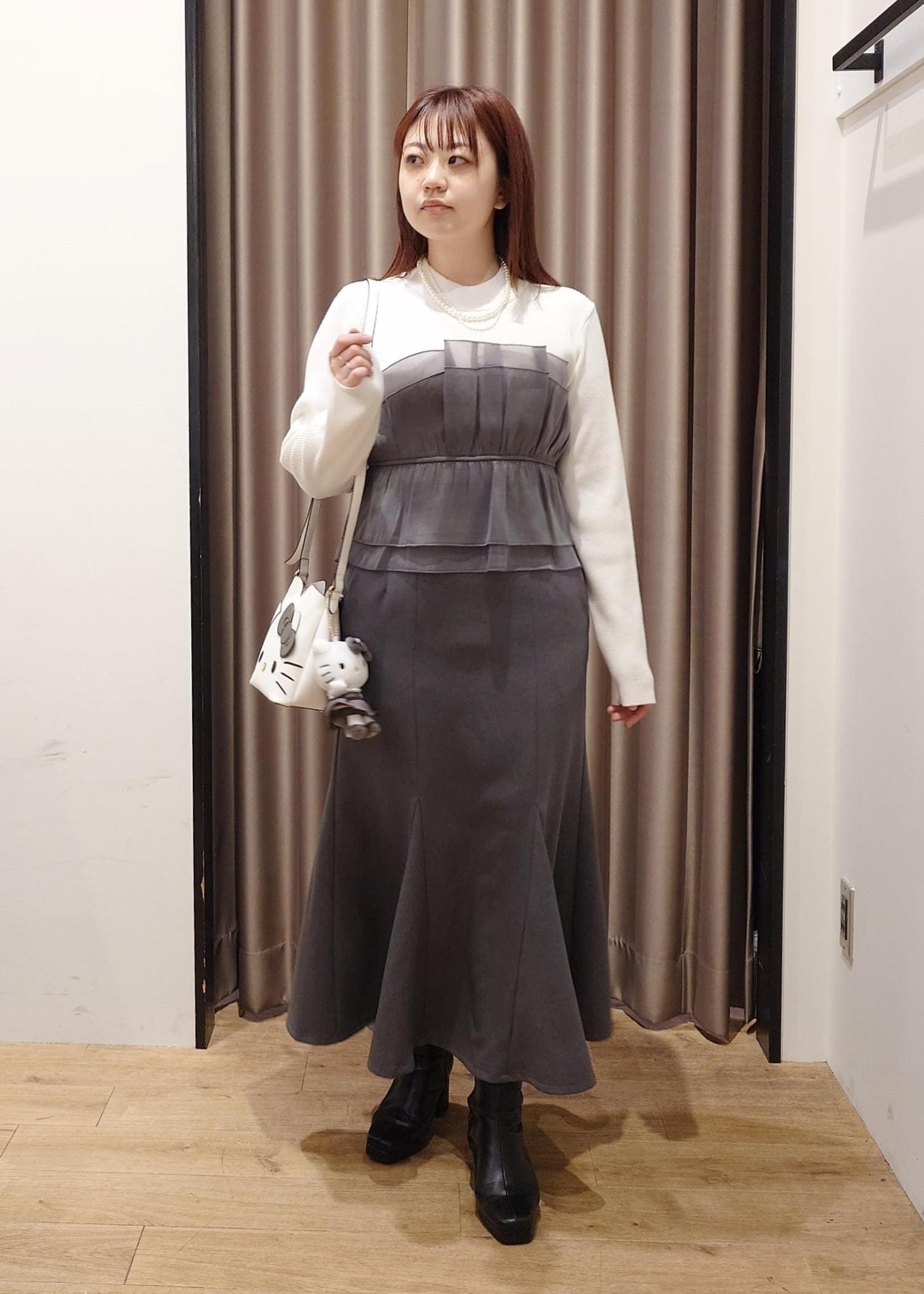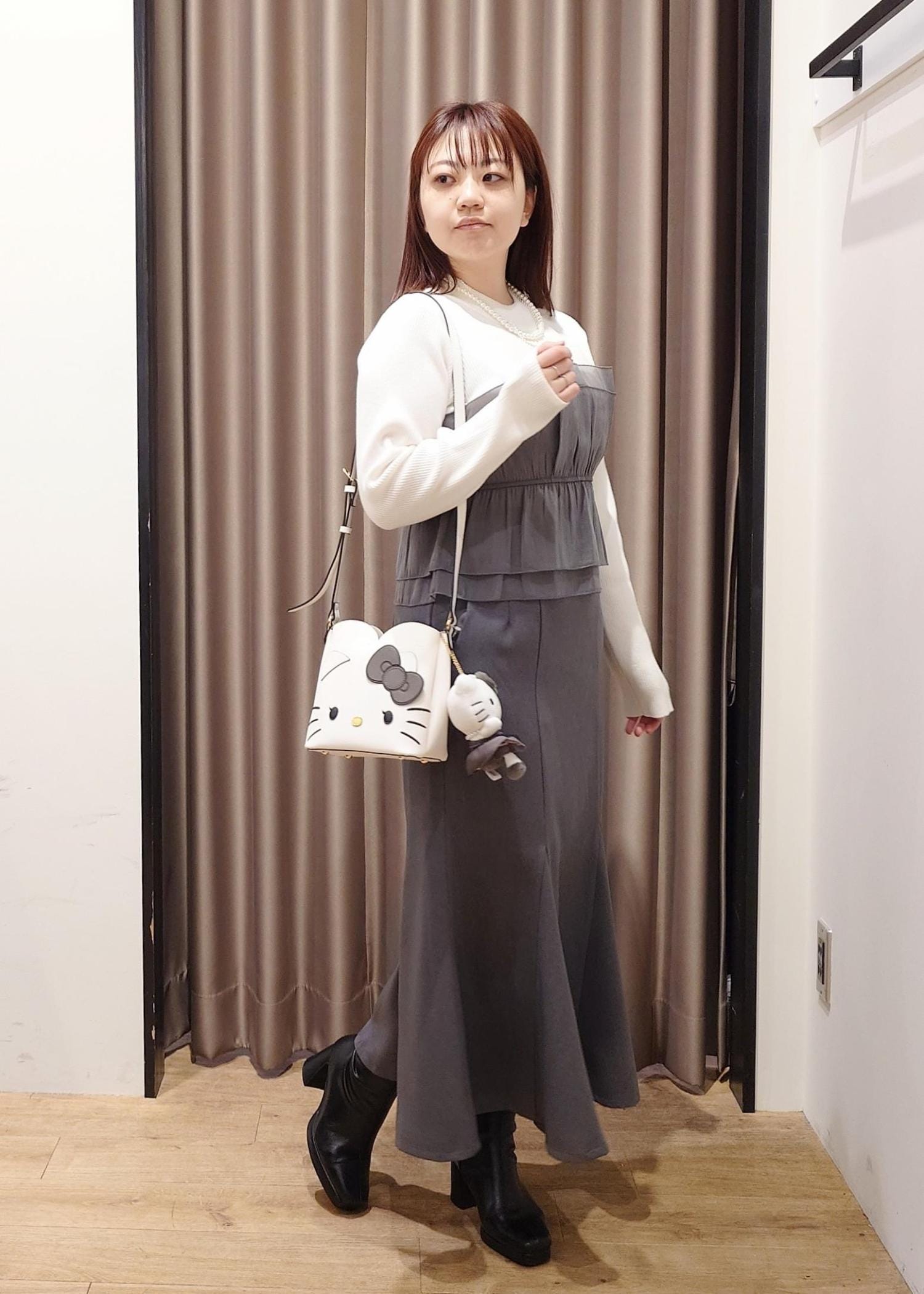 キティちゃんと同じグレーのお洋服とパールネックレスを合わせました。