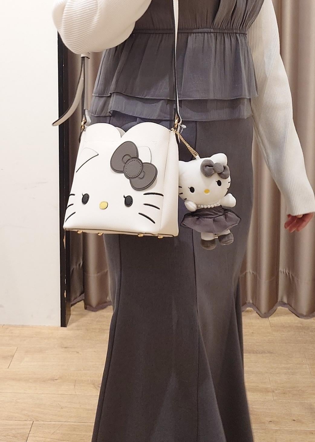 ハローキティコラボのバッグとぬいぐるみチャームに合わせたリンクコーデ。