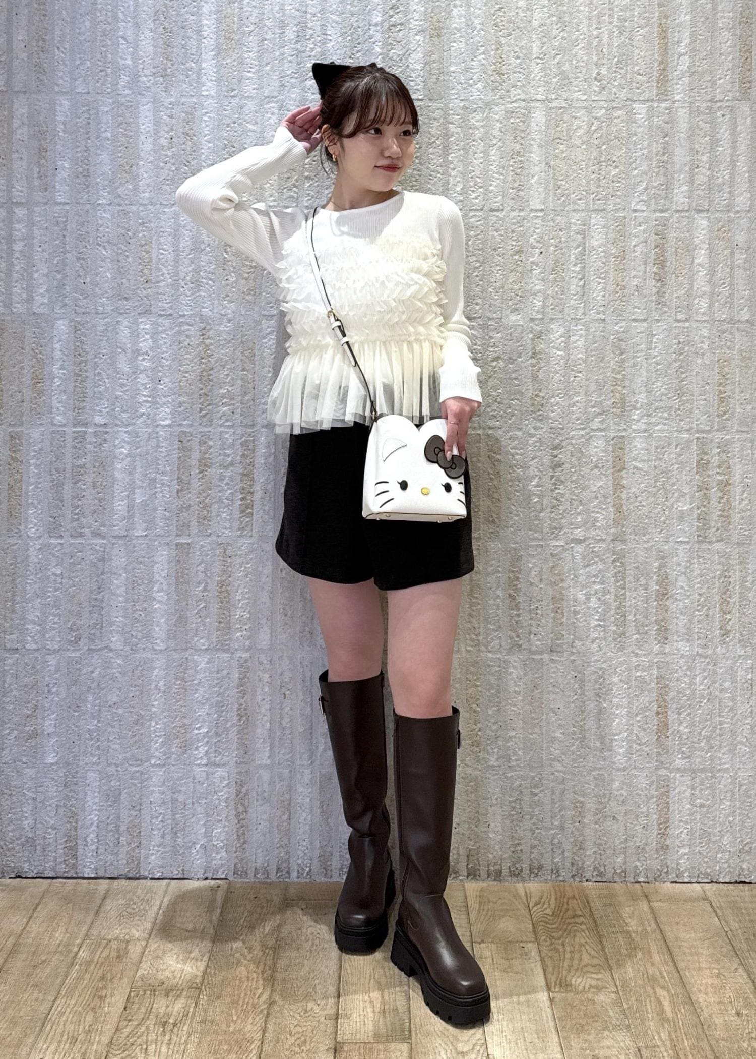 スカートやバッグなどの小物で可愛らしさをプラスして、