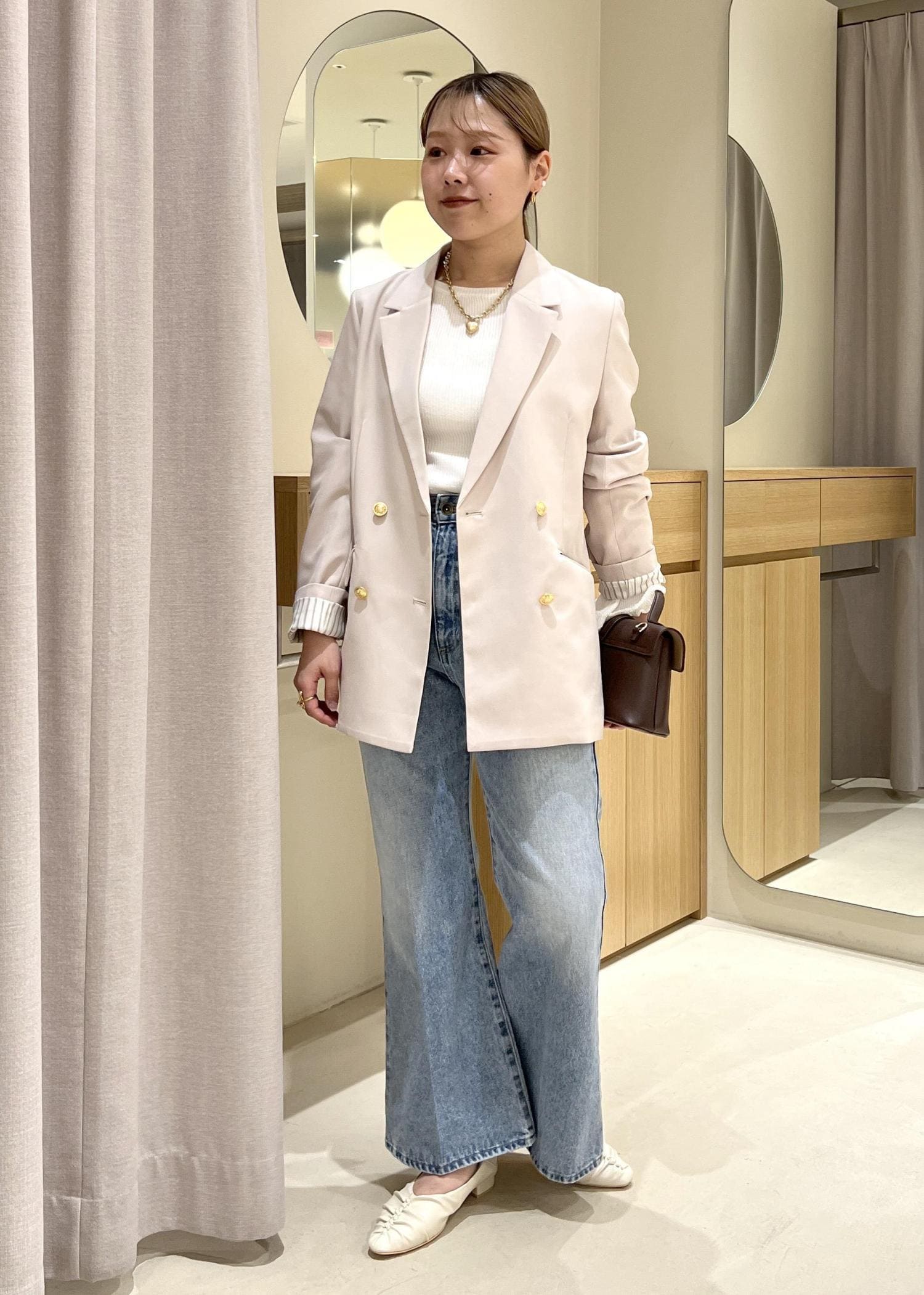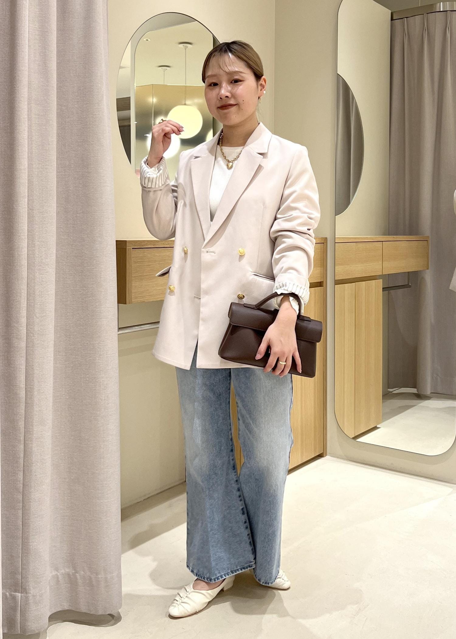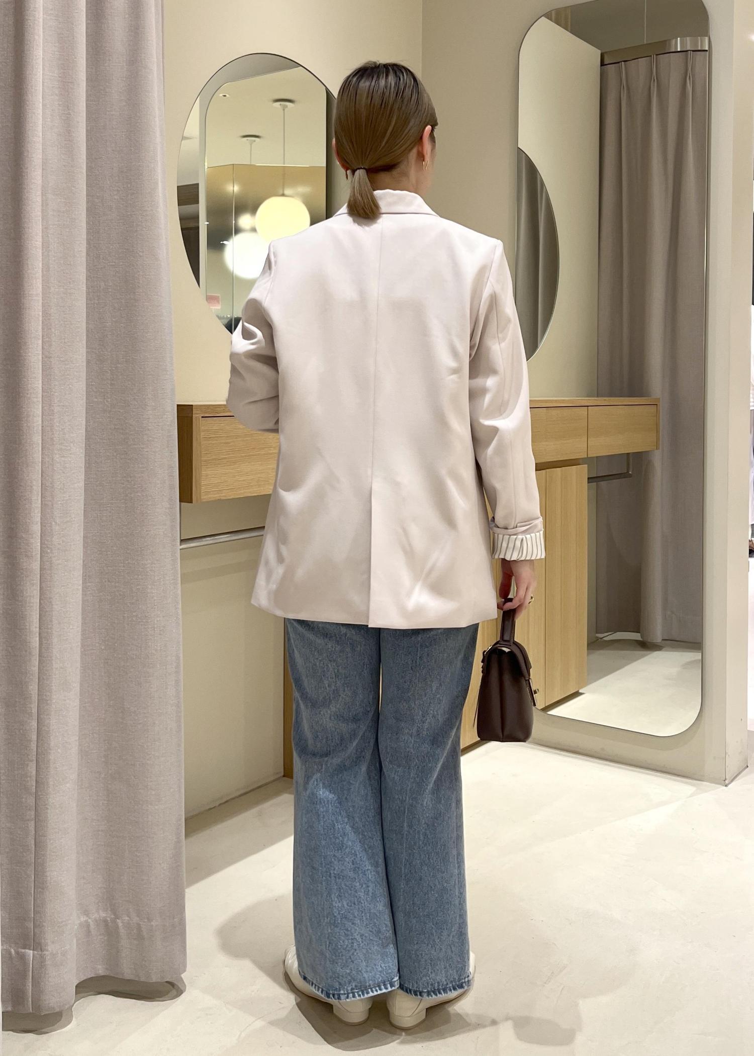 ベージュのジャケット×淡色デニムで