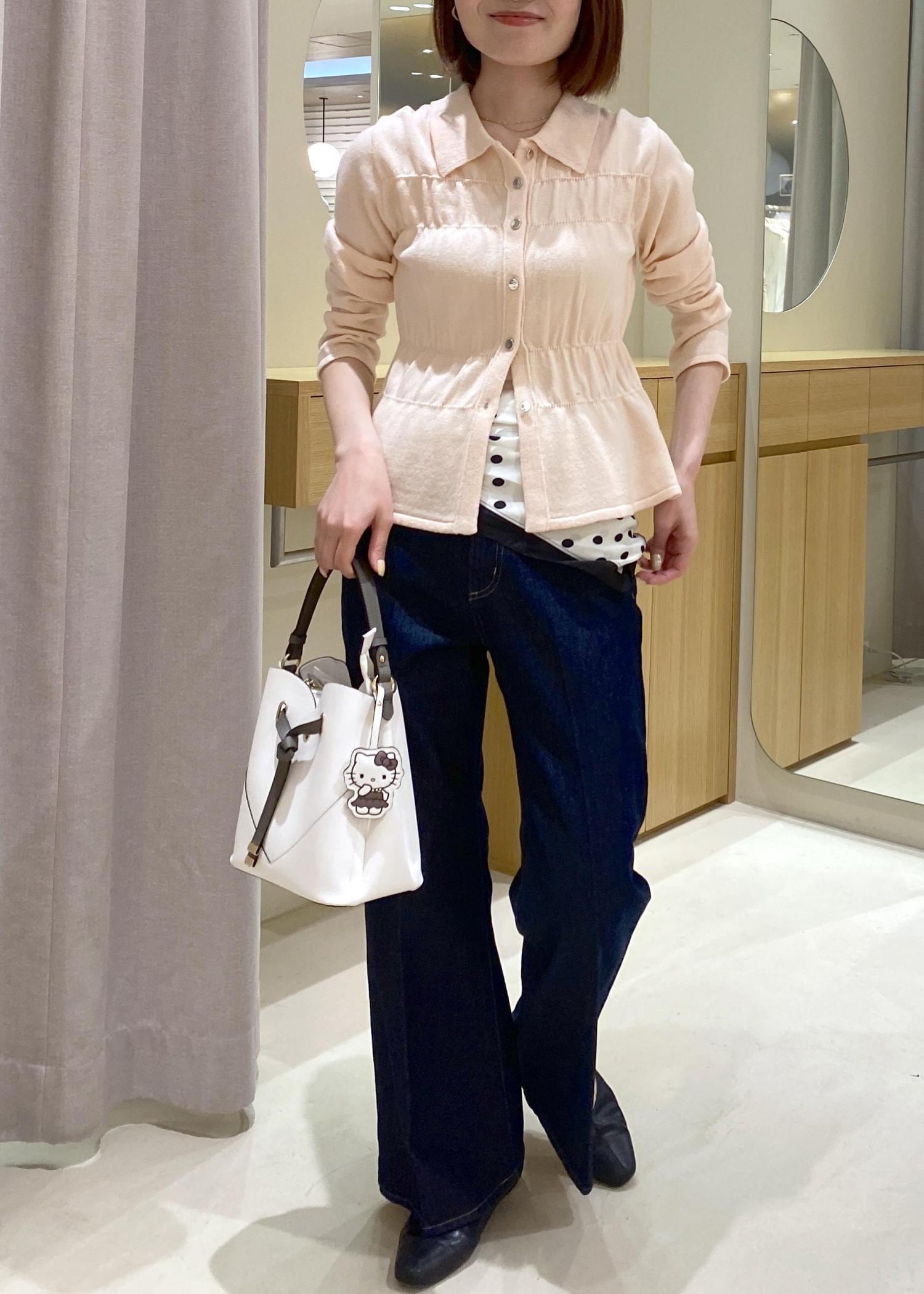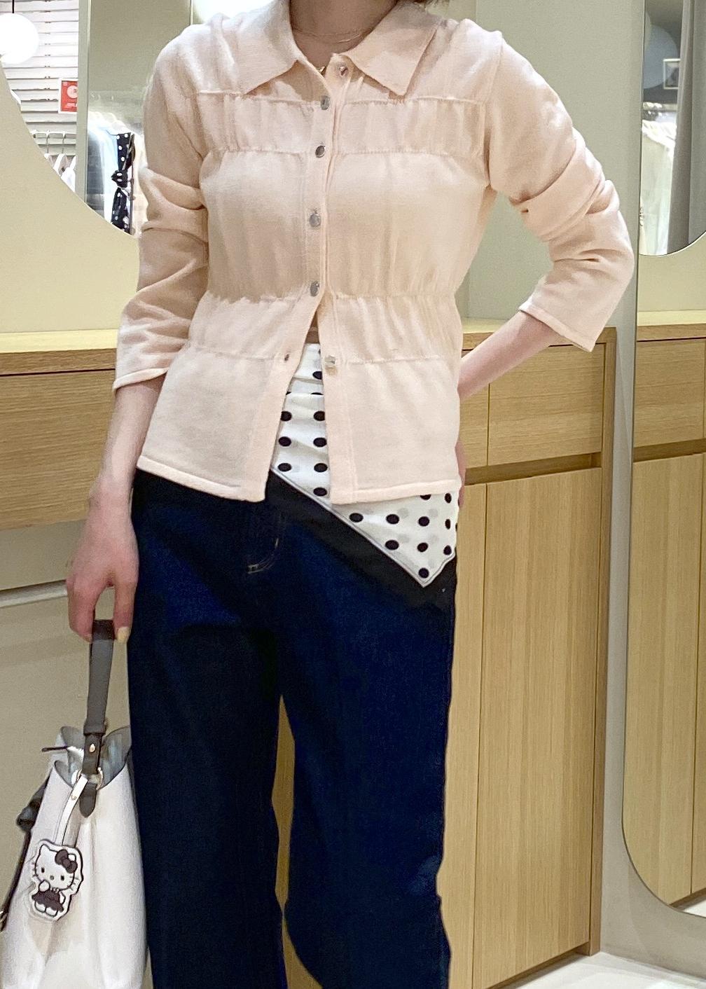 春らしい色味のピンクニットカーデにデニムを合わせたキレイめカジュアルコーデです!