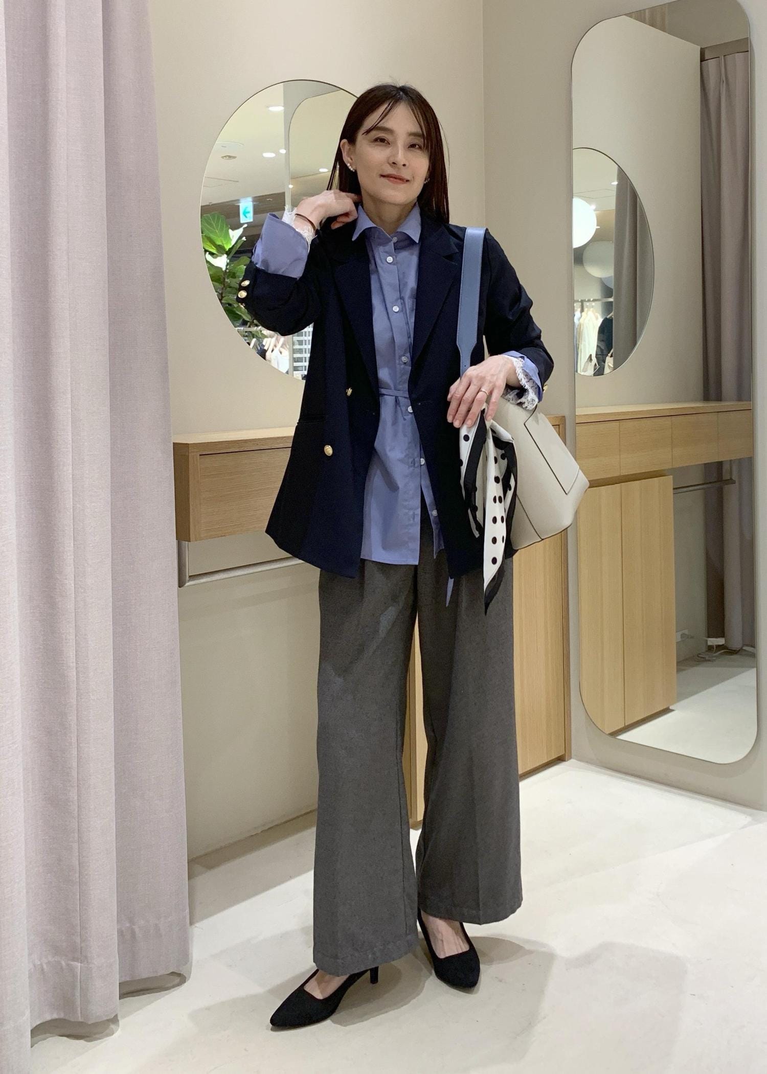 ネイビージャケットと相性の良いサックスカラーのシャツを取り入れたコーディネート。