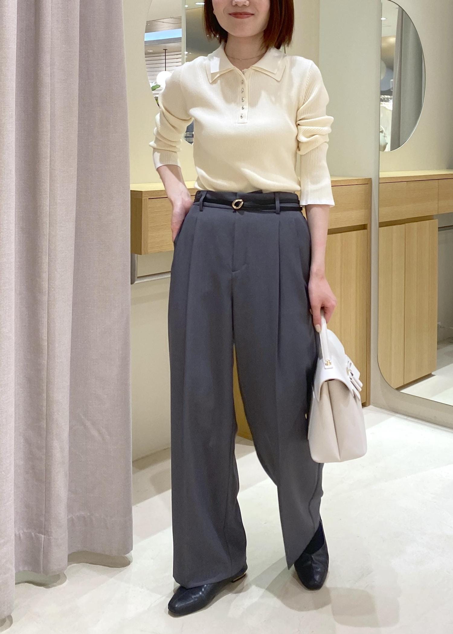 ポロニット袖のフレアシルエットやバッグのデザインで女性らしいもプラス◎