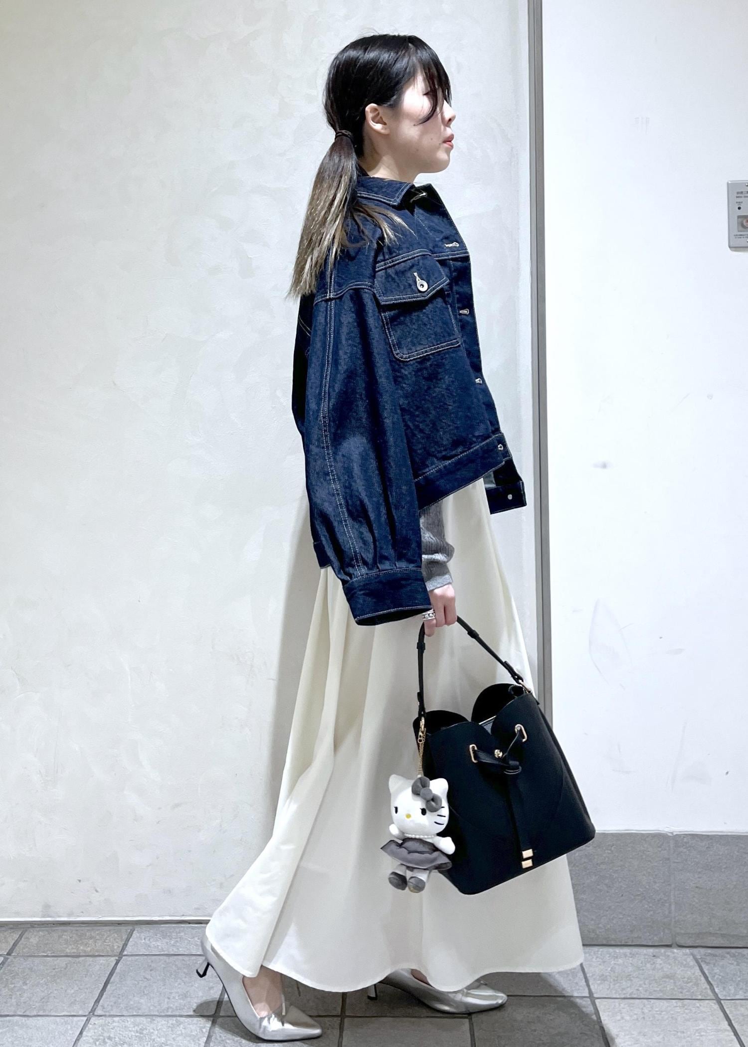今っぽいダブルカラーのドッキングワンピースにデニムのジャケットを合わせて大人カジュアルコーデにしました!