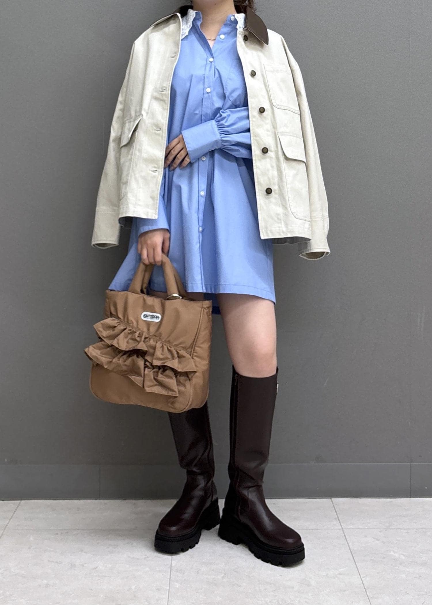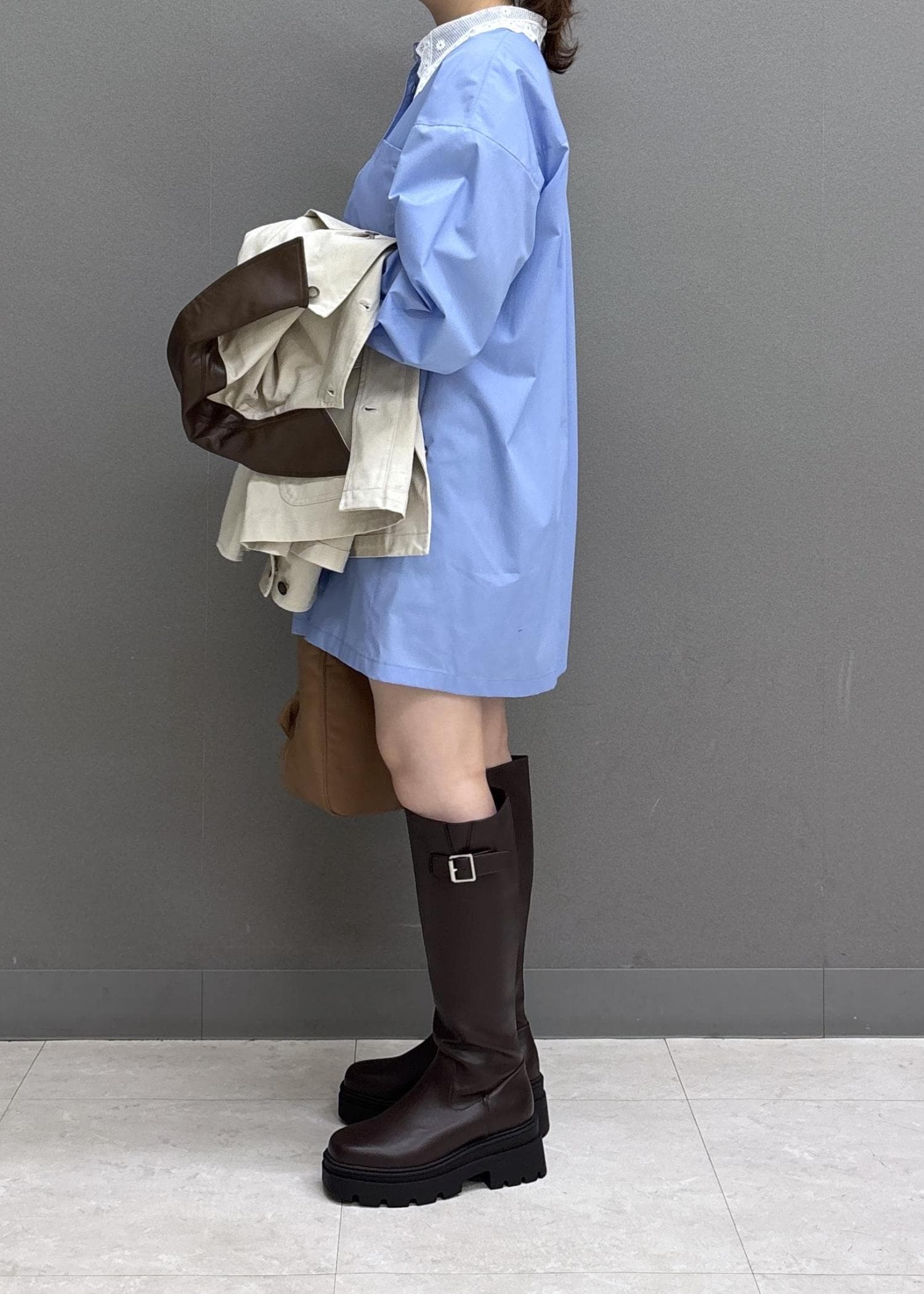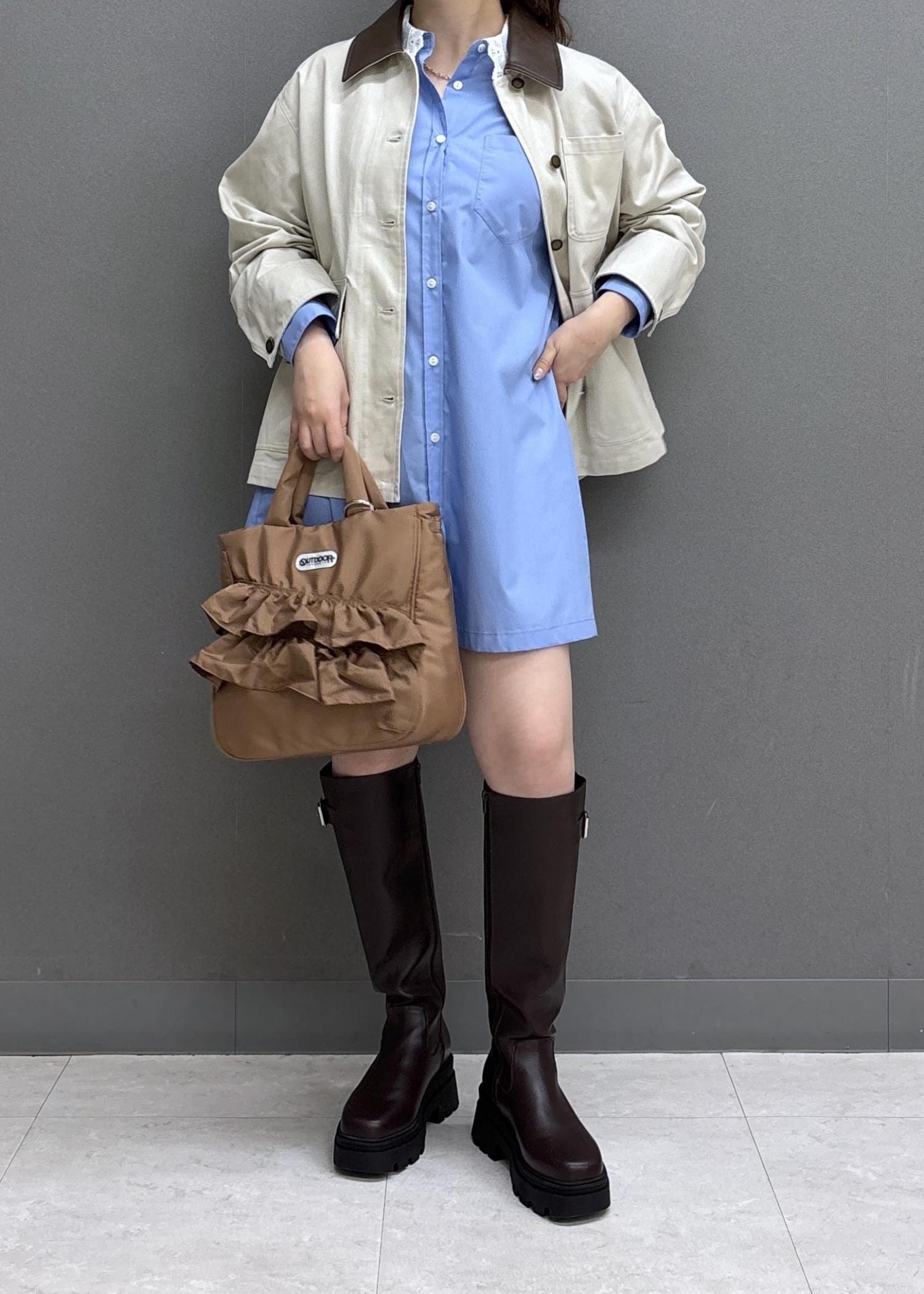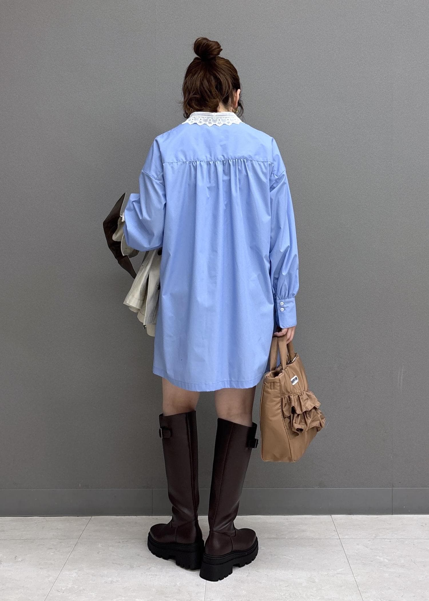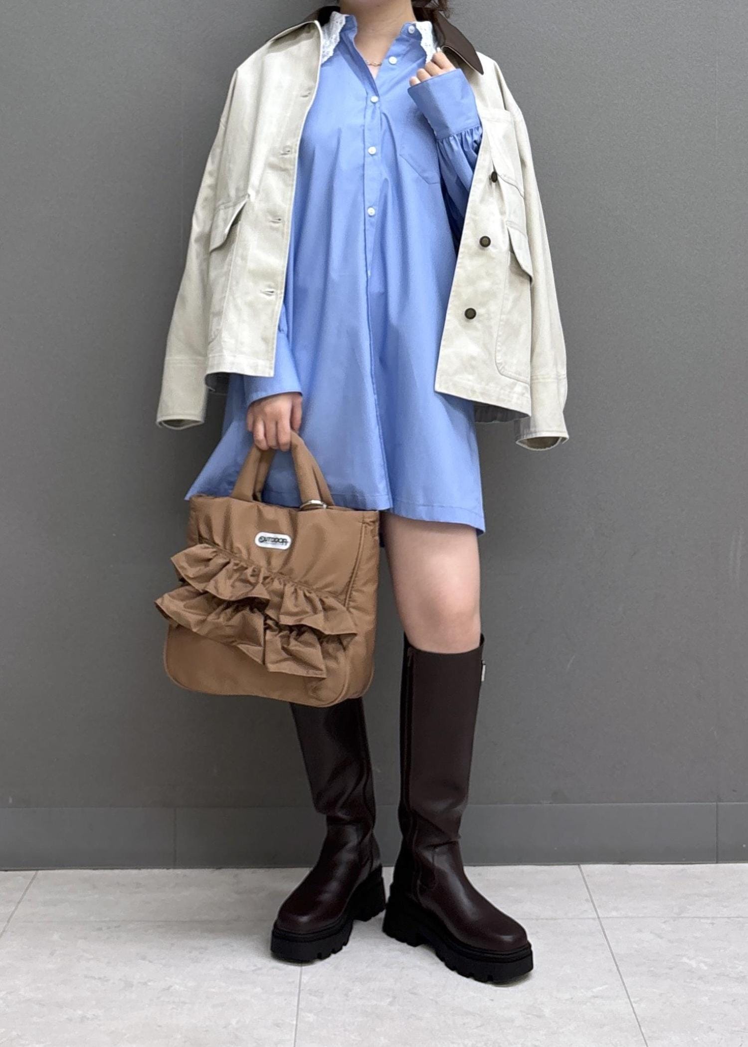 VIS襟レース付きミニ丈シャツワンピサックス / F¥7,689レビュー160㎝だと膝上の着丈で、太ももはしっかり隠れます!身幅はゆとりがあるので身体のラインは、あまり拾いません!パリッとした薄手の素材で春まで活躍しそう♩ミニワンピとしてはもちろん、パンツ合わせもおすすめ!