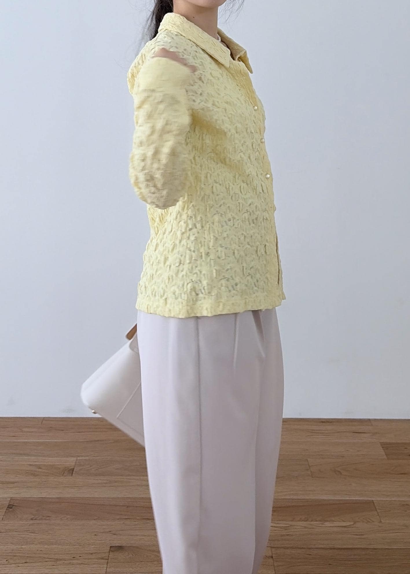 透け感があるので、今の時期はロンTなどを入れていただき、春先、暖かくなってきたらカップ付きのキャミソールを着ていただくのをおすすめします!!