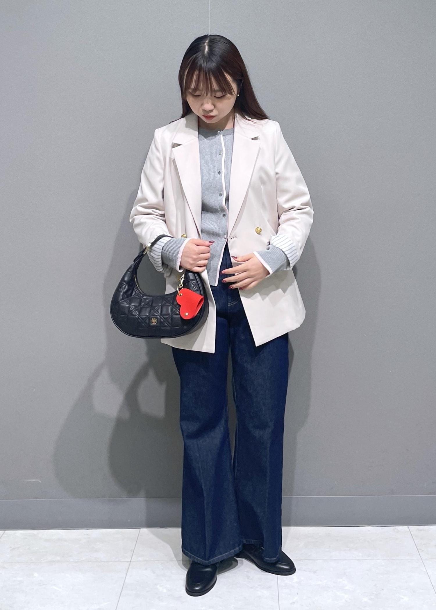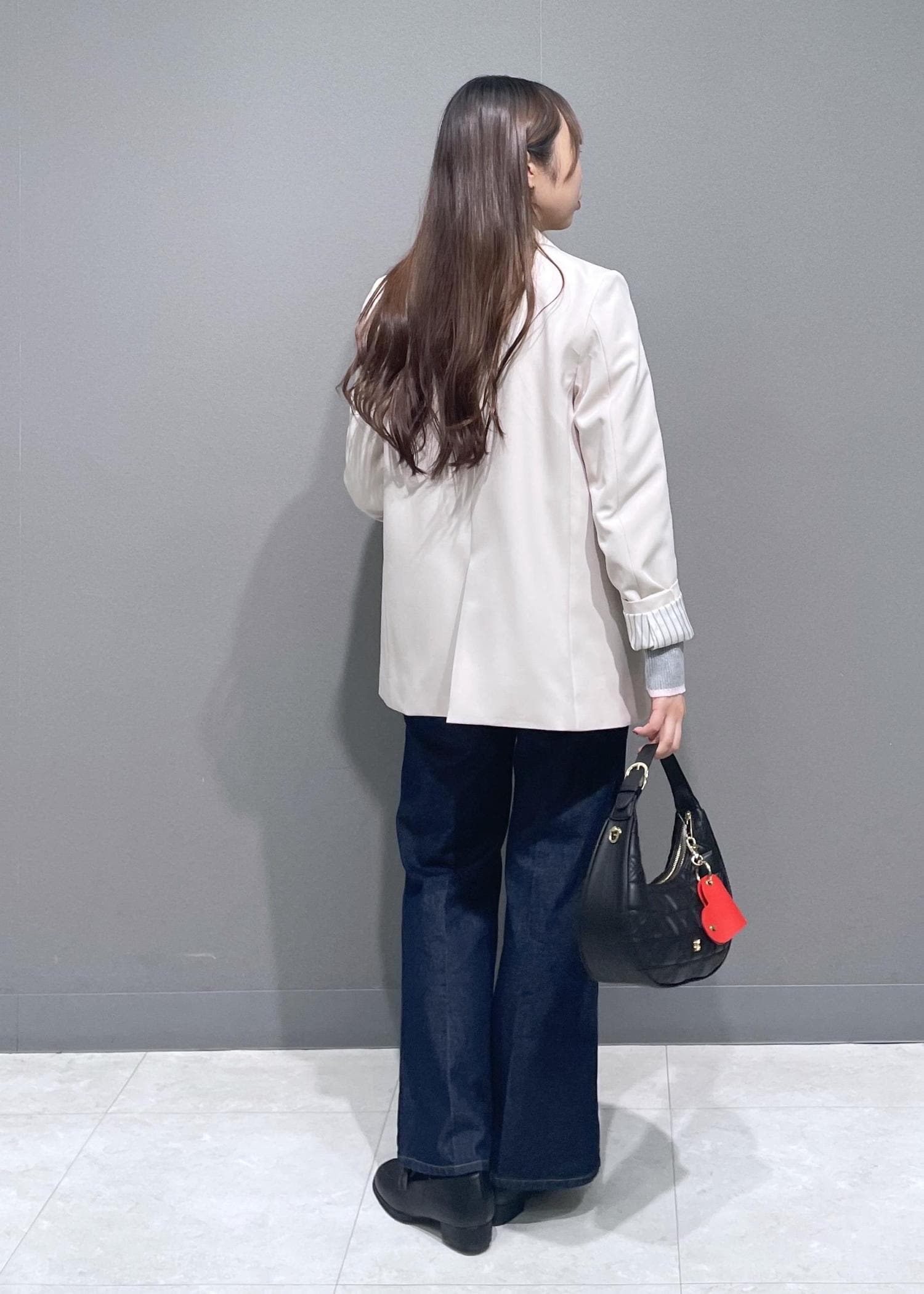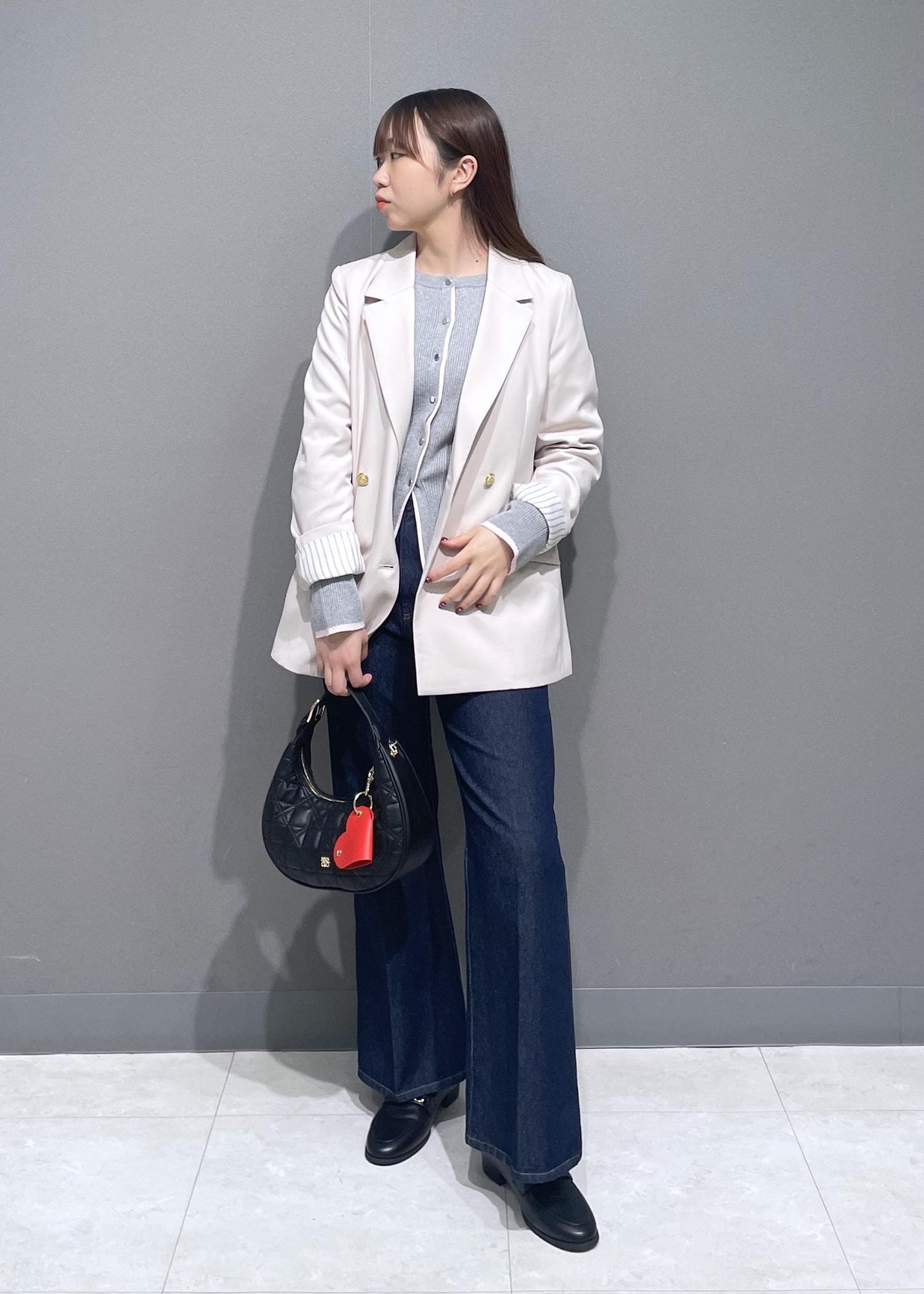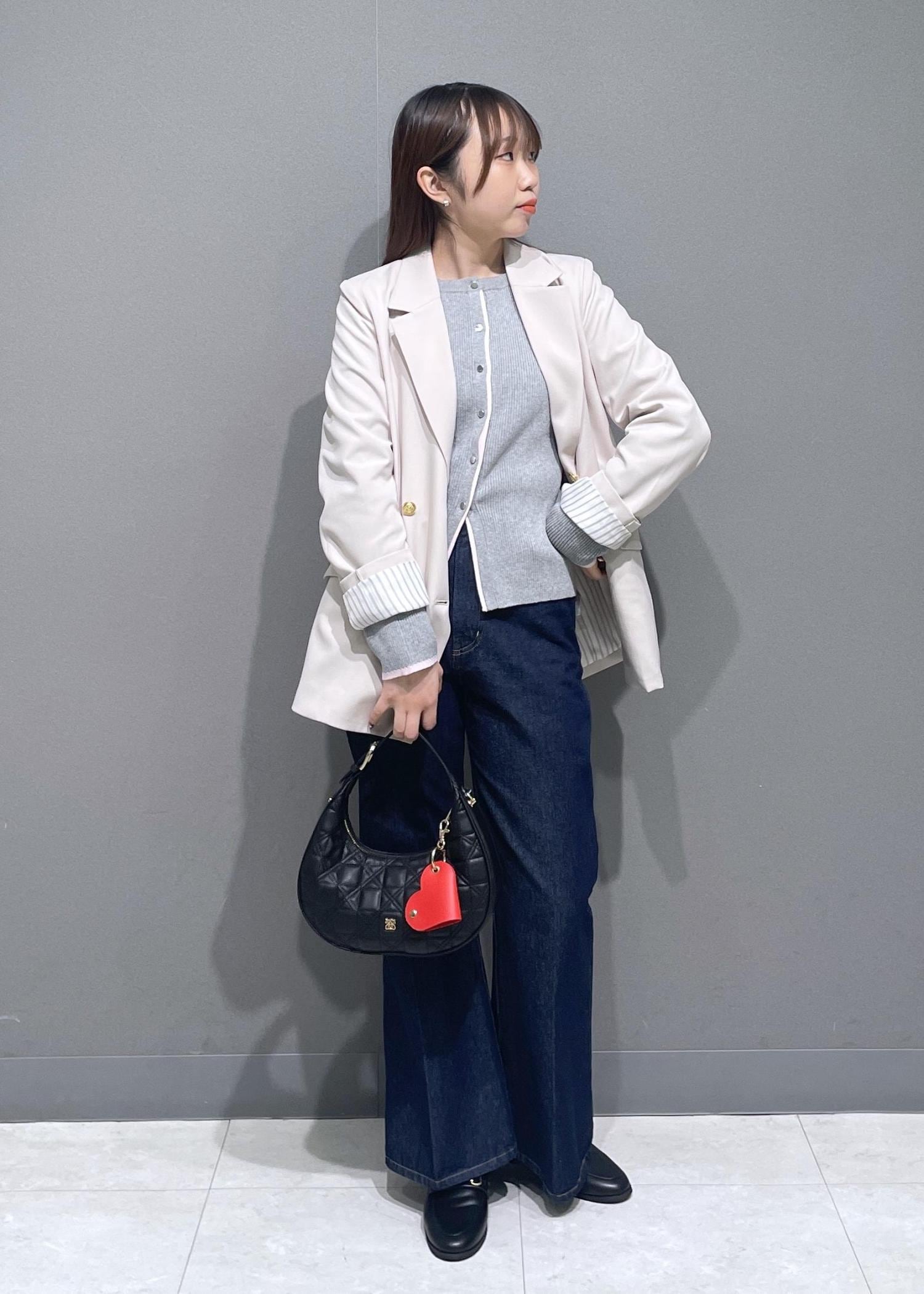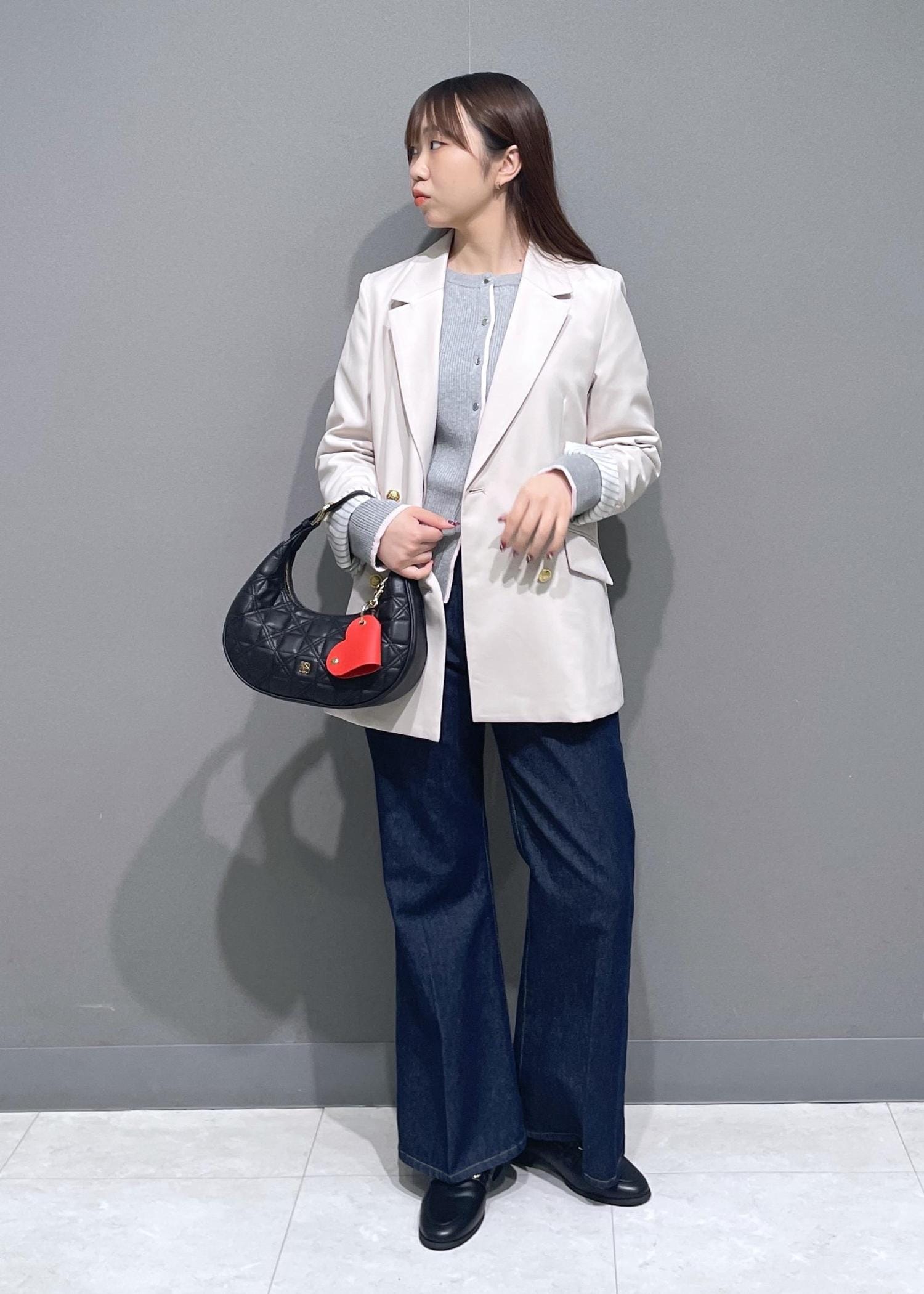 通年使いやすい生地感で、金ボタンがアクセントになります。丈は気持ち長めに設定されており、162cm Mサイズ着用でおしりが隠れる丈感です。 -