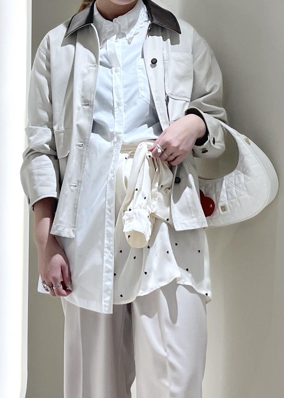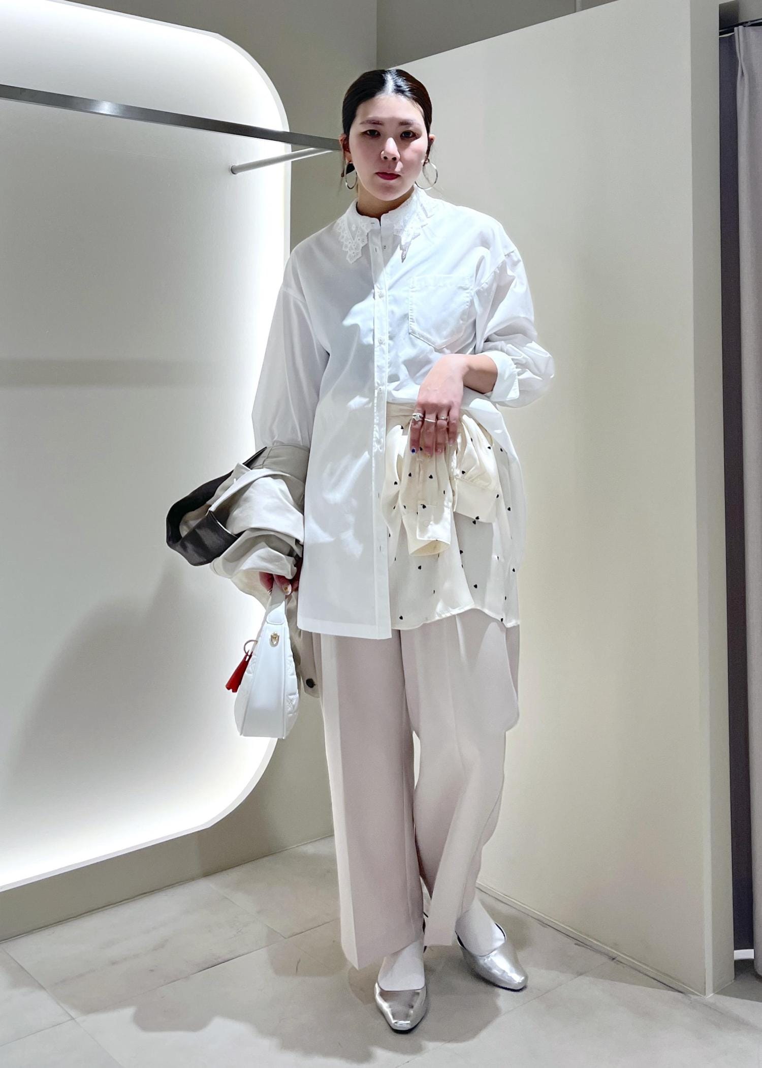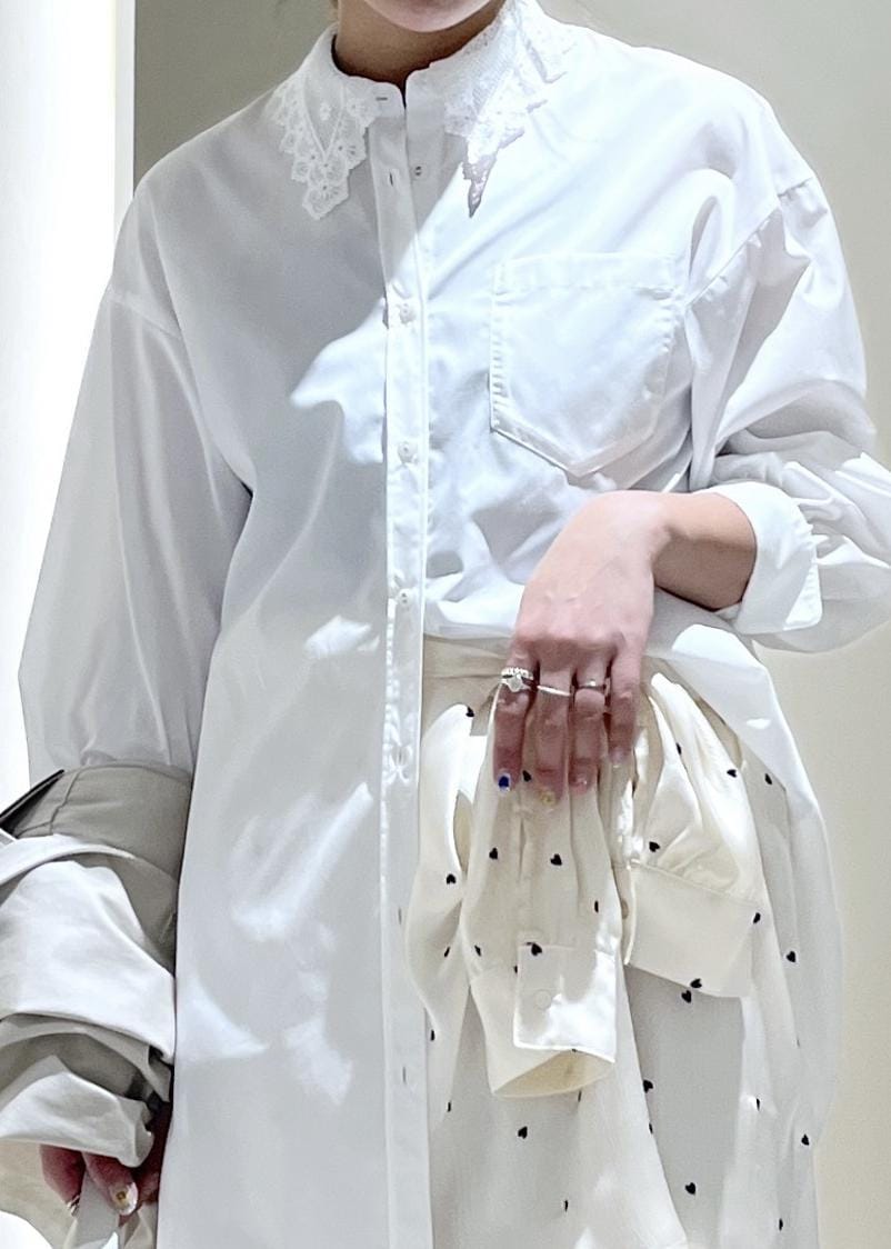 襟レースが可愛いシャツワンピースはパンツ合わせが高身長にはイイ感じ!!ポイントにハート刺繍ブラウス巻いちゃったりアレンジは無限♪
