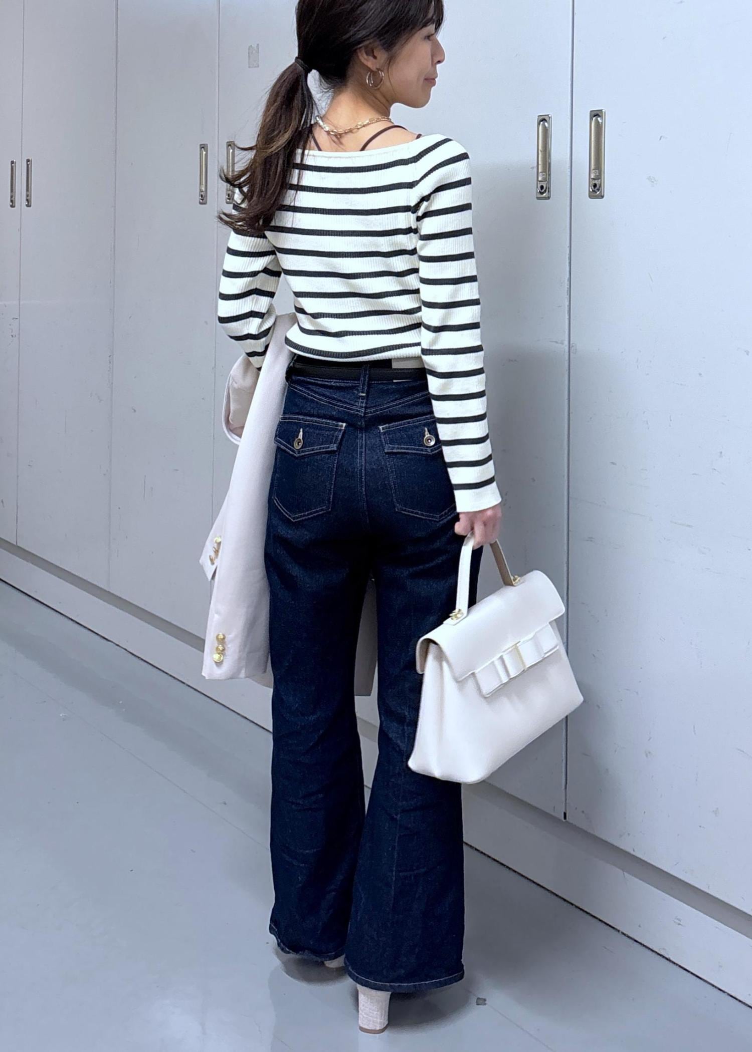 VISフレアシルエットデニムパンツネイビー / S¥8,899レビュー156cm/S着用。ウエストはトップスをインしてジャストで、着丈は靴を履いて床にあたらないくらいです!腰骨の辺りはほどよくゆとりがありインスタイルも綺麗に着られます◎少しかための素材でストレッチは効いてないですが、履くと馴染み着心地よいです‼︎