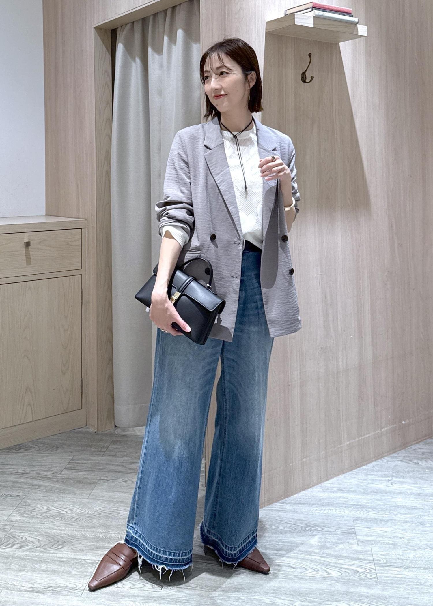 襟付きトップス、ブラウンバック、シフォンヘアクリップを使い、キレイめカジュアルのバランスを意識しました!