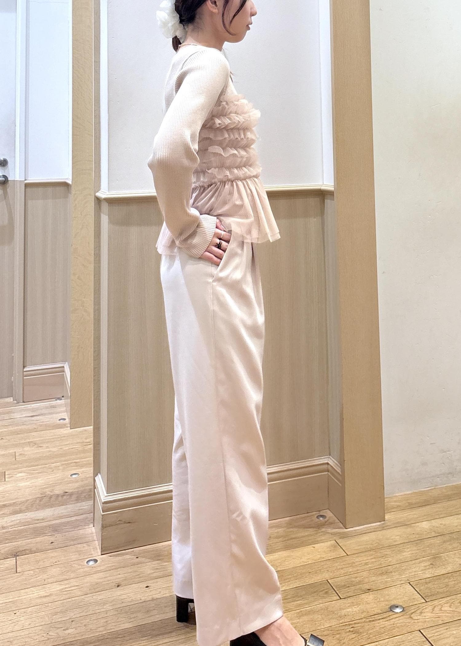 長さもかかとにつかないくらいなので、綺麗めなワイドパンツとしての着用にぴったりです。 -