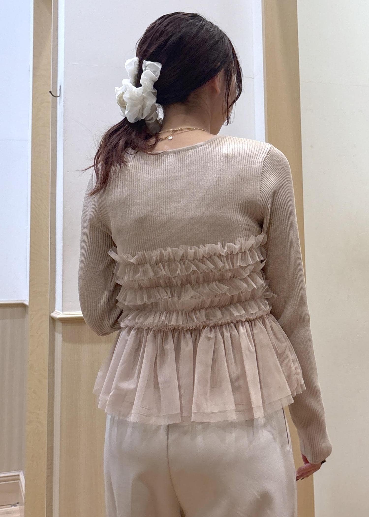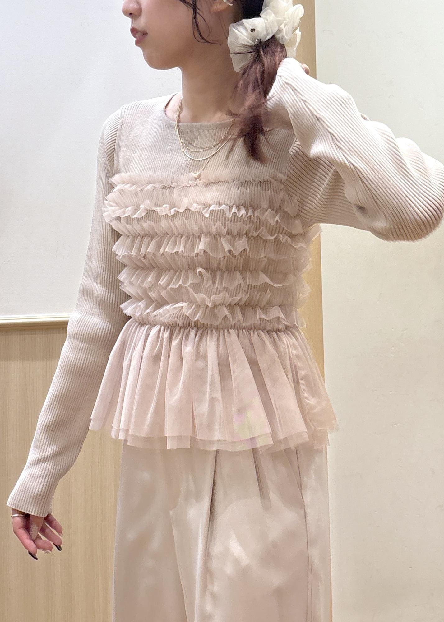 VISチュールフリルドッキングニット/イージーケアベージュ / F¥6,589レビューチュールが特徴的なデザイントップスです。裾のニット部分はインすることも、アウトでもチュールからはみ出ることはなく着用できました。