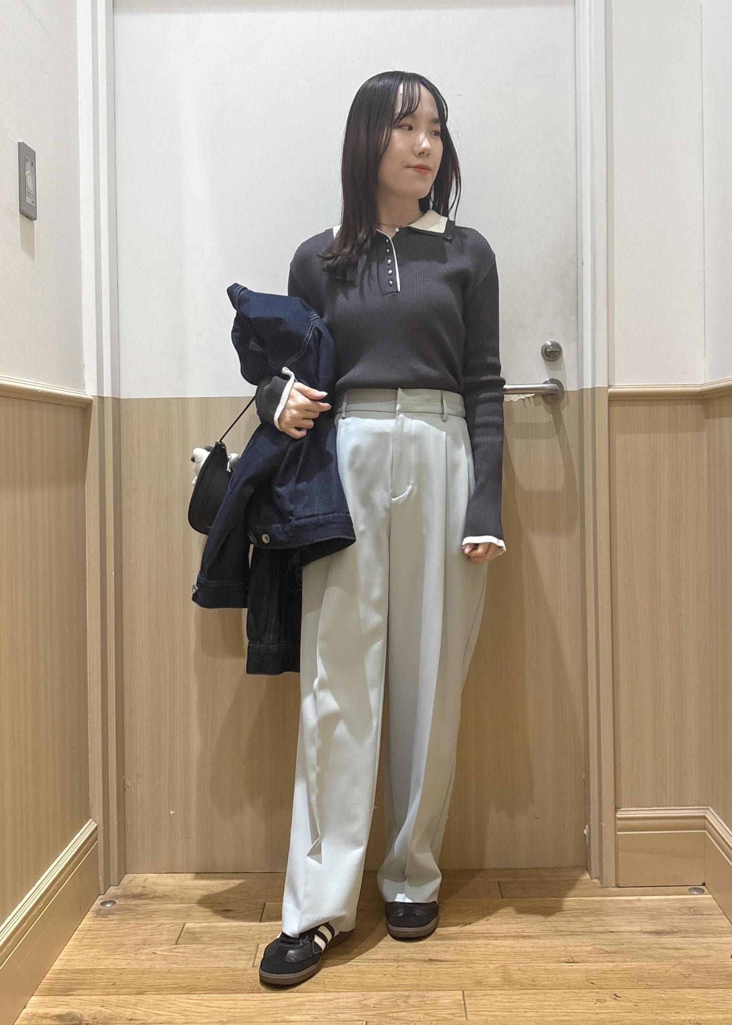 着用しているチャコールは透けがないのと、襟ぐりが開いていないので、インナーを気にしなくても着れるのが◎ -