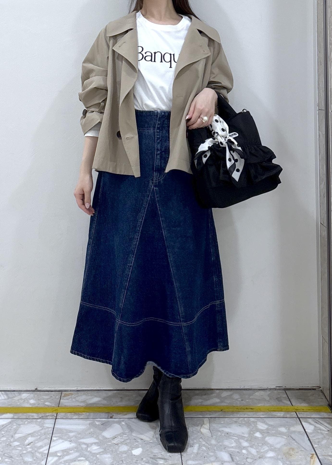 ドット柄とモノトーンの配色がコーディネートのアクセントになります¨̮⃝