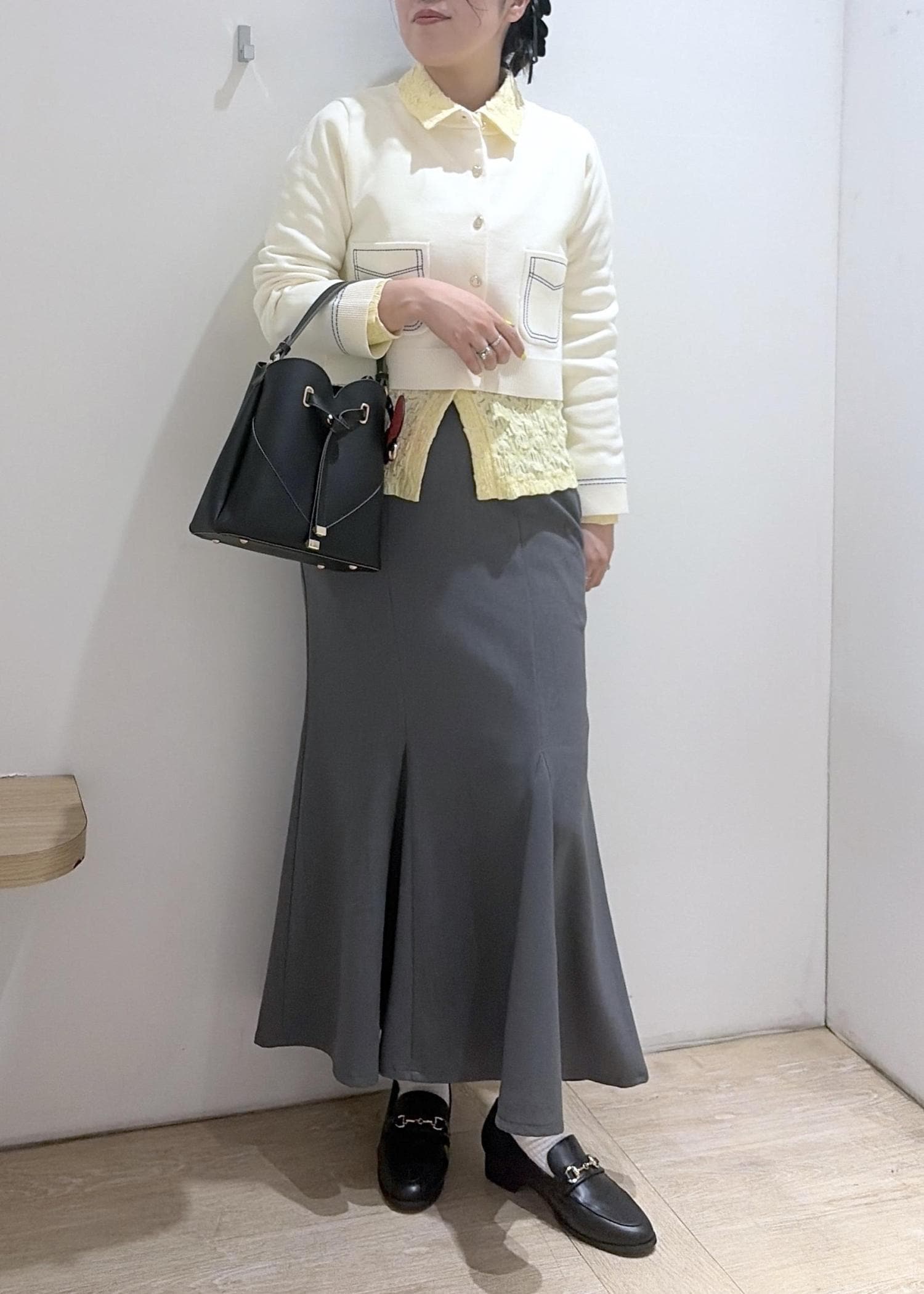 イエローのカーディガンをレイヤードさせて