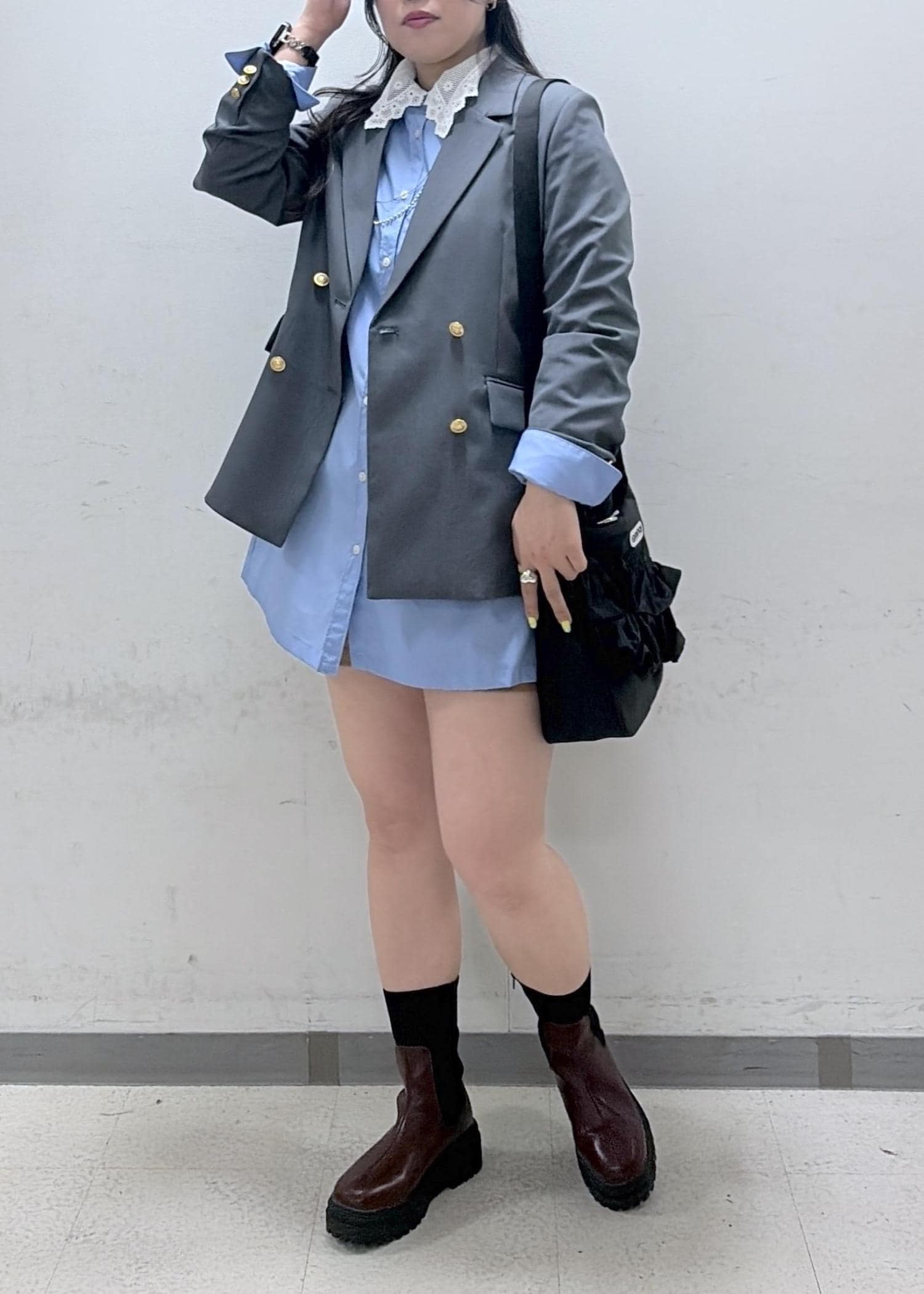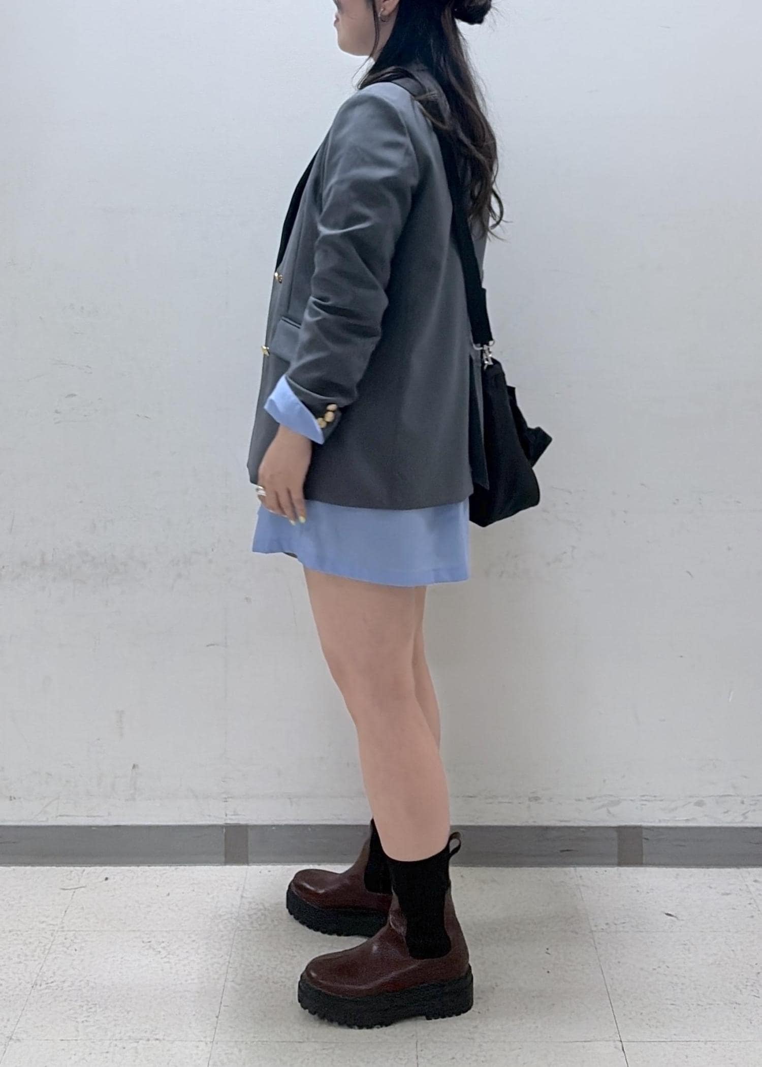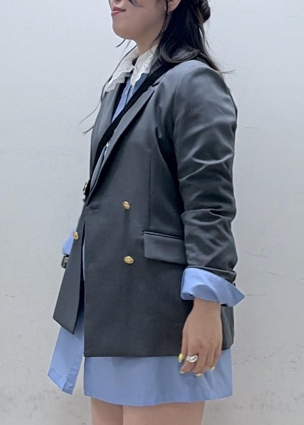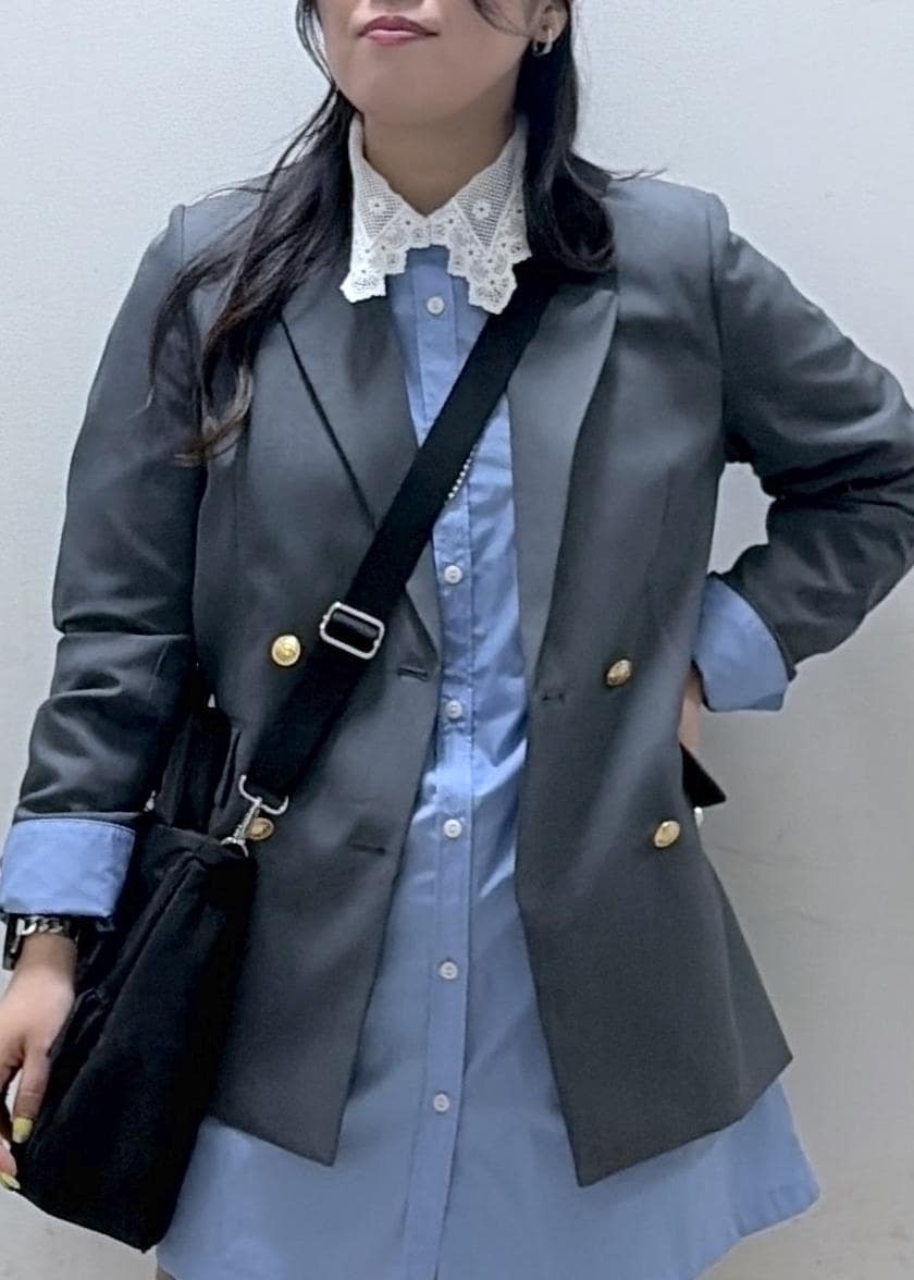 168cmでヒップが隠れる長さですが、肩の切り替えがジャストの位置にくるので、カジュアルでもきちんとしたスタイルでも合わせやすいです。 -