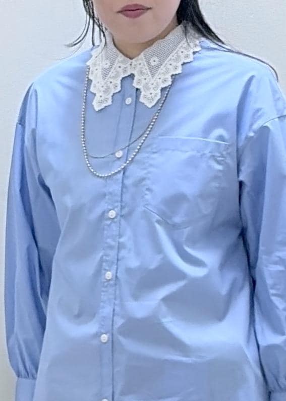 VIS襟レース付きミニ丈シャツワンピサックス / F¥7,689レビュー168cmで太ももが3分の1ほど隠れました。