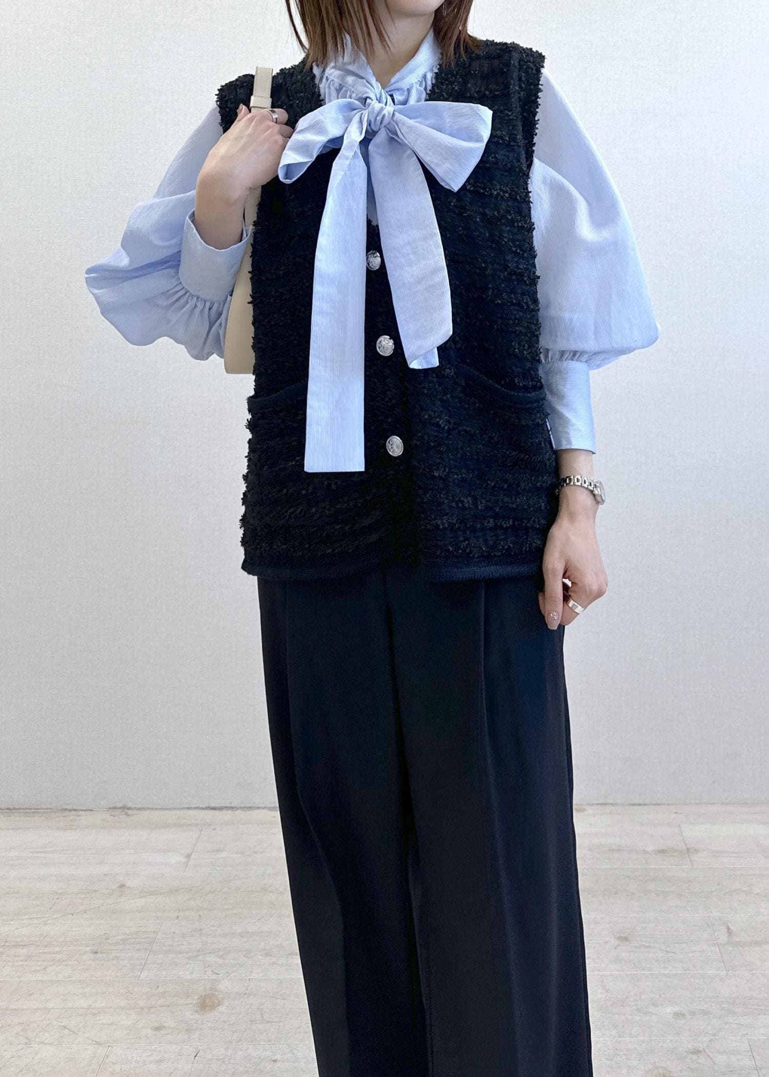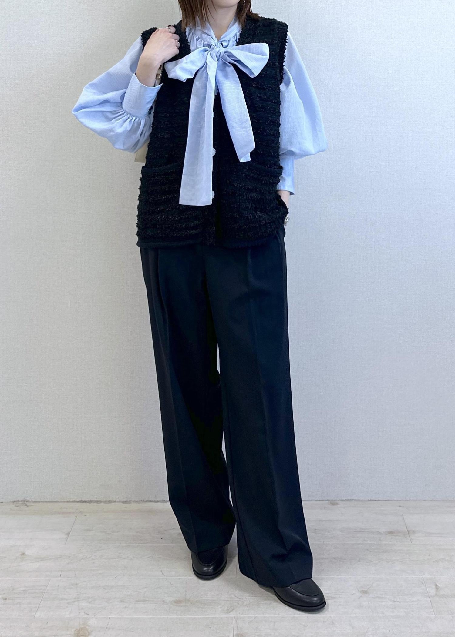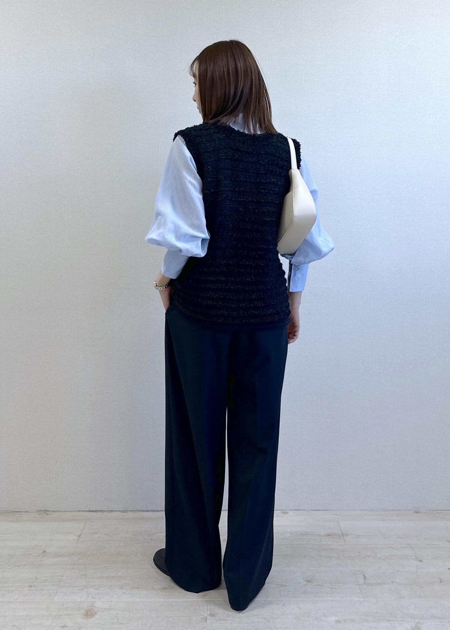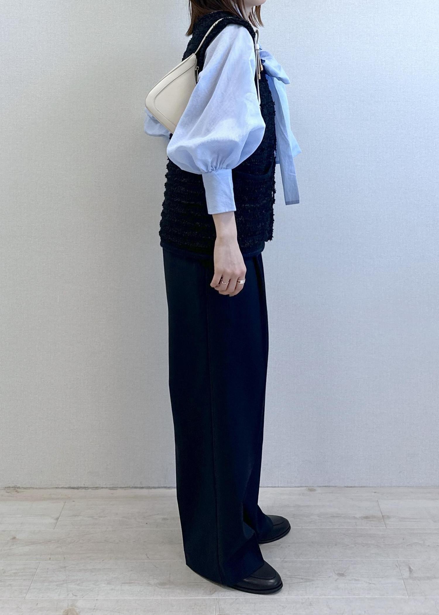 程よいゆとりがあるので、シャツやブラウスなどのインナーも合わせやすいです! -