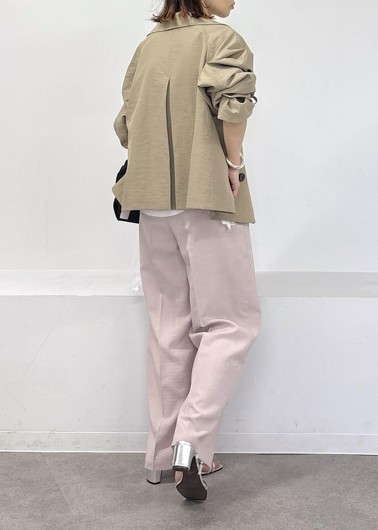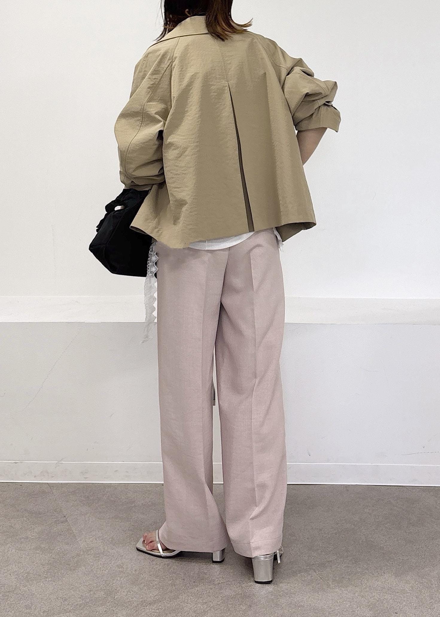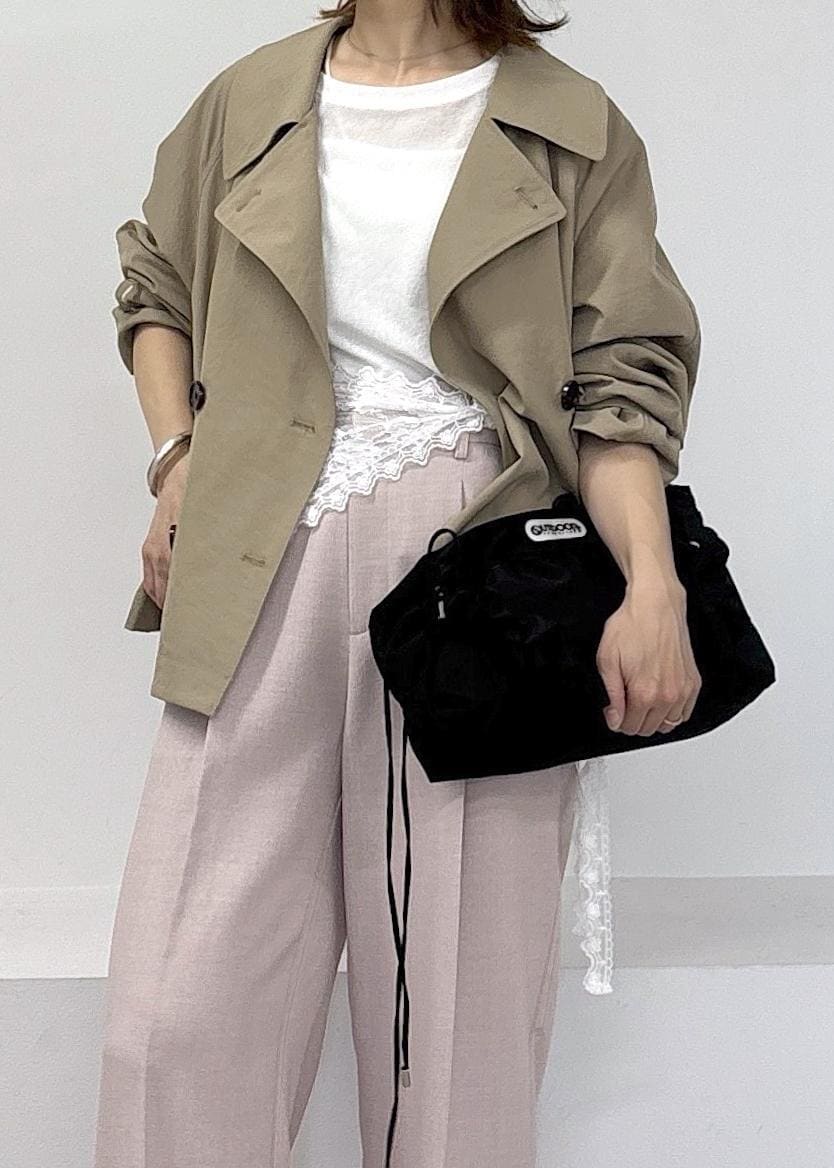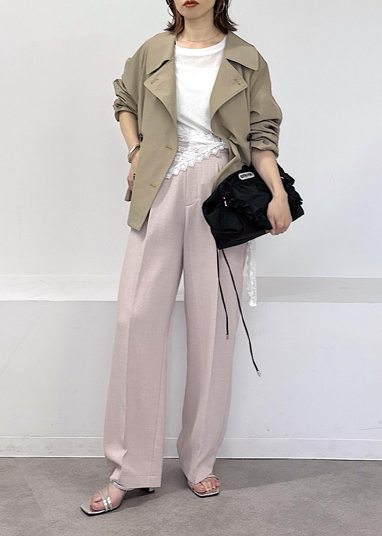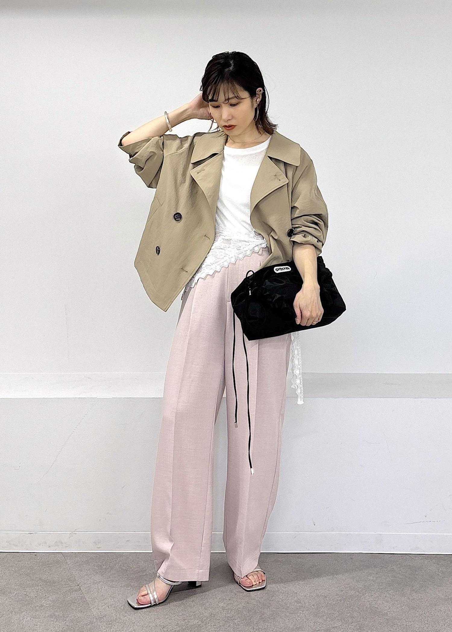 春らしいショートトレンチをメインに、シアートップス、ピンクのワイドパンツで合わせた淡色スタイル♪優しい色合わせとトレンドのレースアイテムはスカーフを選び、腰にさらっと巻くだけで今年っぽい◎春のお出かけにぴったりな大人カジュアルコーデ。