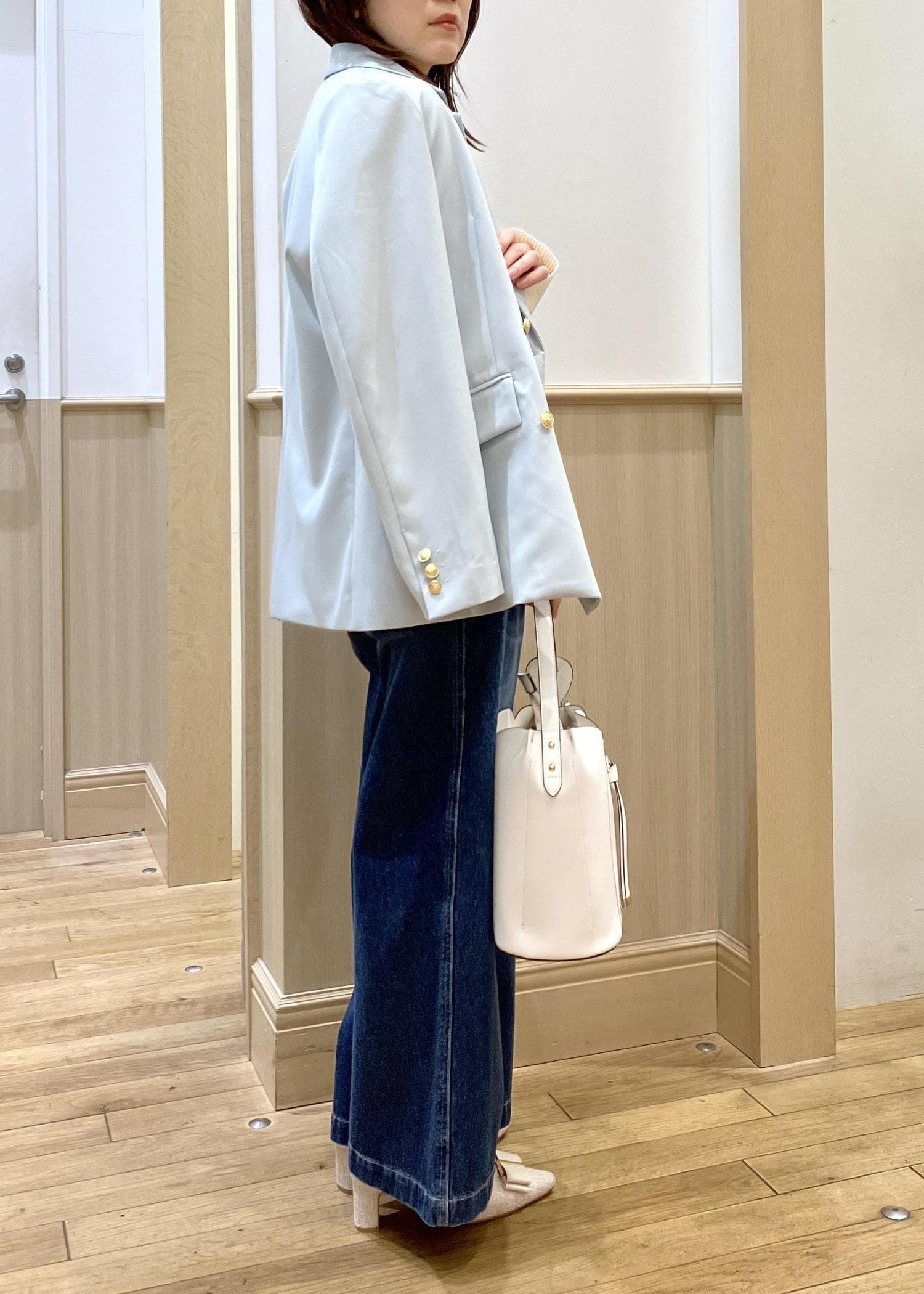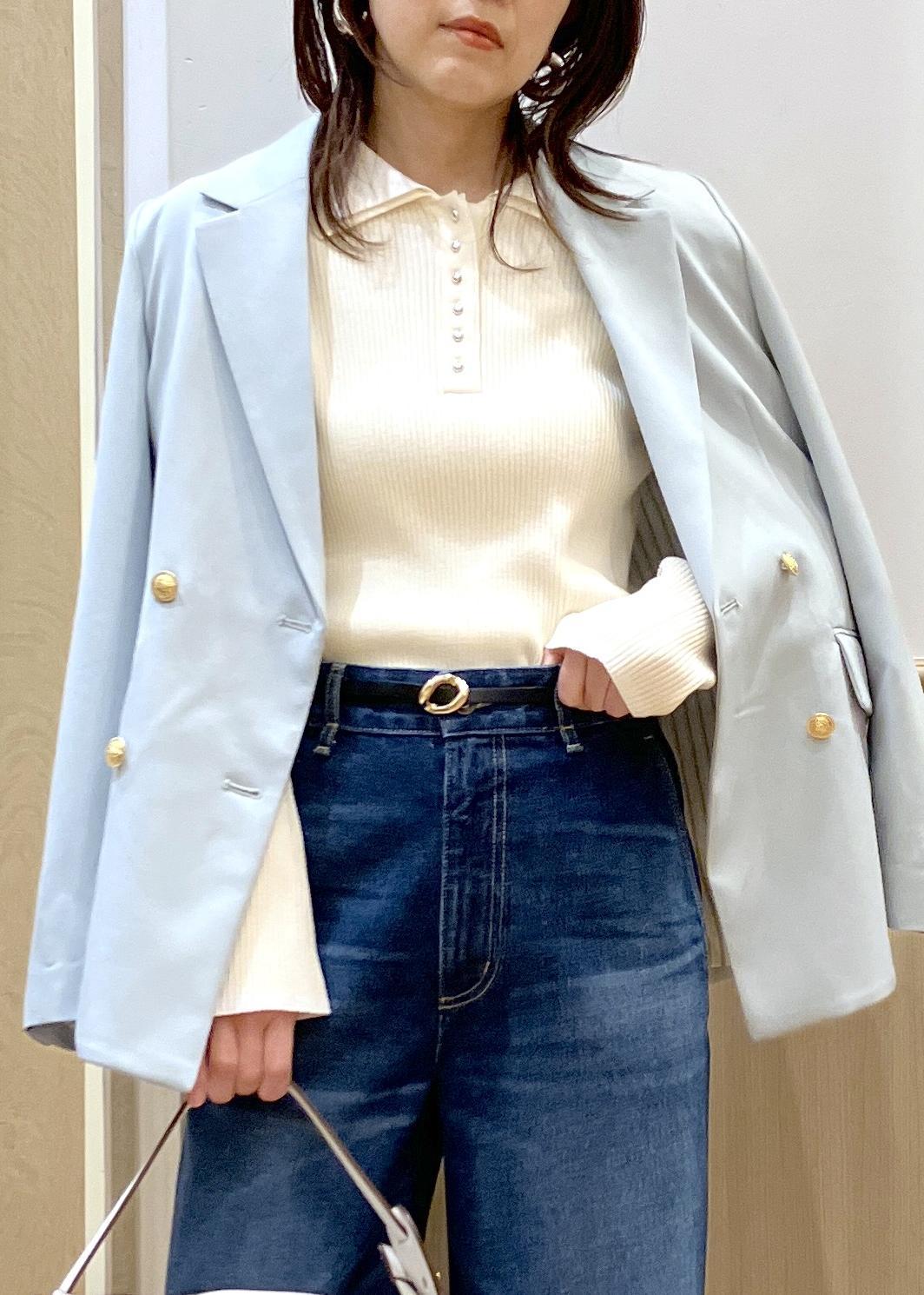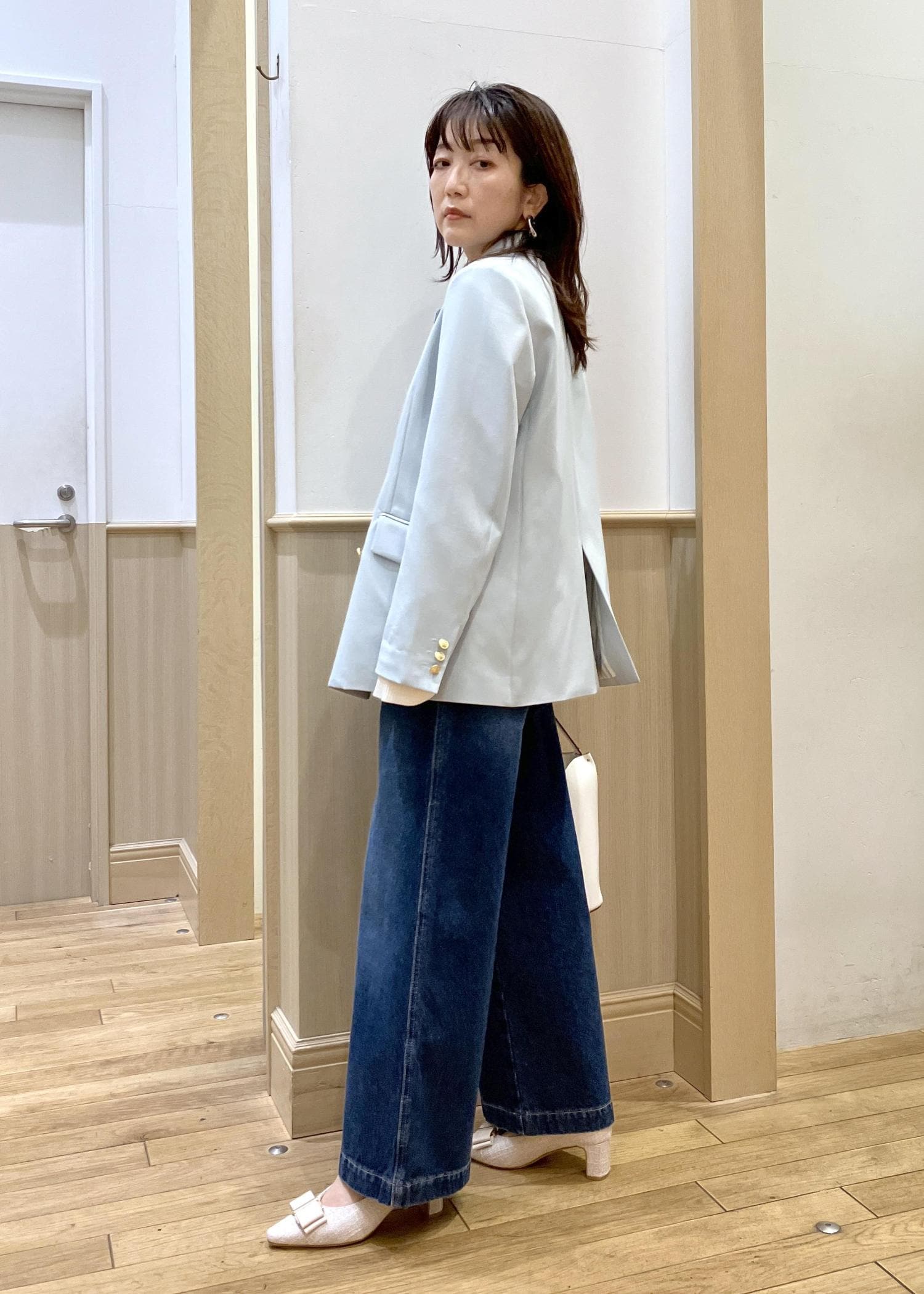 綺麗なライトグリーンが印象的なジャケットをメインにトレンドのダブル襟のニットとデニムでスッキリ合わせてみました。bagとパンプスを白でまとめて爽やかさもプラスしてます。