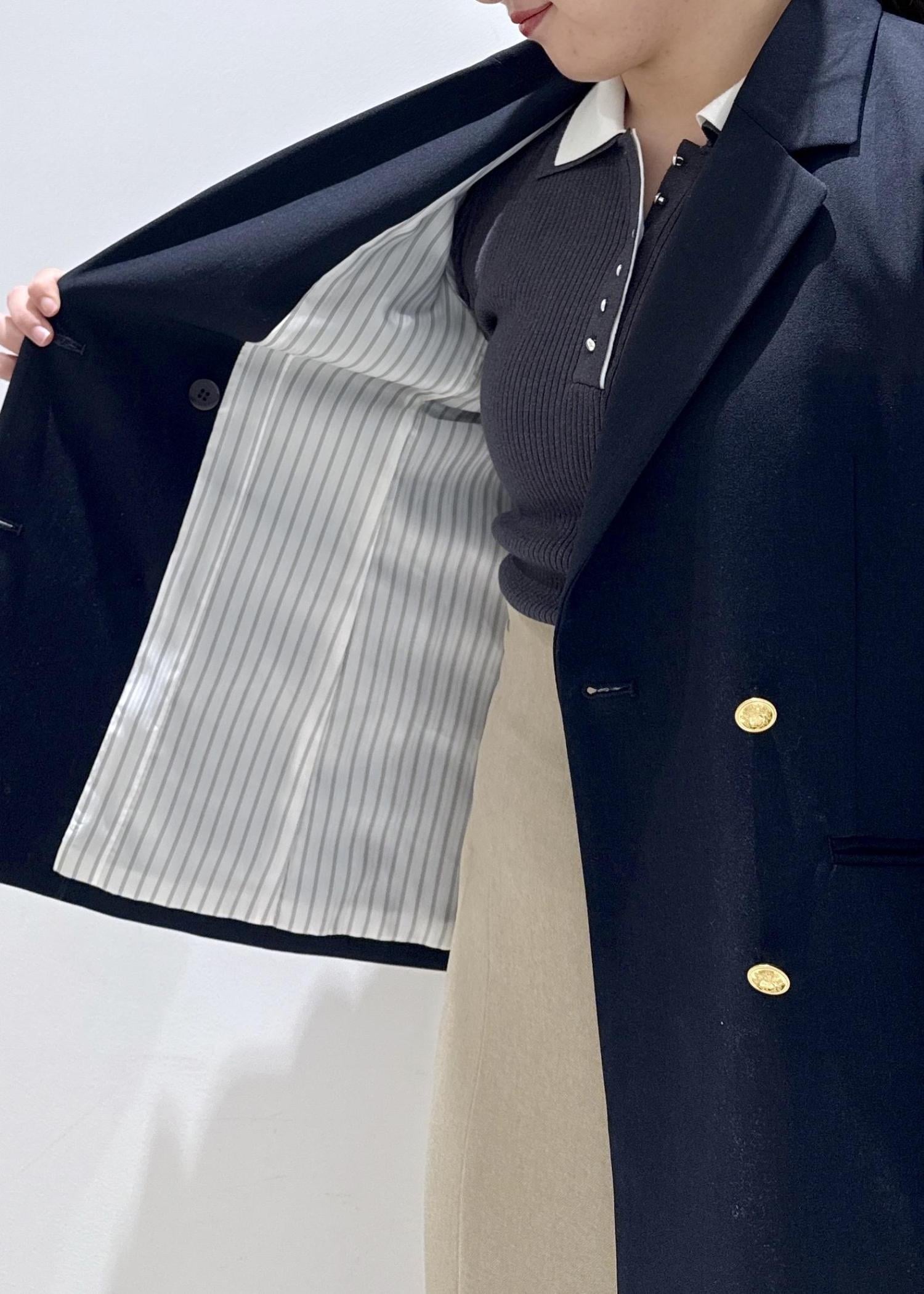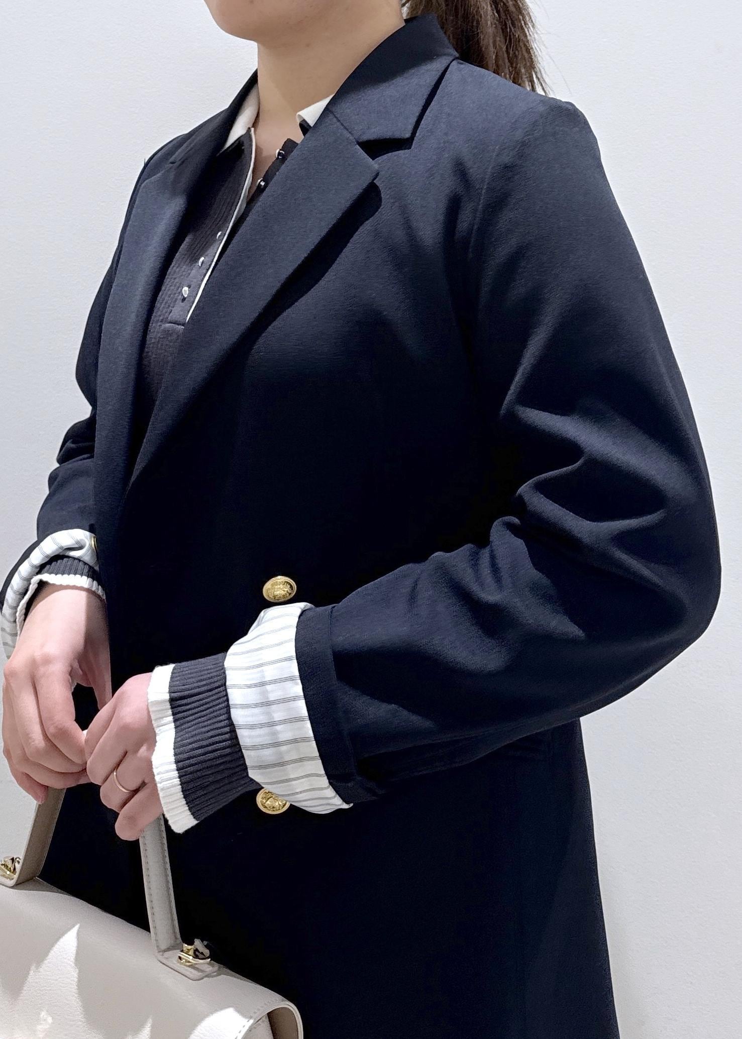 身長157cmでお尻がちょうど隠れるぐらいのゆったりとしたデザイン。ストライプ柄の裏地付きなので、お袖を捲っても抜け感が出て可愛いです。春のデザインなのでメタルボタンで華やかな印象に!洗濯可能、シワにもなりにくいので毎日愛用しています。 -