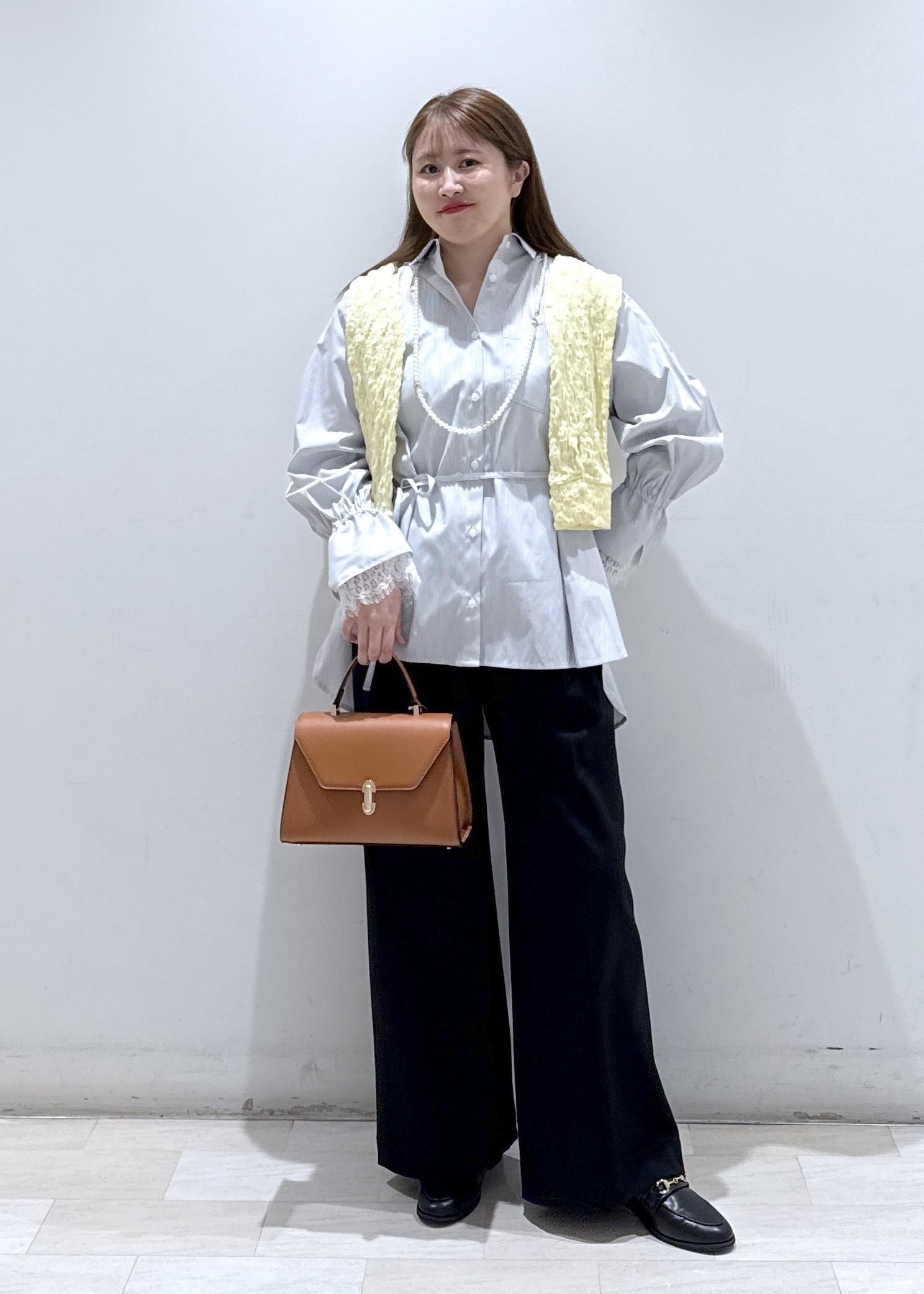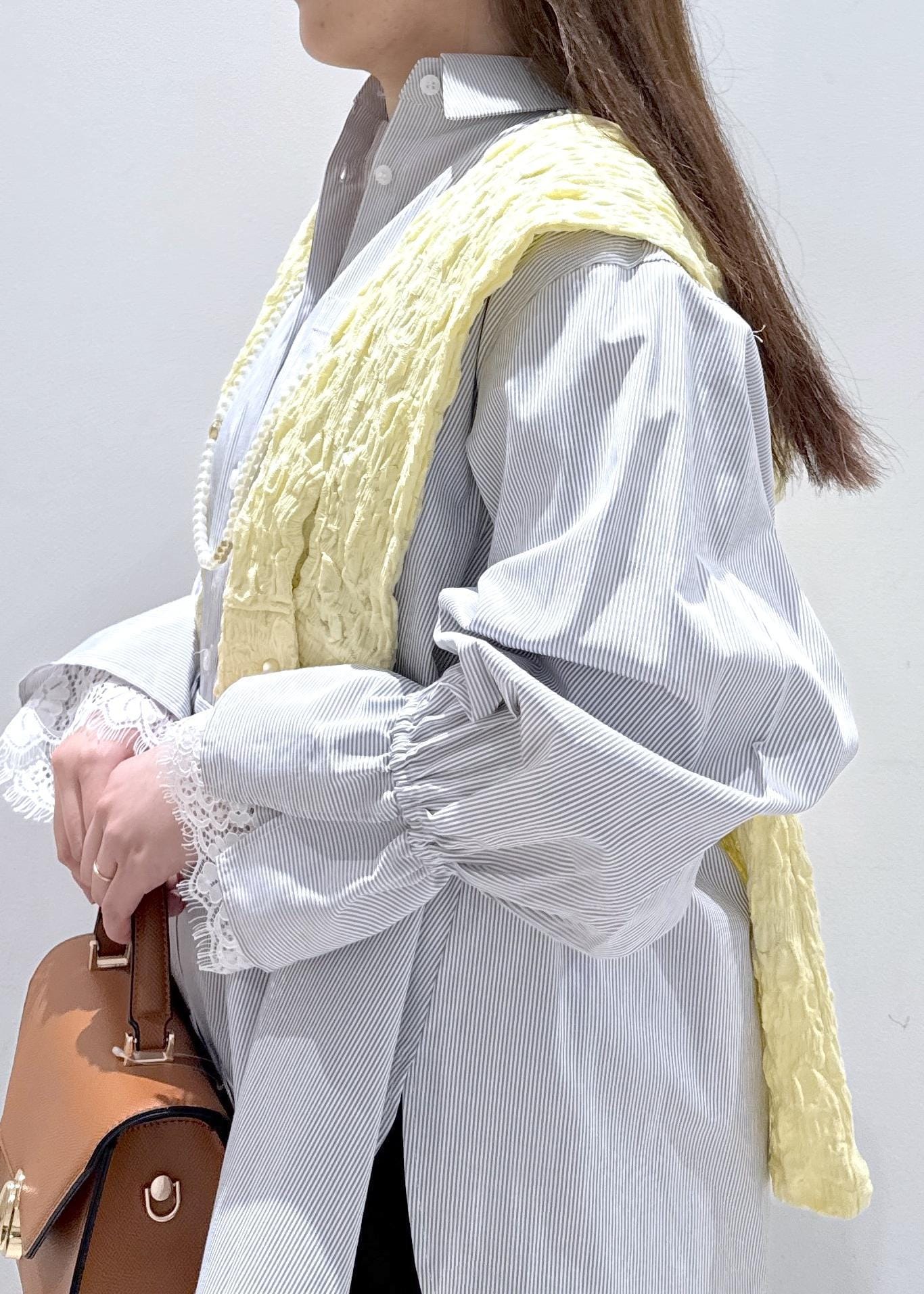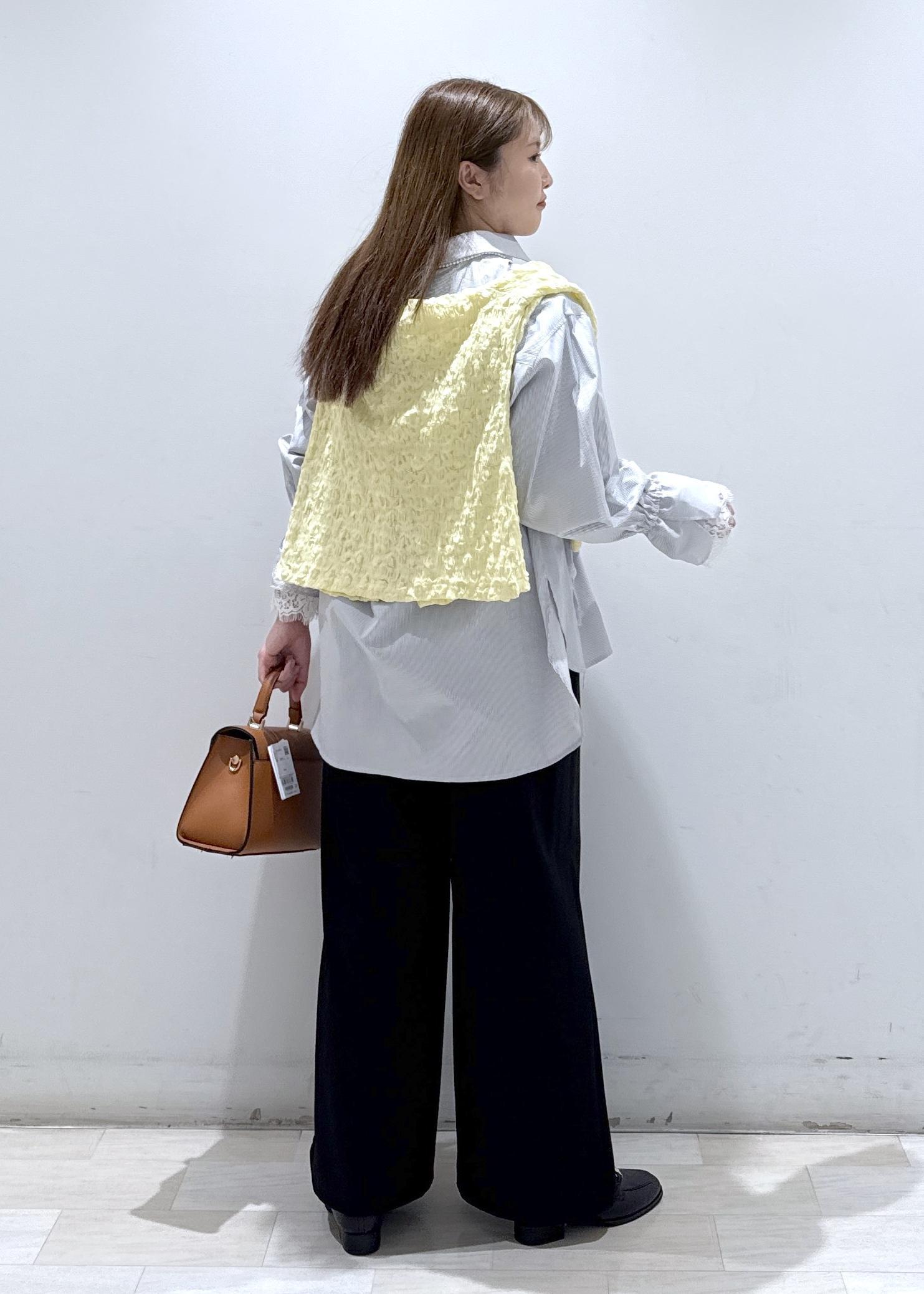 今回は新作で入荷しました、襟元がドッキングでレース素材でつくられているストライプ柄のシャツに、ワイドパンツと合わせてカジュアルなコーディネートにしてみました。これから春先に向けて黄色のカーディガンを差し色をポイントに◎